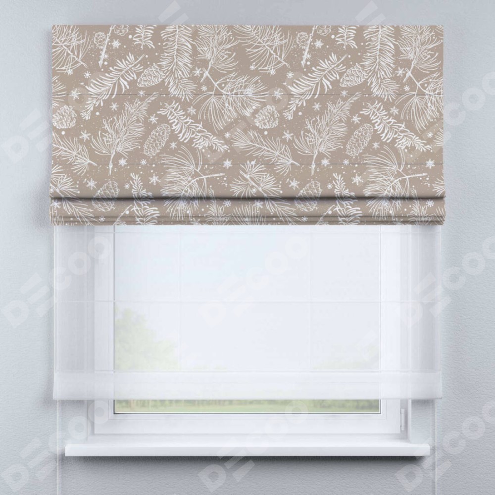 Римская штора день-ночь производителя «Cortin», используется для проёма, пошита из двух полотен, с лицевой блэкаут с нанесением сублимационной печати «Заснеженный лес», вторая ткань тюль (по стандарту комплектуется тюль белого цвета артикул V-01). Имеет универсальный механизм и подходит для монтажа: на потолок, на стену и в нишу.