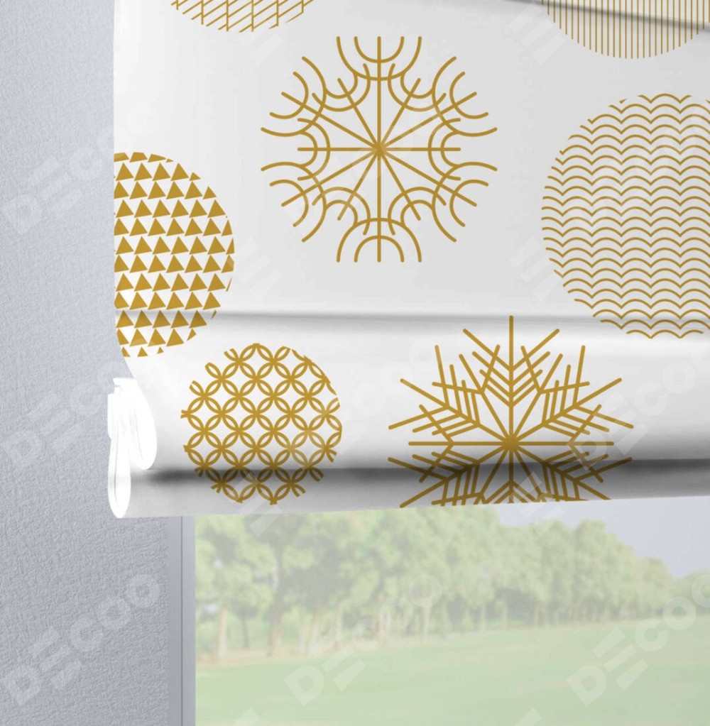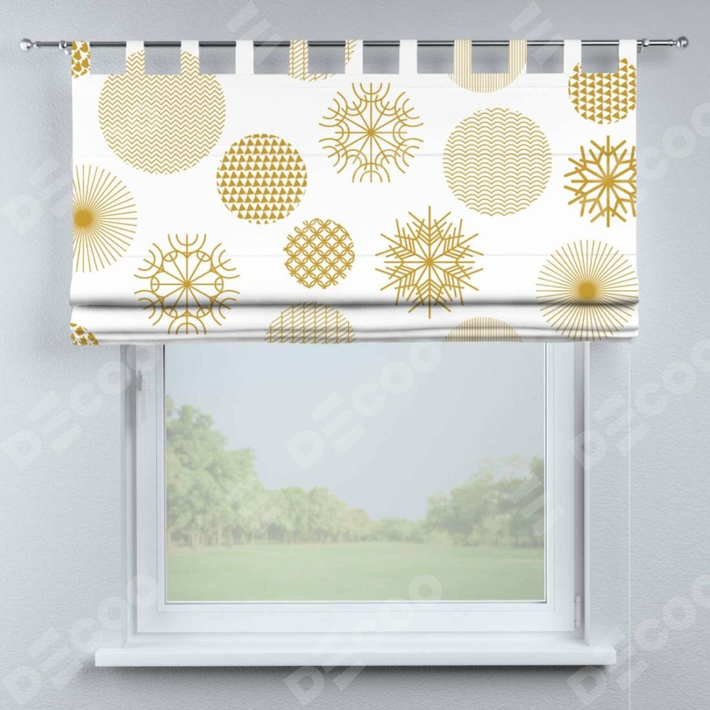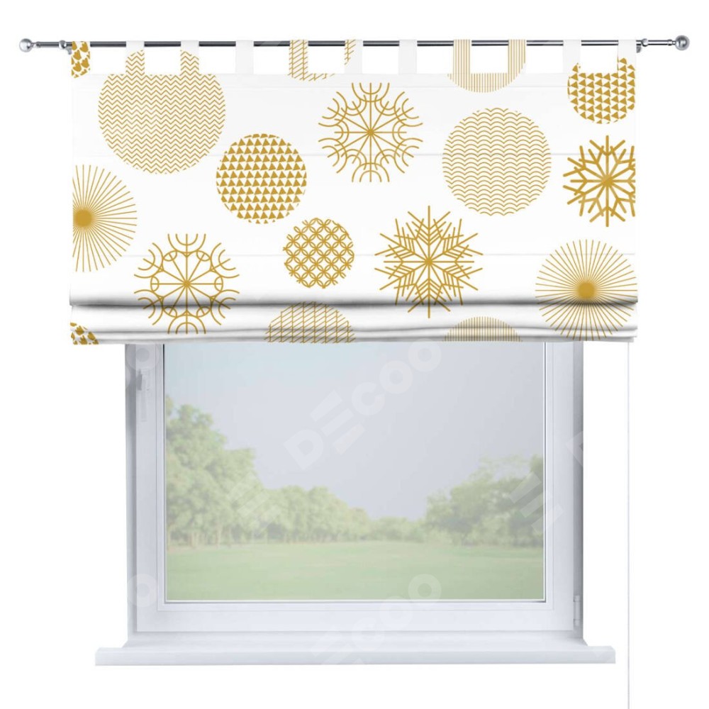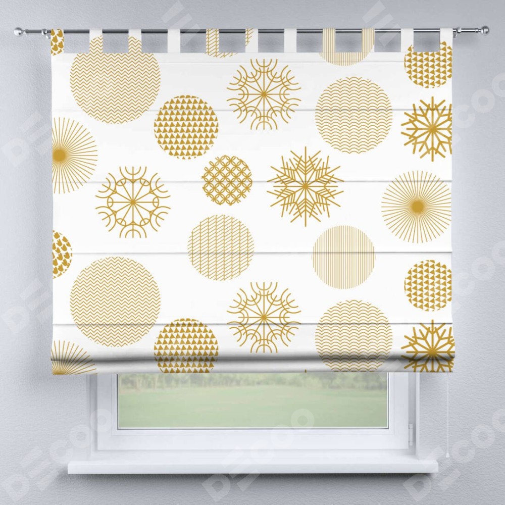 Римская штора производителя «Cortin», используется для проёма, пошита из ткани блэкаут с нанесением сублимационной печати «Золотые шары». Данная модель пошита на петлях, комплектуется на выбор круглым карнизом и подходит для монтажа на стену. Римская штора на петлях имеет простую систему регулировки высоты, отличительным преимуществом данной модели является простой способ монтажа. Достаточно повесить ее на трубу и штора готова!