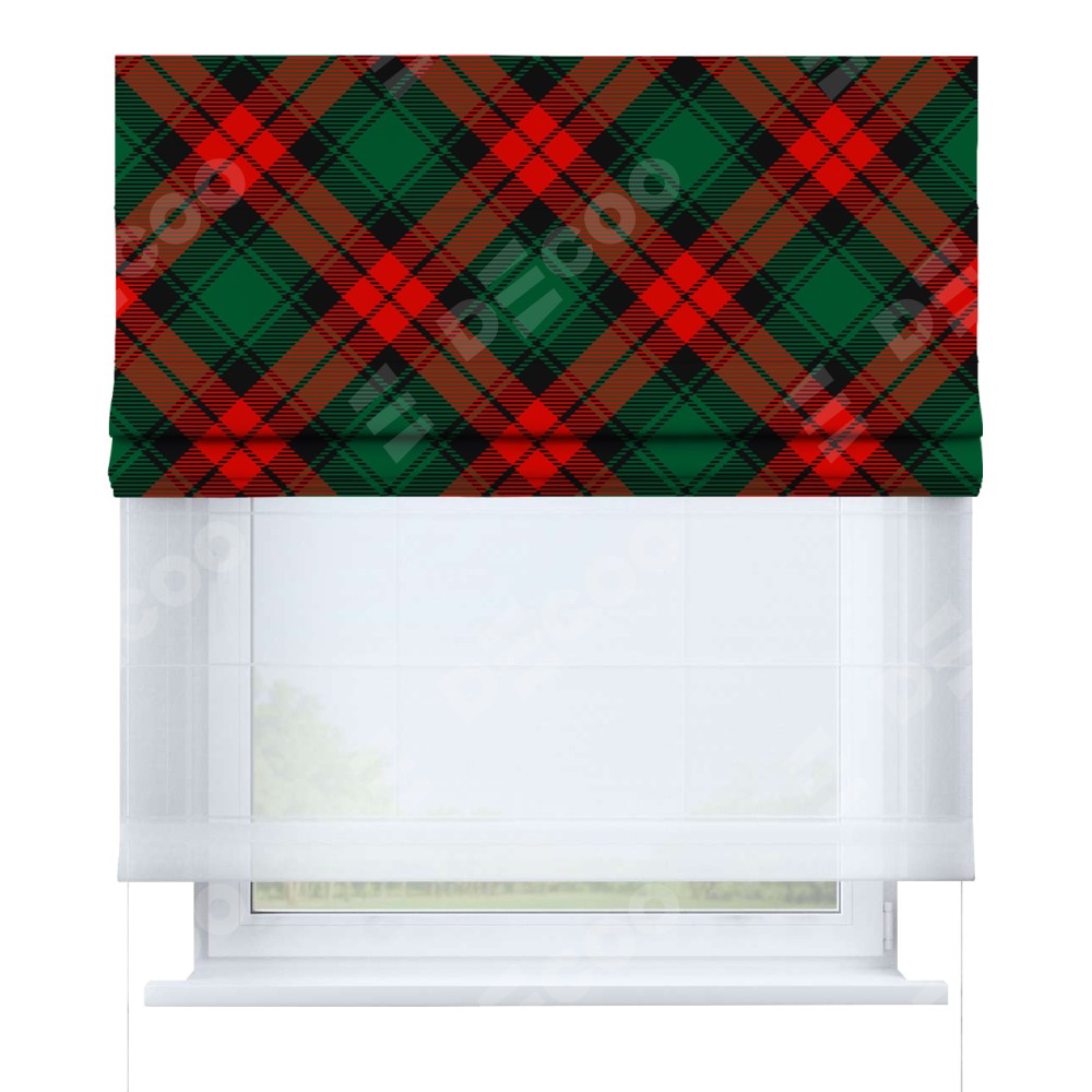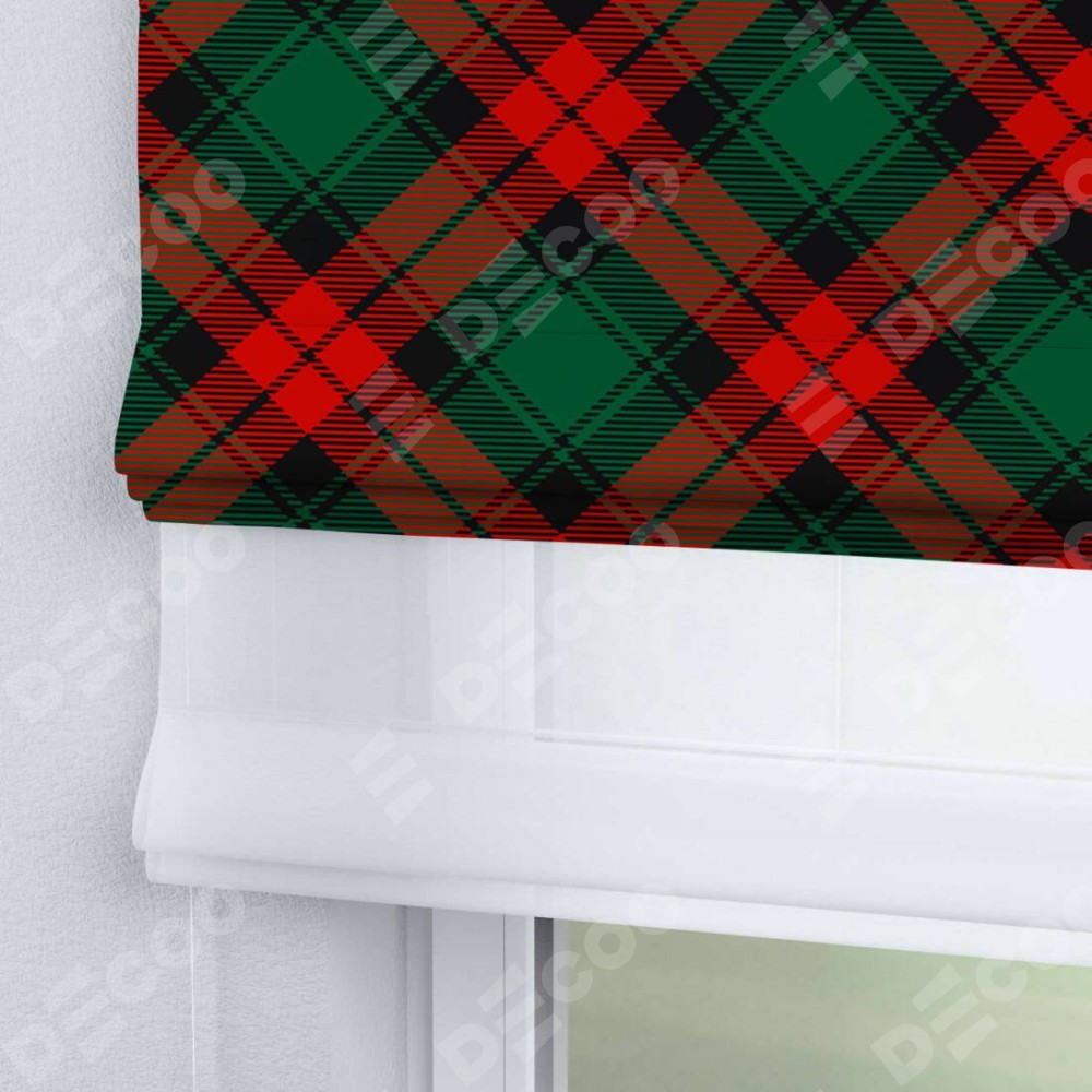 Римская штора день-ночь производителя «Cortin», используется для проёма, пошита из двух полотен, с лицевой блэкаут с нанесением сублимационной печати «Красно-зелёная клетка», вторая ткань тюль (по стандарту комплектуется тюль белого цвета артикул V-01). Имеет универсальный механизм и подходит для монтажа: на потолок, на стену и в нишу.