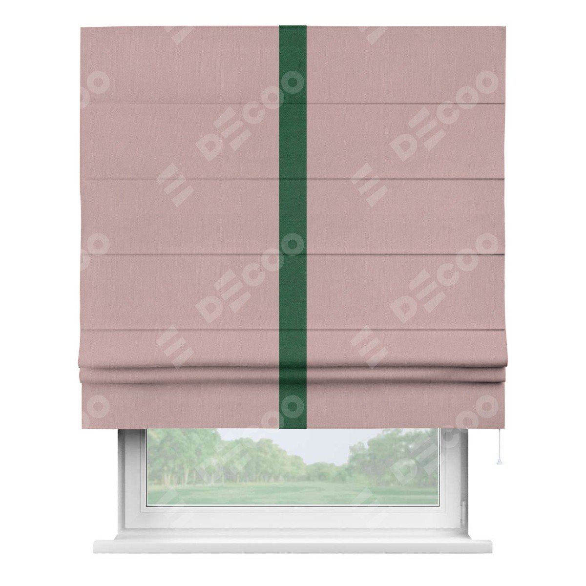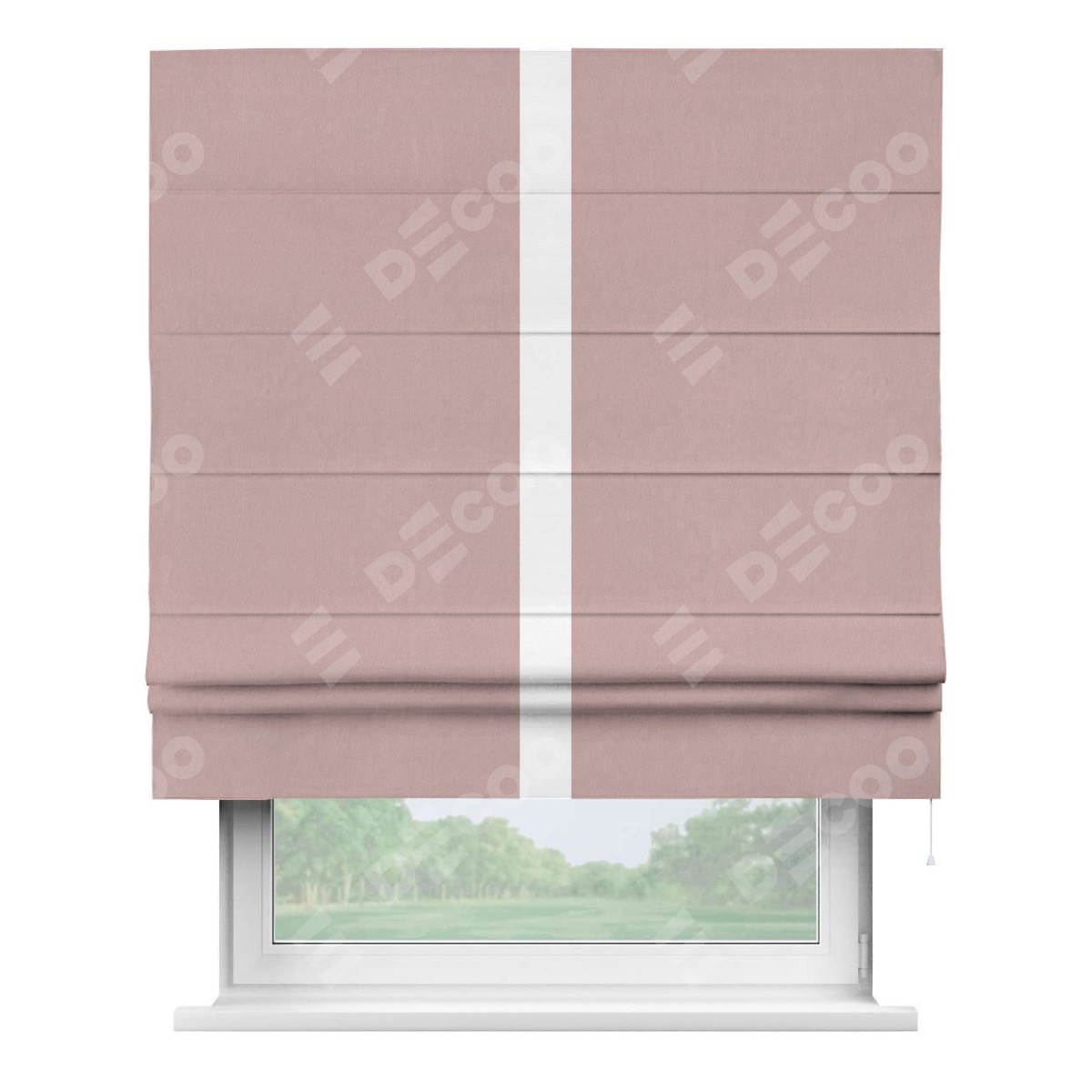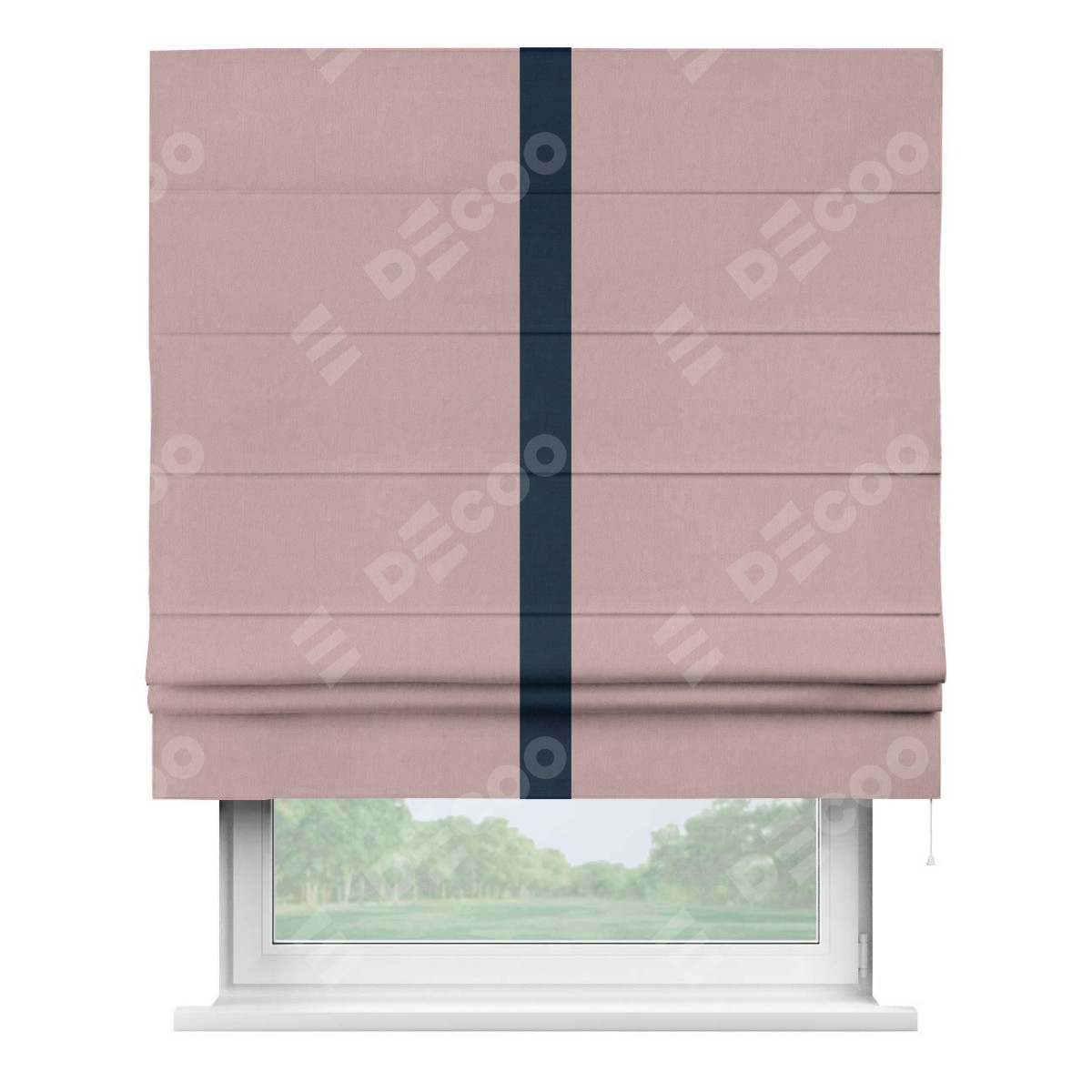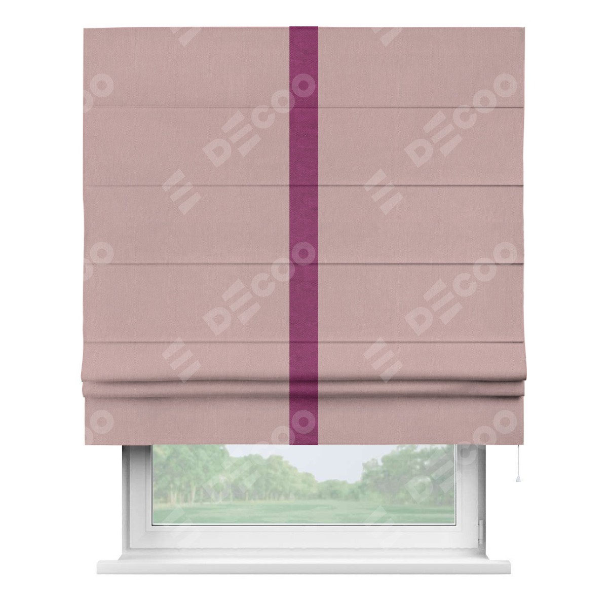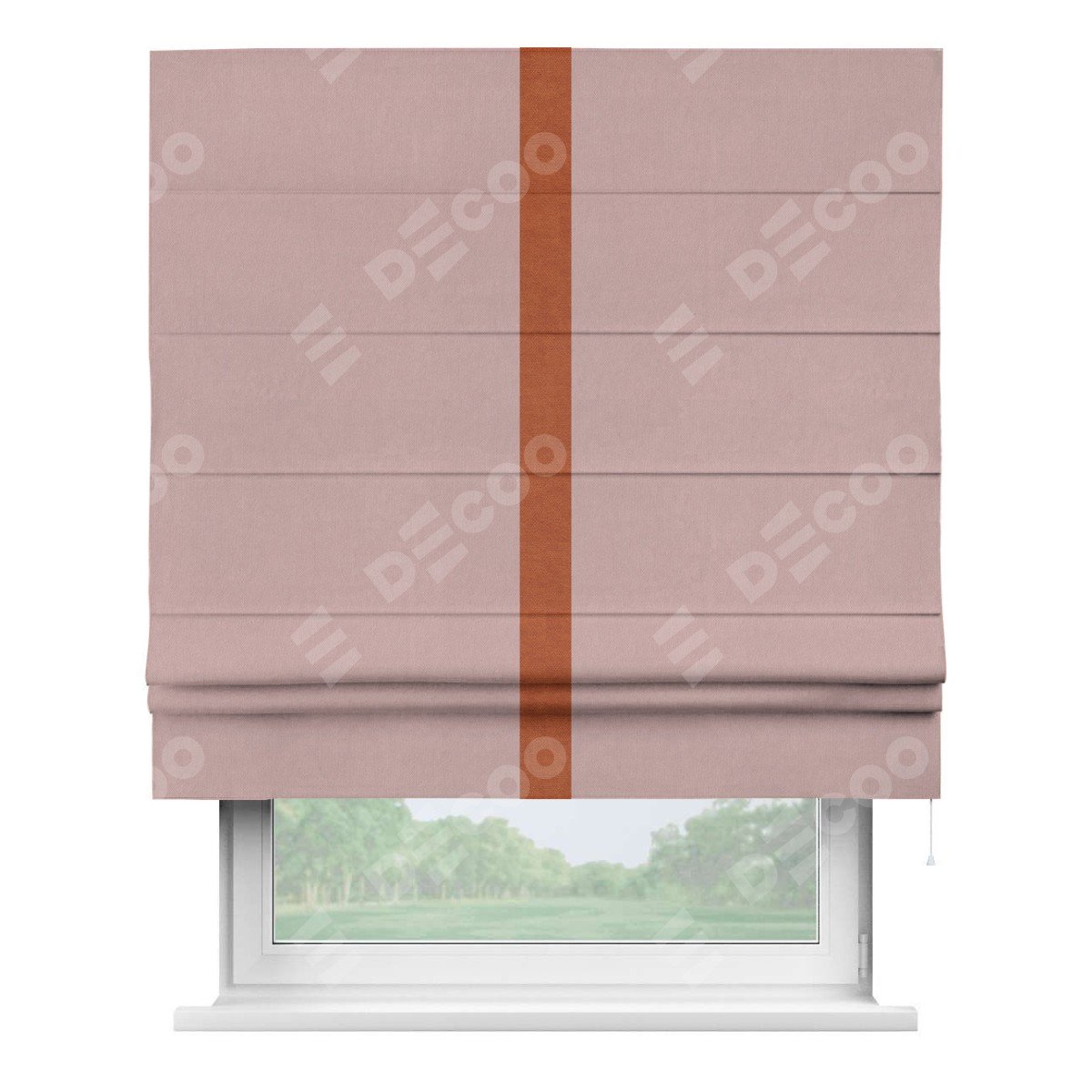 Римская штора производителя «Cortin», используется для проёма, пошита из ткани вельвет розовая пудра, артикул ткани 14132. Отделка шторы кантом «Хайвей», ткань для канта используется из вельвета разной расцветки на выбор. Имеет универсальный механизм и подходит для монтажа: на потолок, на стену и в нишу.