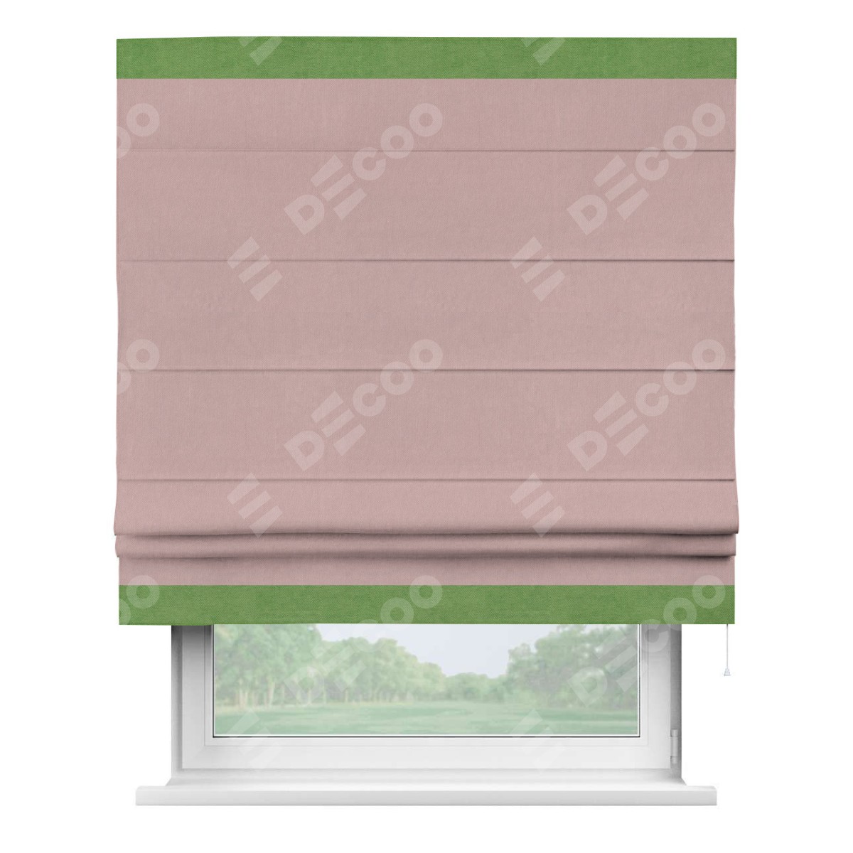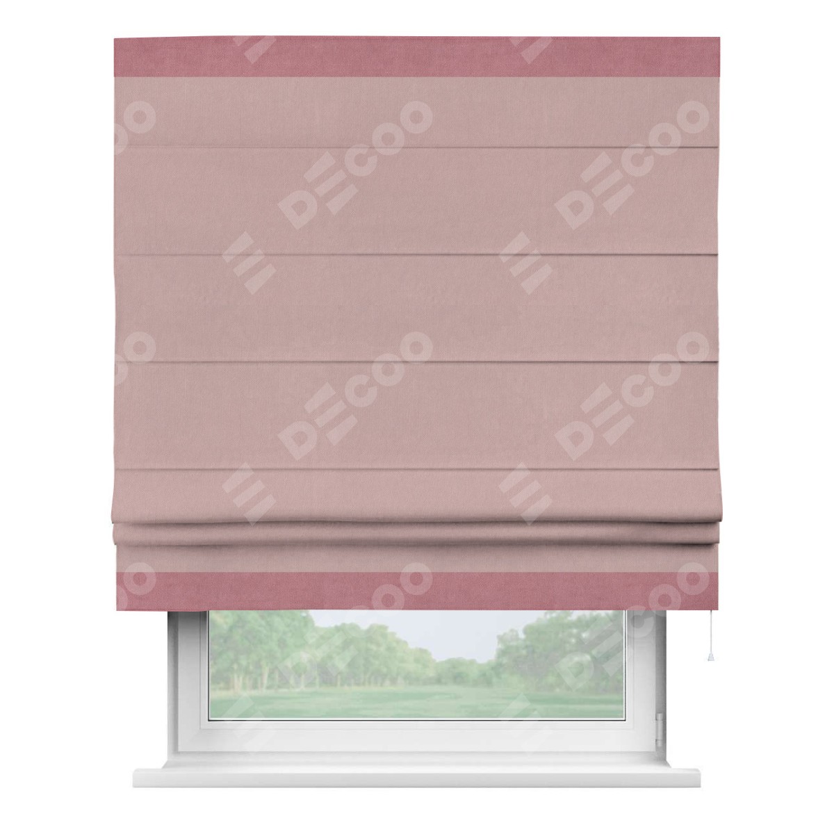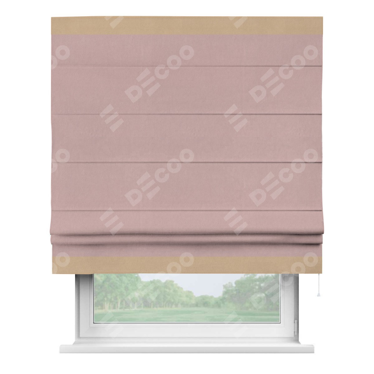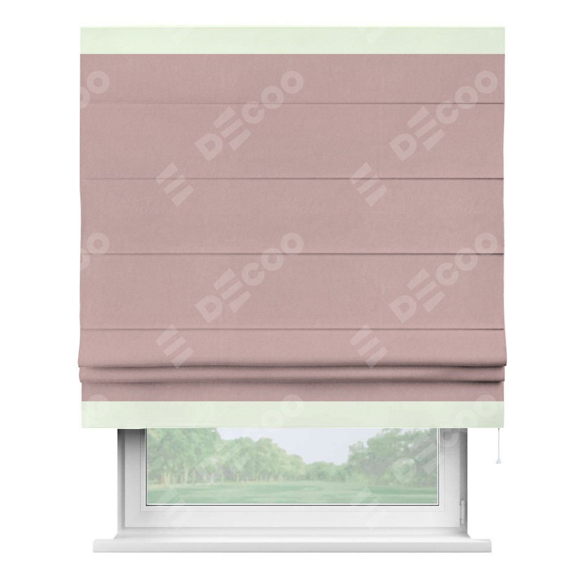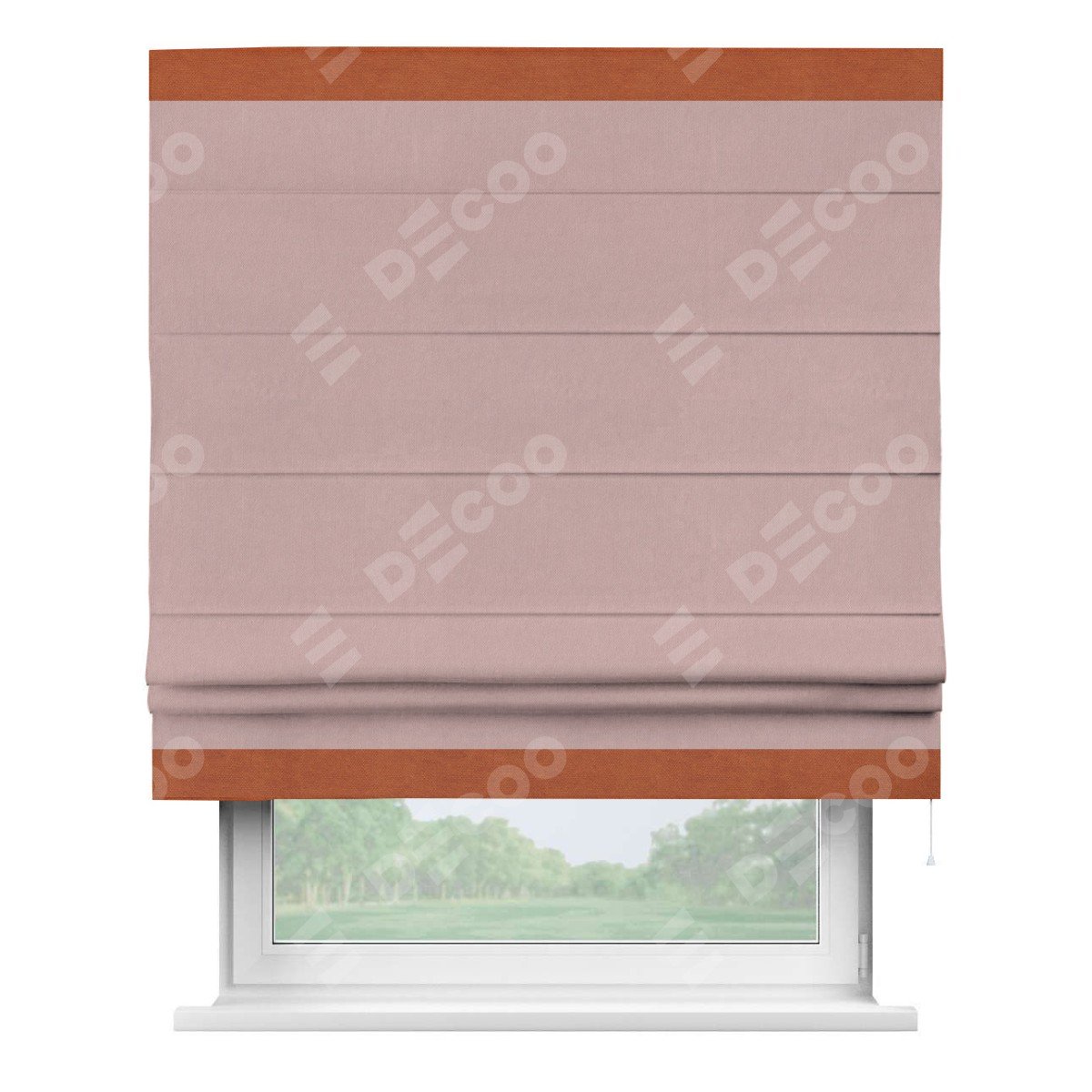 Римская штора производителя «Cortin», используется для проёма, пошита из ткани вельвет розовая пудра, артикул ткани 14132. Отделка шторы кантом «Горизонт», ткань для канта используется из вельвета разной расцветки на выбор. Имеет универсальный механизм и подходит для монтажа: на потолок, на стену и в нишу.