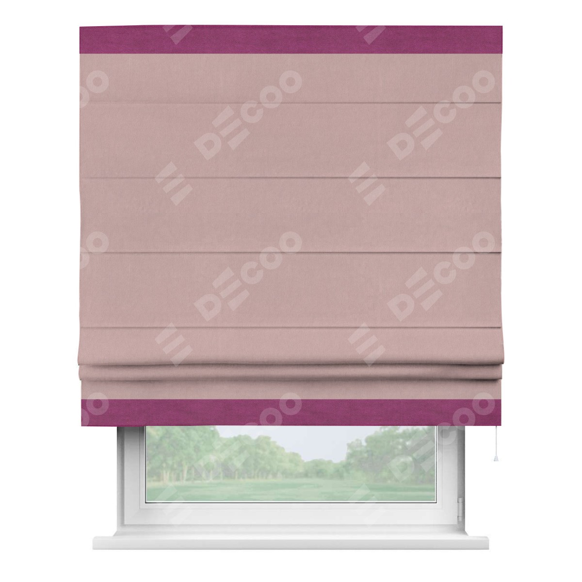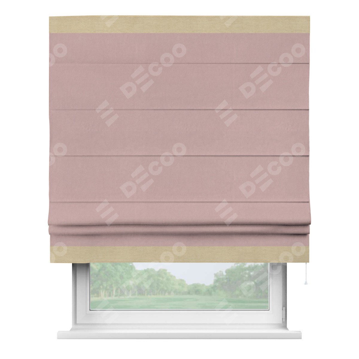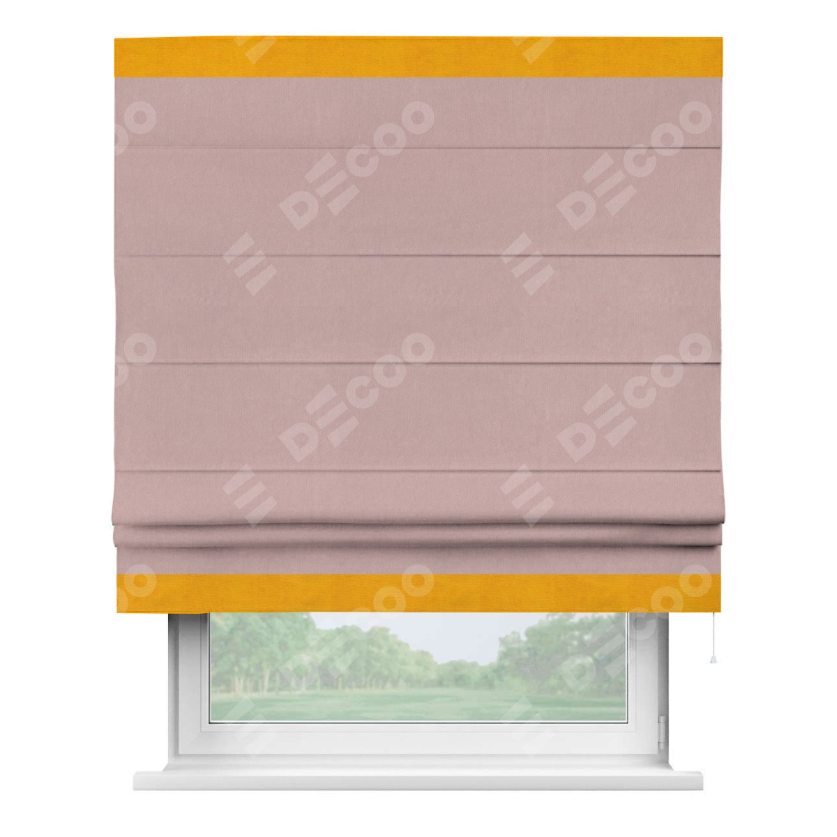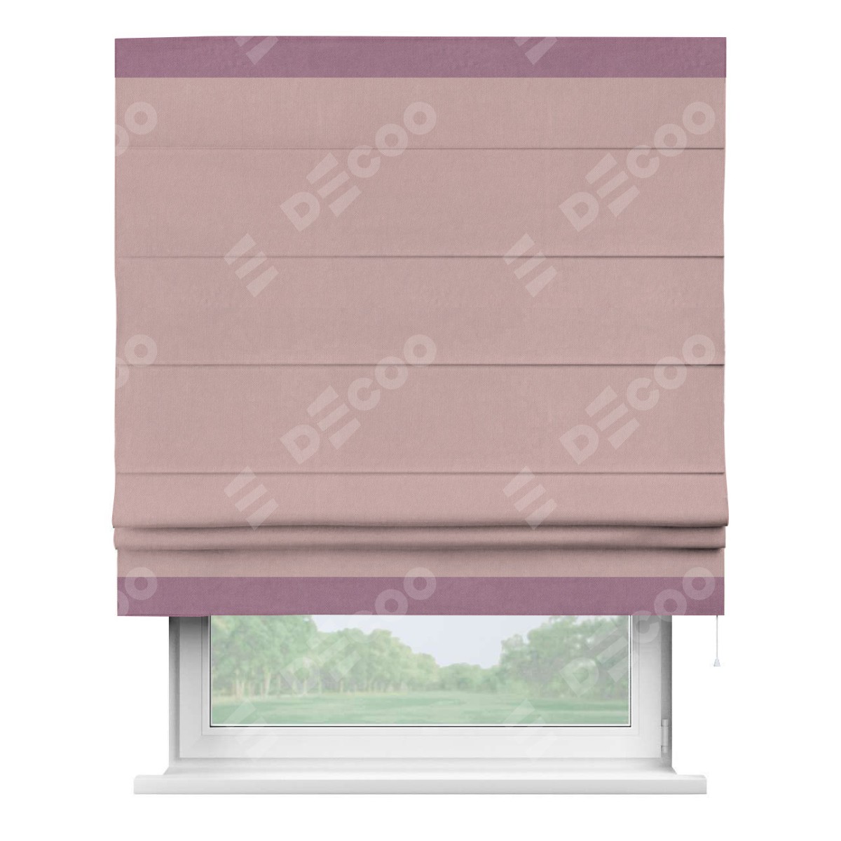 Римская штора производителя «Cortin», используется для проёма, пошита из ткани вельвет розовая пудра, артикул ткани 14132. Отделка шторы кантом «Горизонт», ткань для канта используется из вельвета разной расцветки на выбор. Имеет универсальный механизм и подходит для монтажа: на потолок, на стену и в нишу.