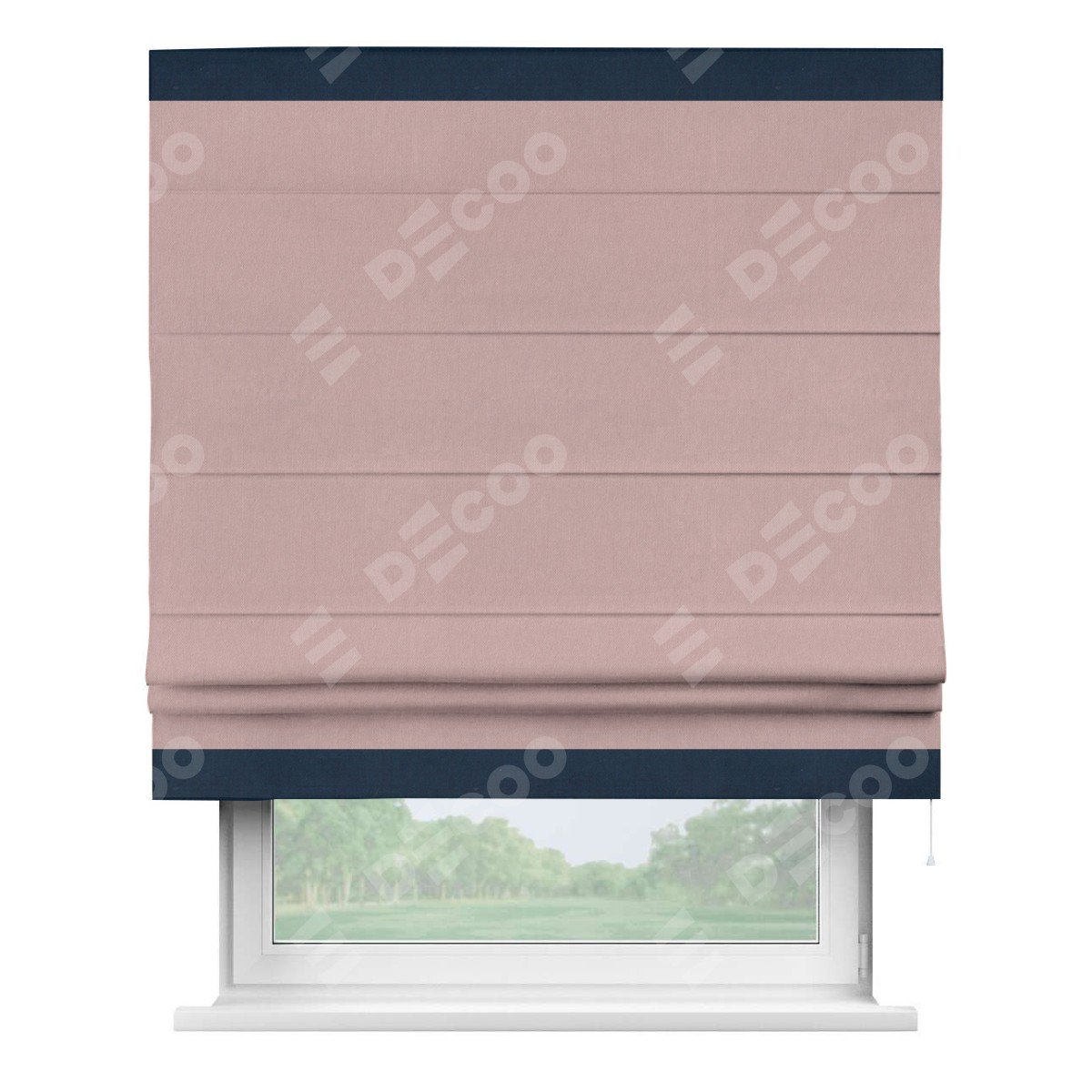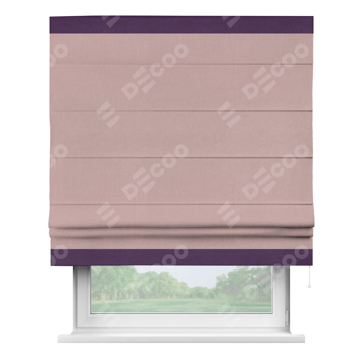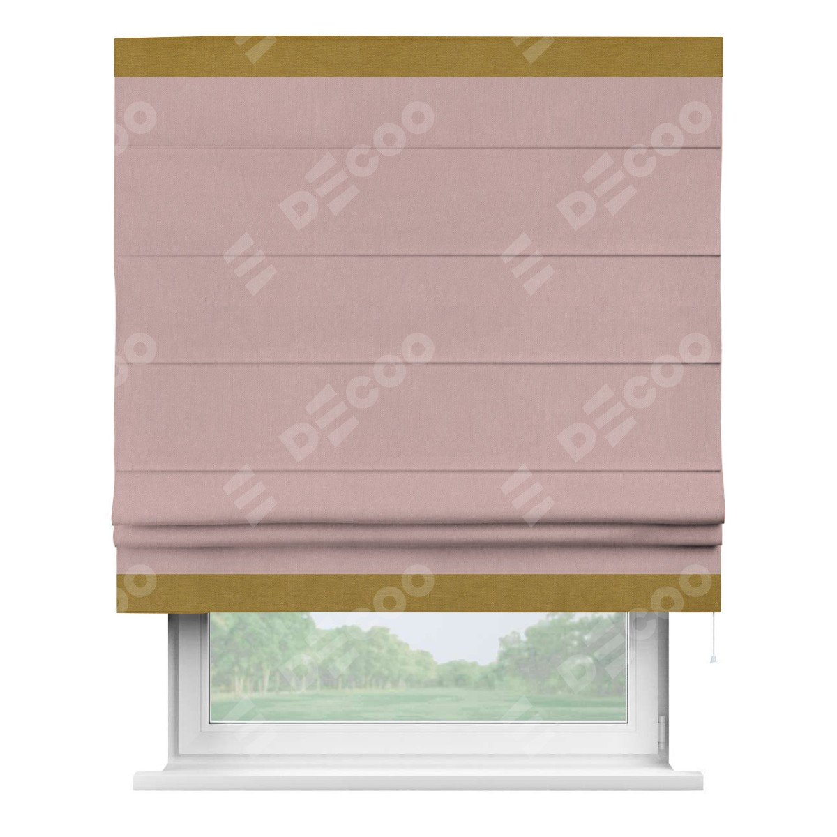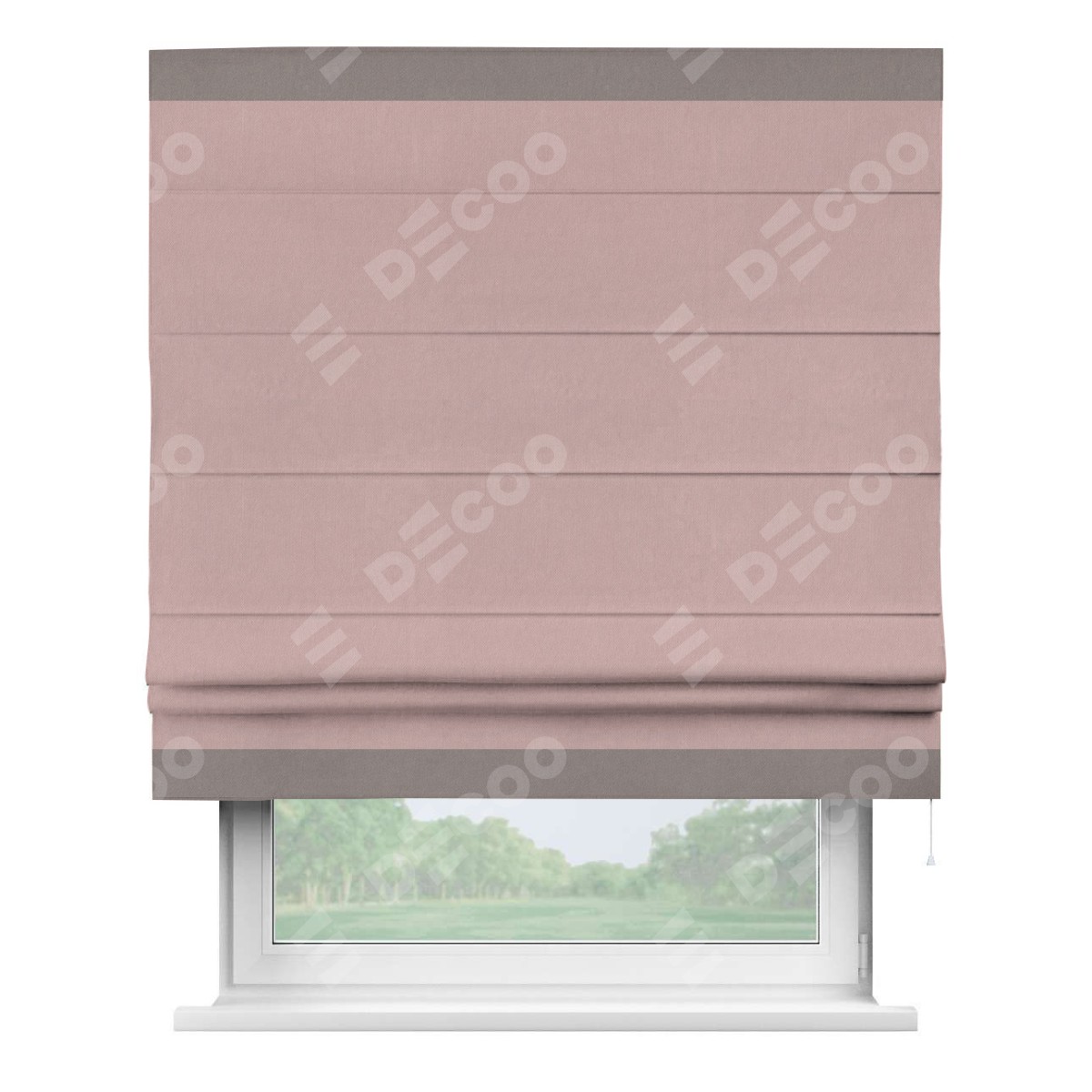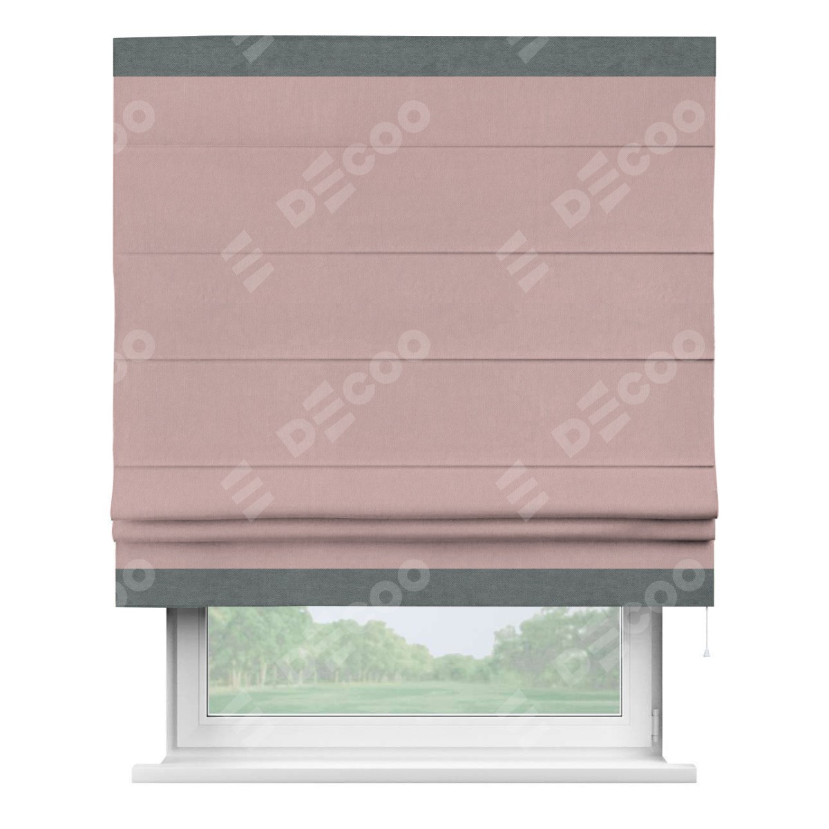 Римская штора производителя «Cortin», используется для проёма, пошита из ткани вельвет розовая пудра, артикул ткани 14132. Отделка шторы кантом «Горизонт», ткань для канта используется из вельвета разной расцветки на выбор. Имеет универсальный механизм и подходит для монтажа: на потолок, на стену и в нишу.