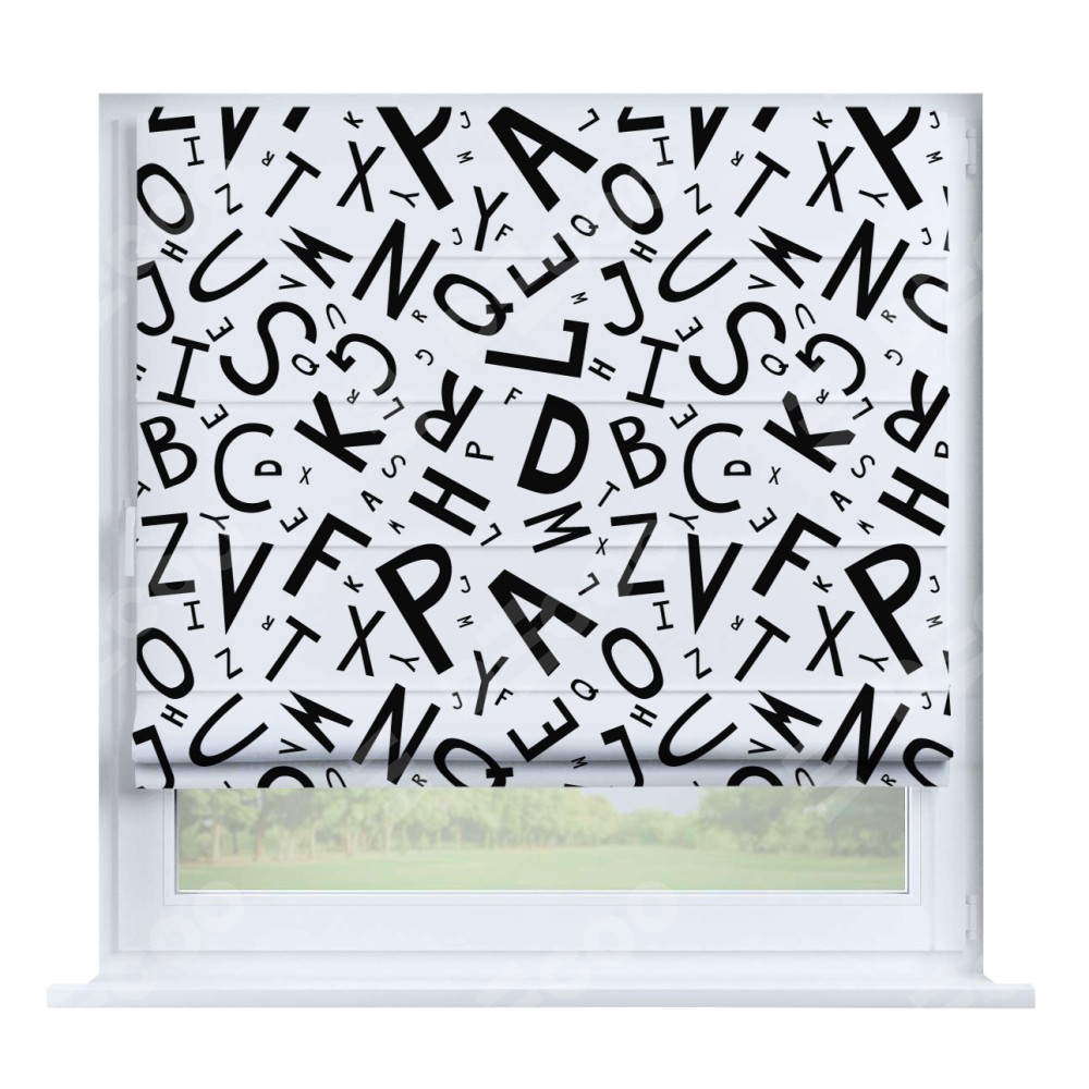 Римская штора производителя «Cortin», устанавливается на створку окна, пошита из ткани блэкаут с нанесением сублимационной печати «Литеры на белом». Штора шьётся по индивидуальным размерам, для данного типа римской шторы возможная ширина от 35 до 150 см., высота до 250 см.