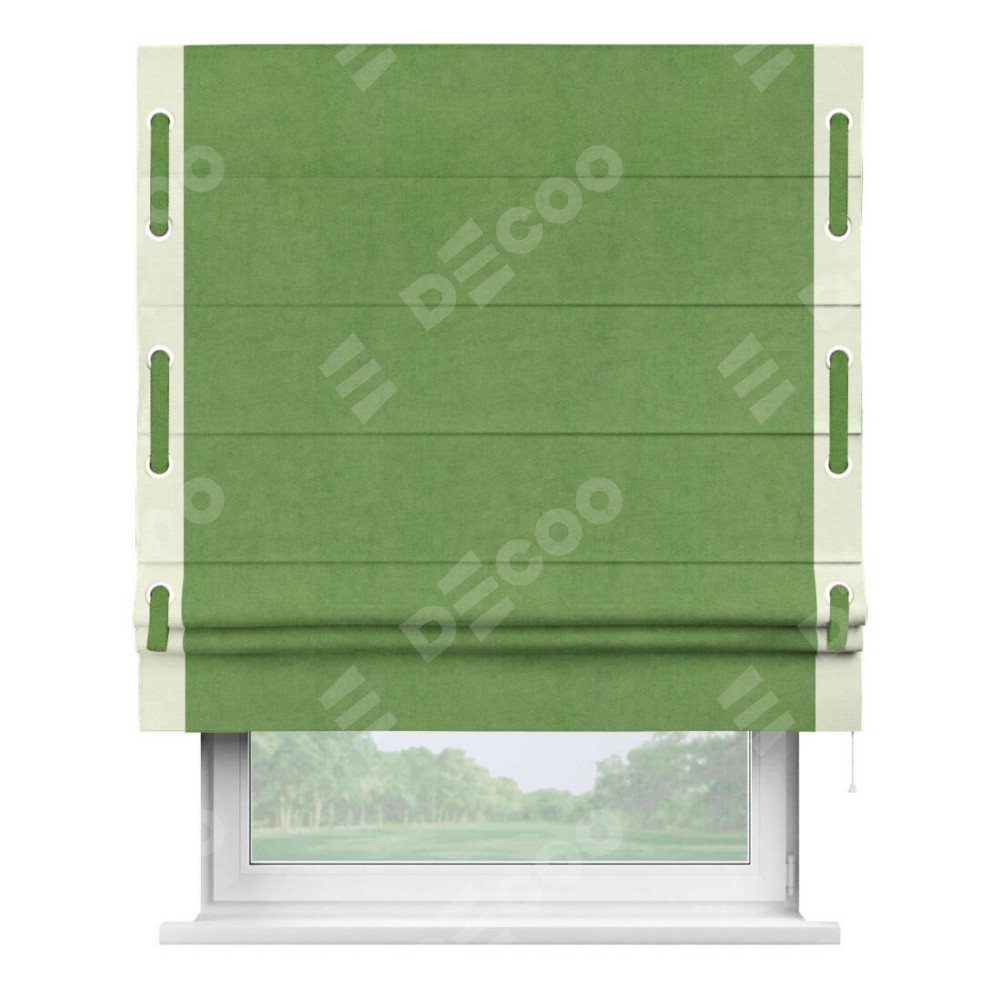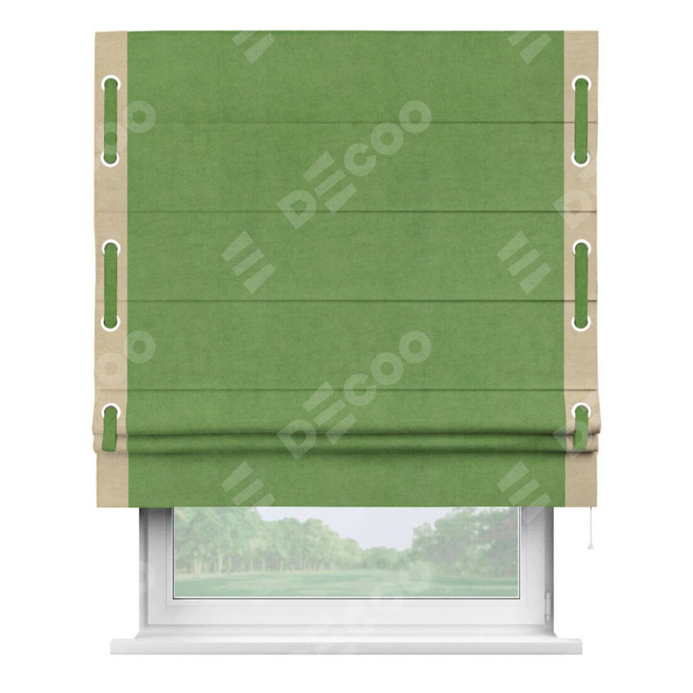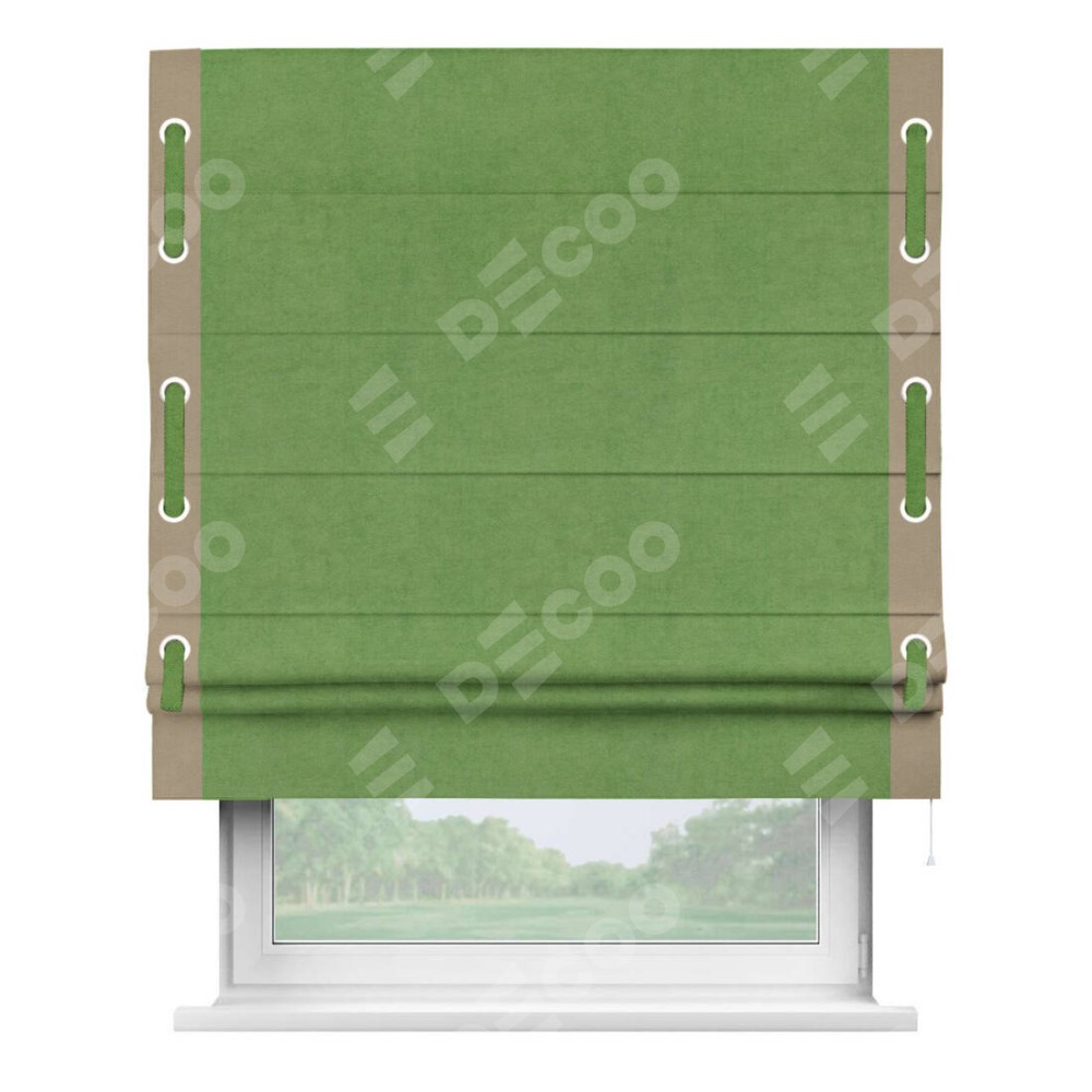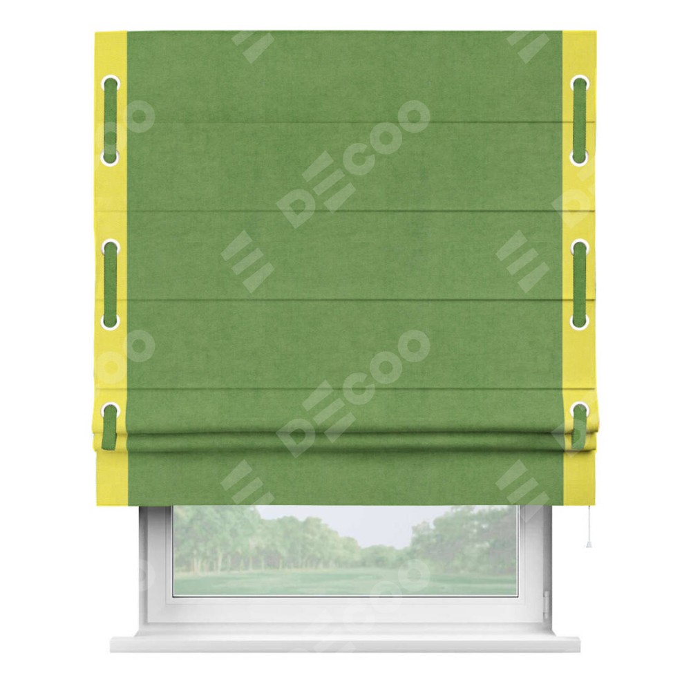Римская штора производителя «Cortin», используется для проёма, пошита из ткани вельвет салатовый, артикул ткани 87072. Отделка шторы кантом «Стрим Дуо» на кантах расположены люверсы с пояском, ткань для канта используется из вельвета разной расцветки на выбор. Ткань для пояска обычно используется из основной ткани шторы, а так же можно сделать из любой расцветки по желанию. Имеет универсальный механизм и подходит для монтажа: на потолок, на стену и в нишу.