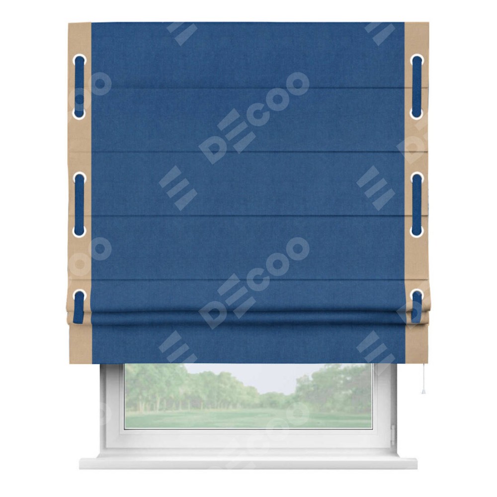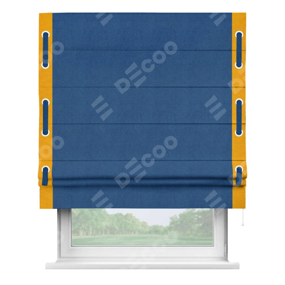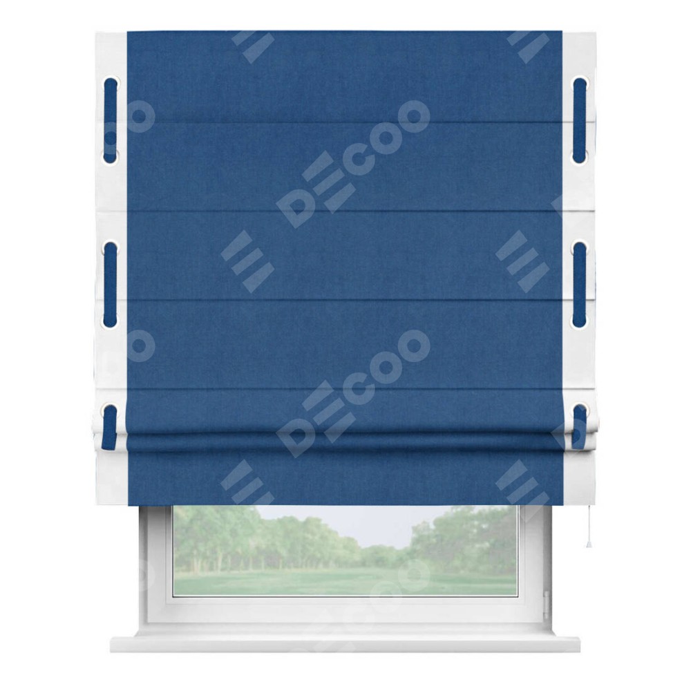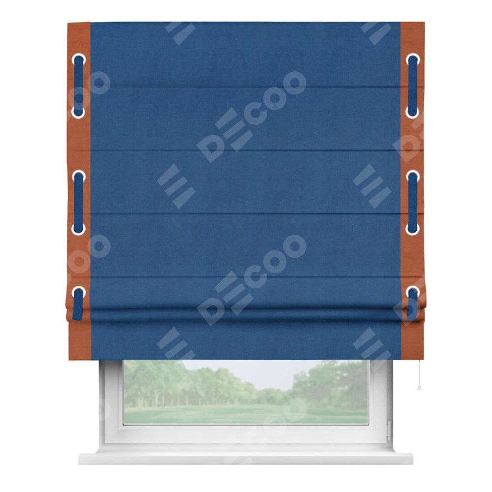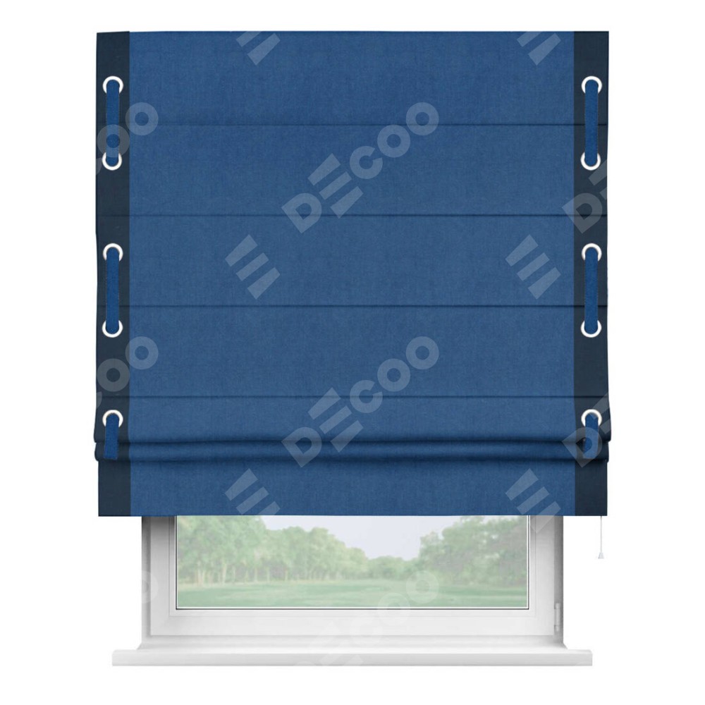 Римская штора производителя «Cortin», используется для проёма, пошита из ткани вельвет синий, артикул ткани 85554. Отделка шторы кантом «Стрим Дуо» на кантах расположены люверсы с пояском, ткань для канта используется из вельвета разной расцветки на выбор. Ткань для пояска обычно используется из основной ткани шторы, а так же можно сделать из любой расцветки по желанию. Имеет универсальный механизм и подходит для монтажа: на потолок, на стену и в нишу.