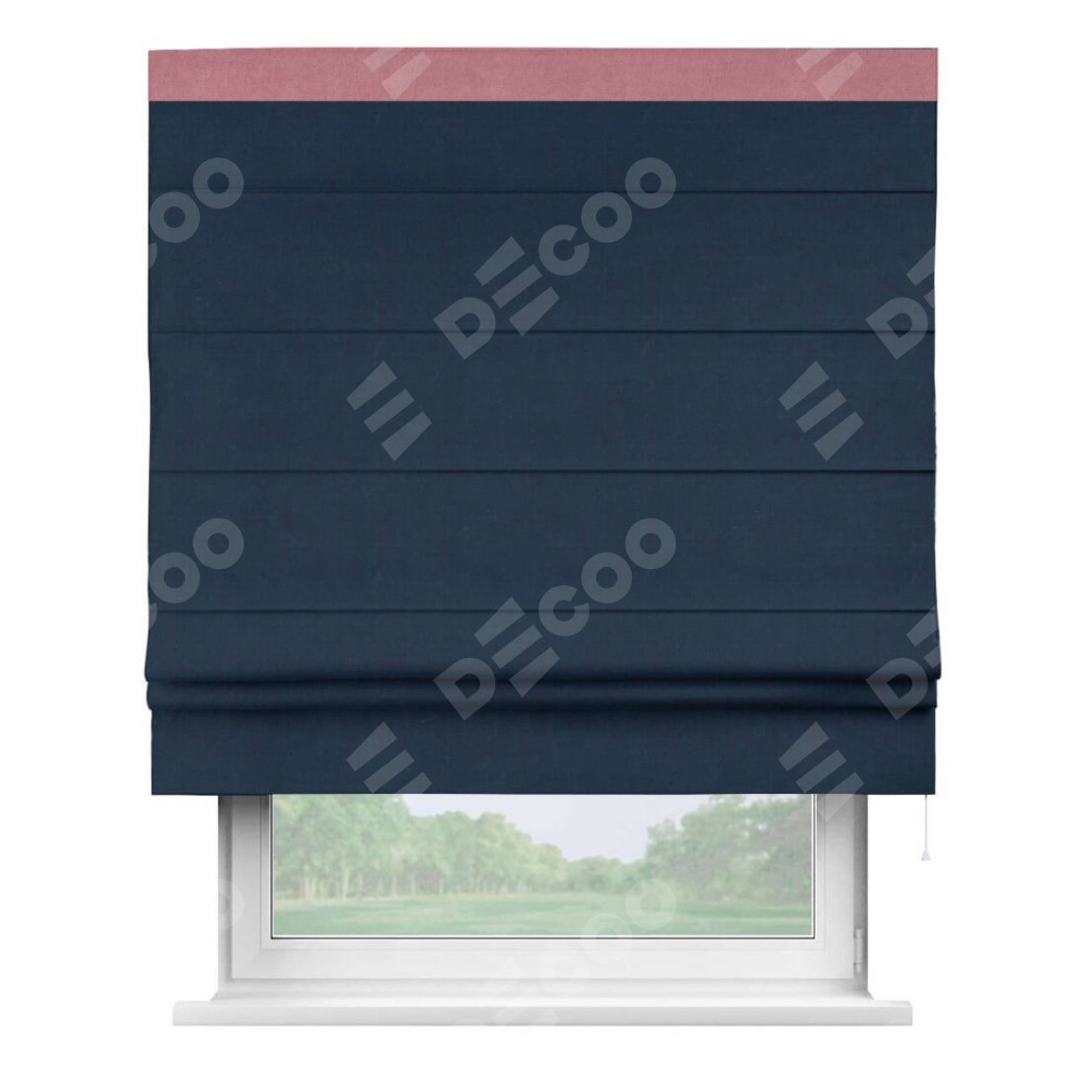 Римская штора производителя «Cortin», используется для проёма, пошита из ткани вельвет темно-синий, артикул ткани 14152. Отделка шторы кантом «Кинг», ткань для канта используется из вельвета разной расцветки на выбор. Имеет универсальный механизм и подходит для монтажа: на потолок, на стену и в нишу.
