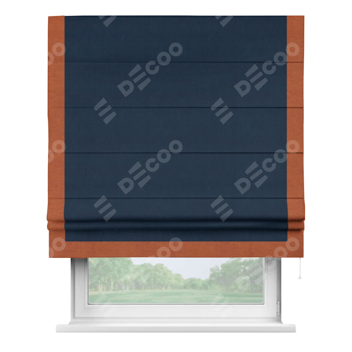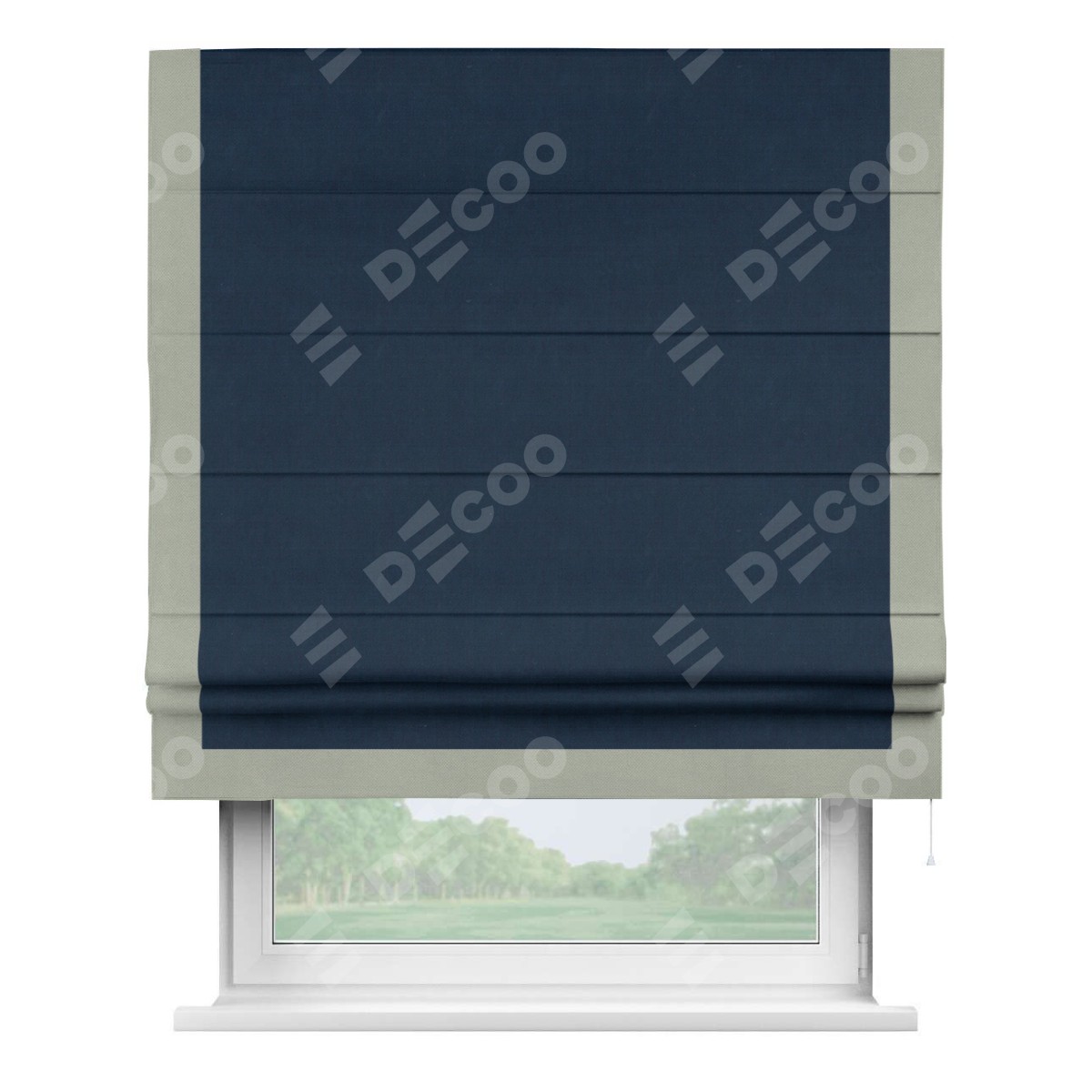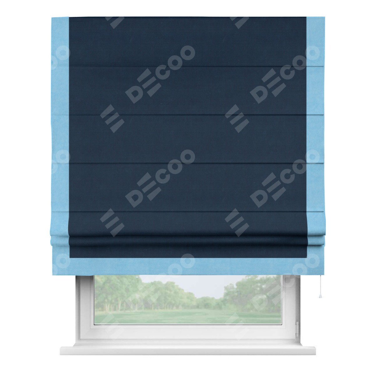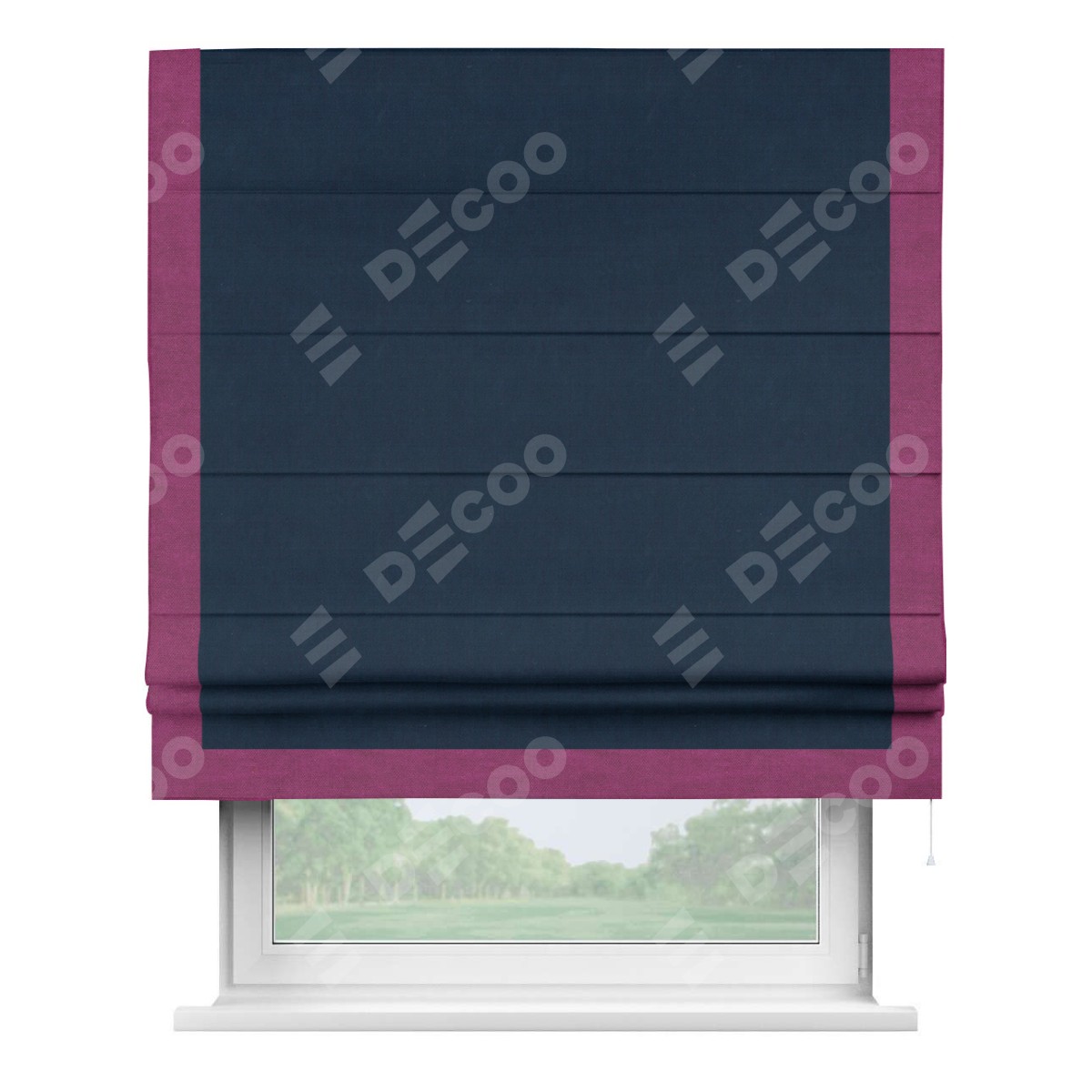 Римская штора производителя «Cortin», используется для проёма, пошита из ткани вельвет темно-синий, артикул ткани 14152. Отделка шторы кантом «Виктория», ткань для канта используется из вельвета разной расцветки на выбор. Имеет универсальный механизм и подходит для монтажа: на потолок, на стену и в нишу.