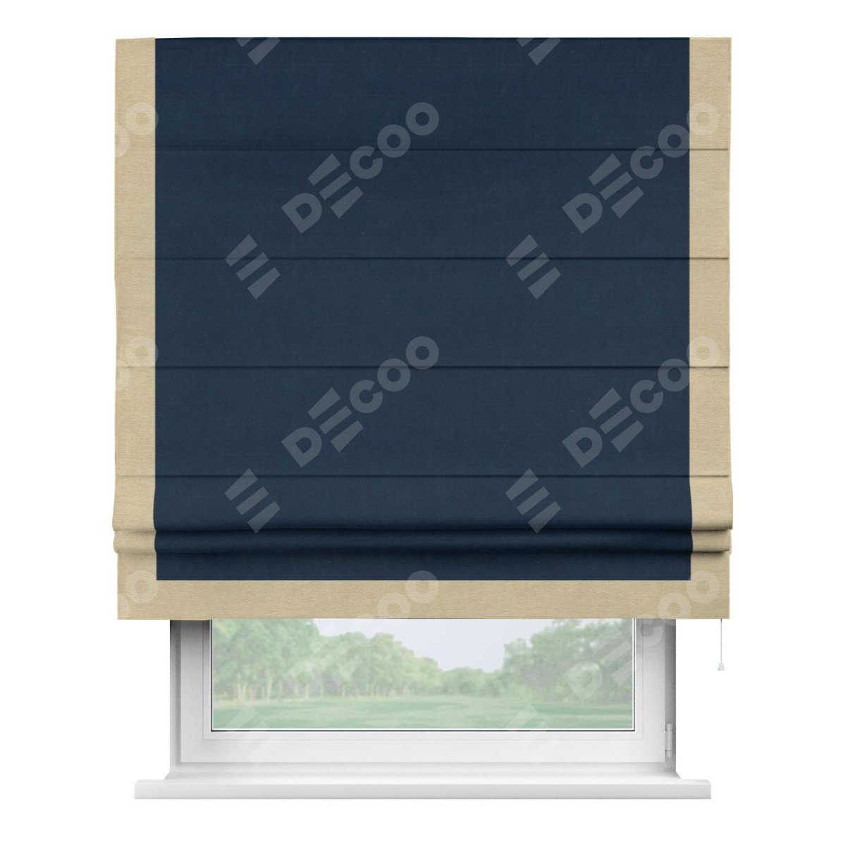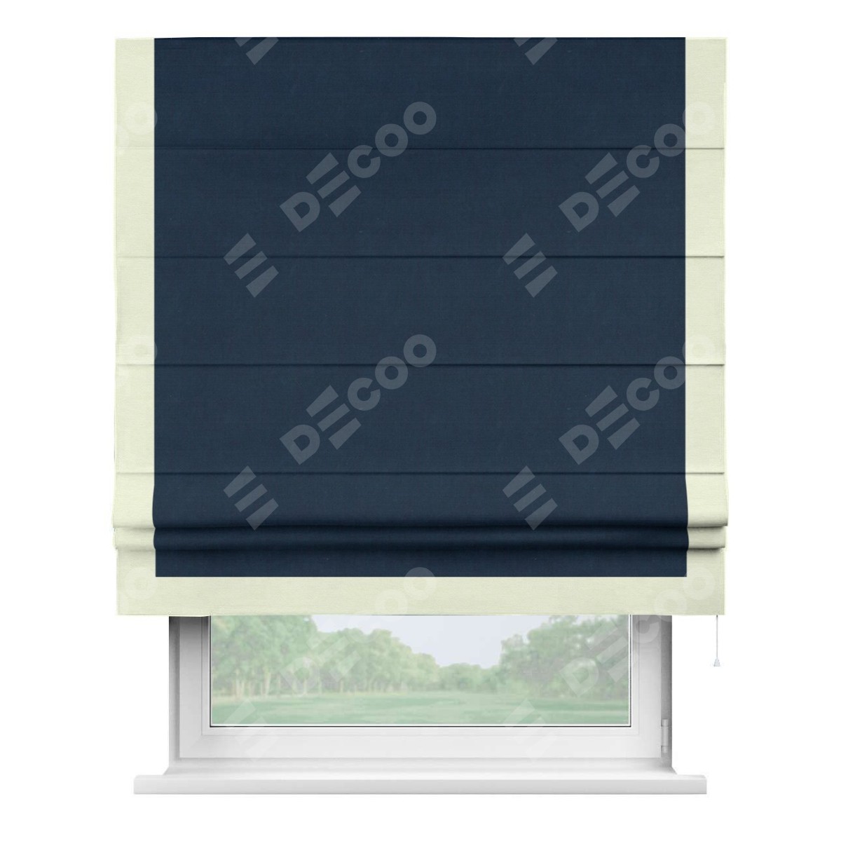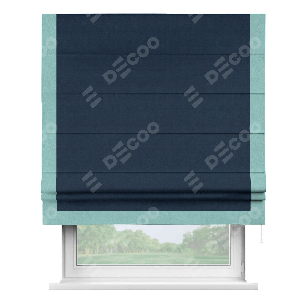 Римская штора производителя «Cortin», используется для проёма, пошита из ткани вельвет темно-синий, артикул ткани 14152. Отделка шторы кантом «Виктория», ткань для канта используется из вельвета разной расцветки на выбор. Имеет универсальный механизм и подходит для монтажа: на потолок, на стену и в нишу.