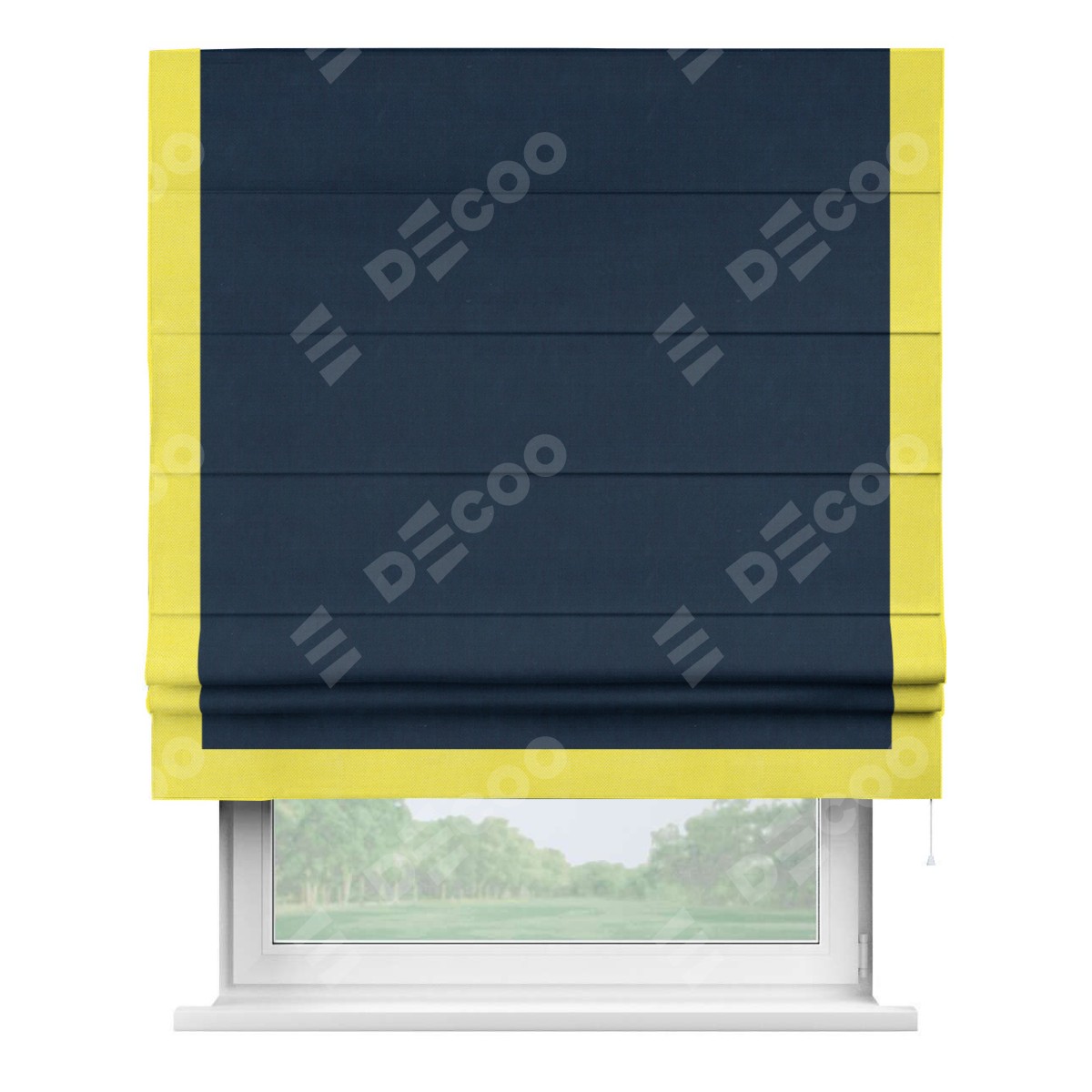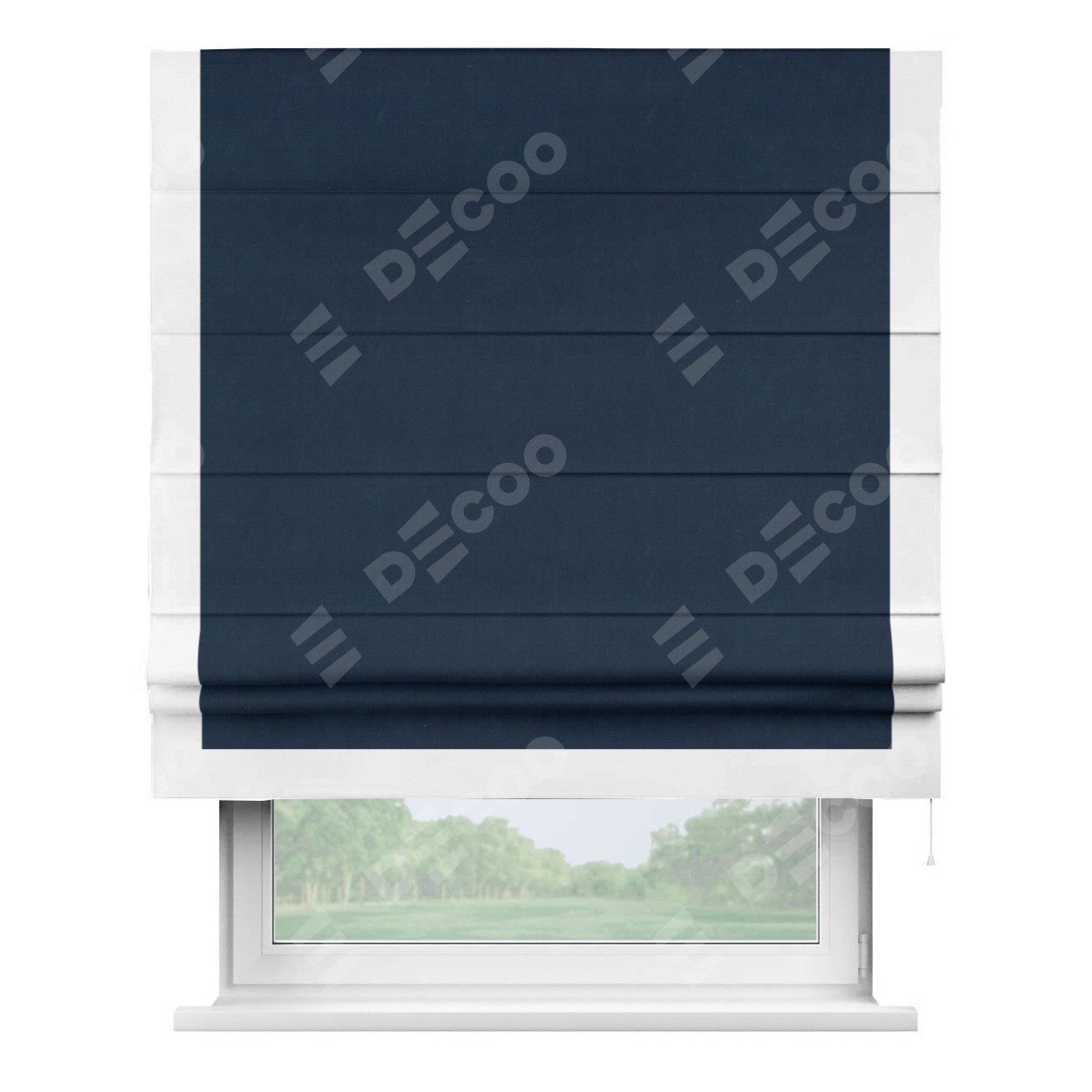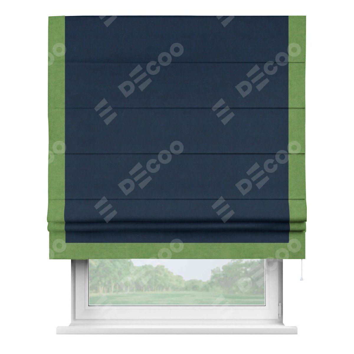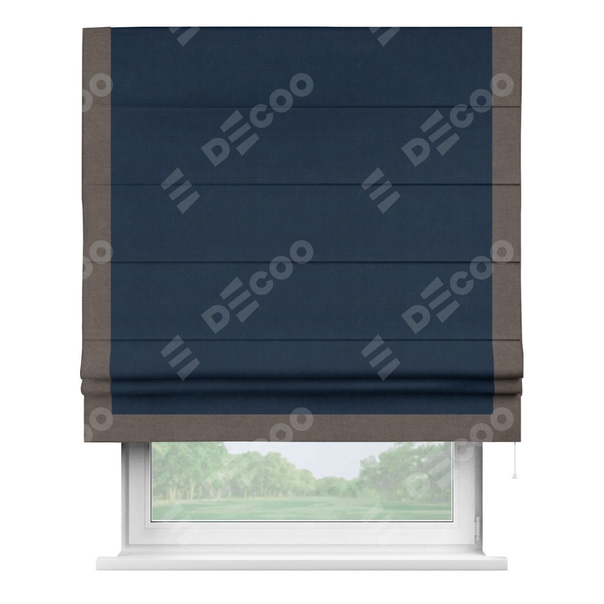 Римская штора производителя «Cortin», используется для проёма, пошита из ткани вельвет темно-синий, артикул ткани 14152. Отделка шторы кантом «Виктория», ткань для канта используется из вельвета разной расцветки на выбор. Имеет универсальный механизм и подходит для монтажа: на потолок, на стену и в нишу.