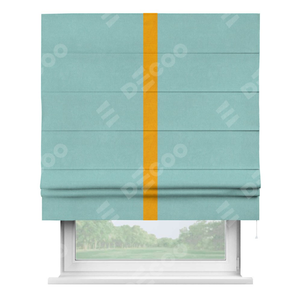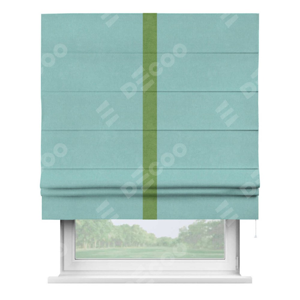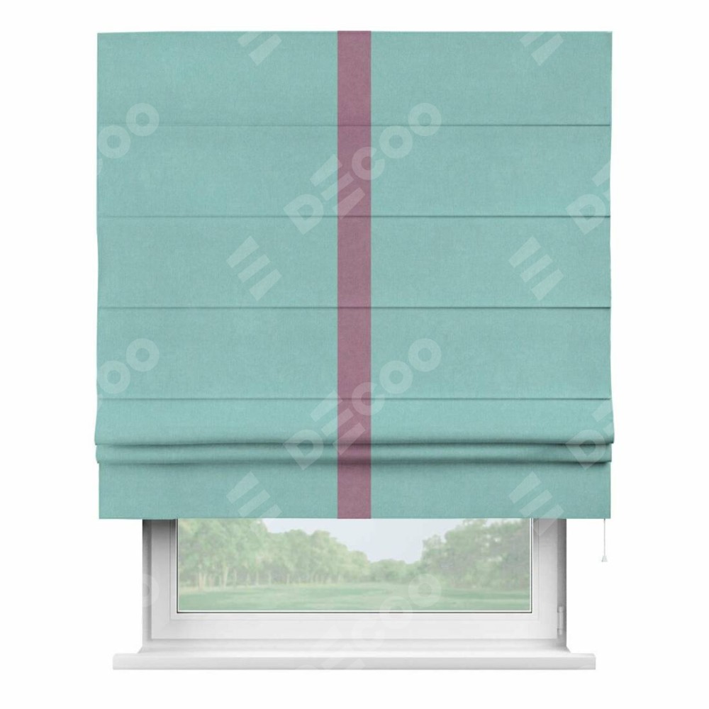 Римская штора производителя «Cortin», используется для проёма, пошита из ткани вельвет тиффани, артикул ткани 17765. Отделка шторы кантом «Хайвей», ткань для канта используется из вельвета разной расцветки на выбор. Имеет универсальный механизм и подходит для монтажа: на потолок, на стену и в нишу.