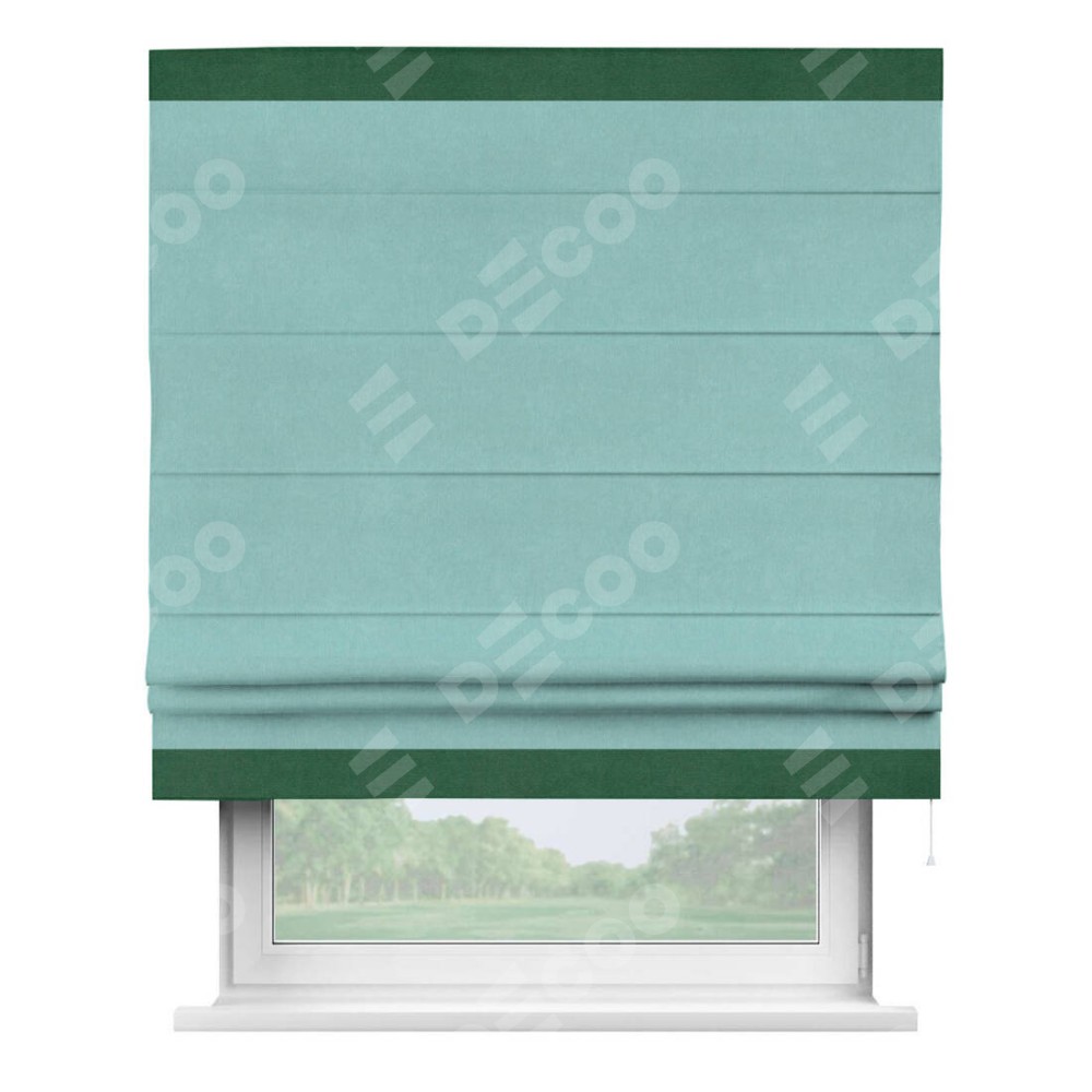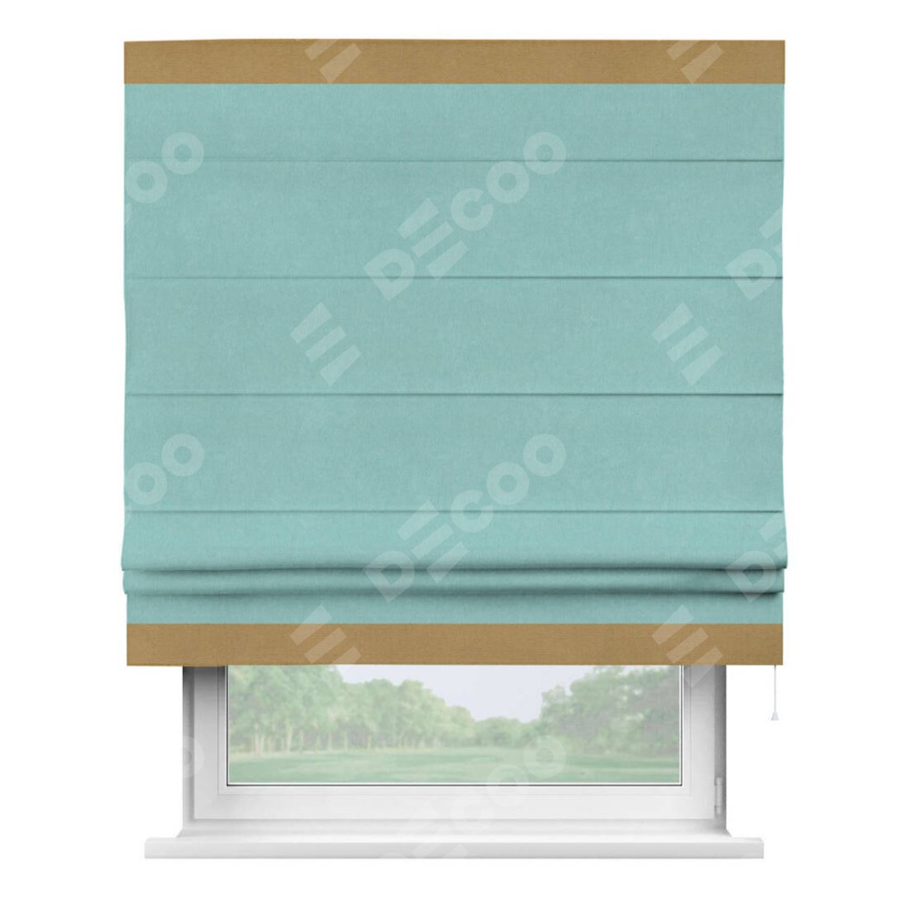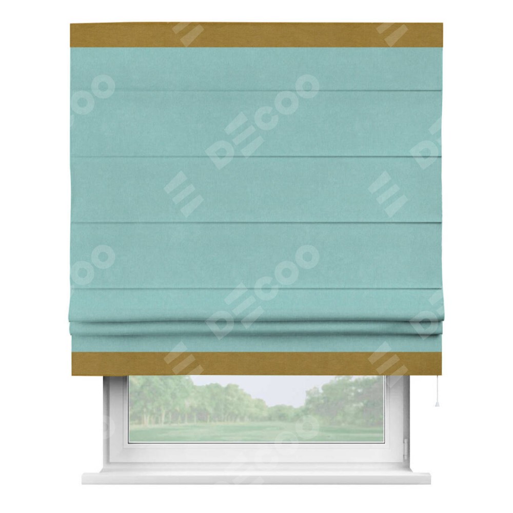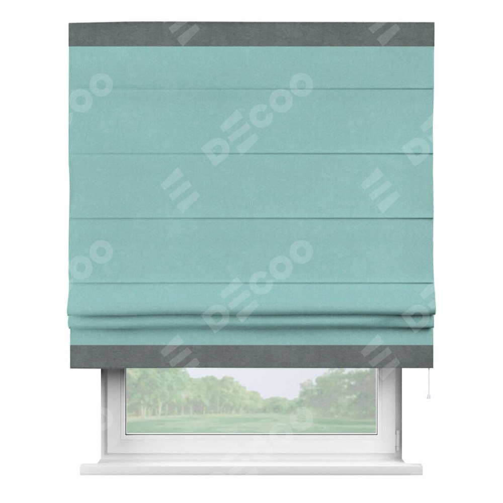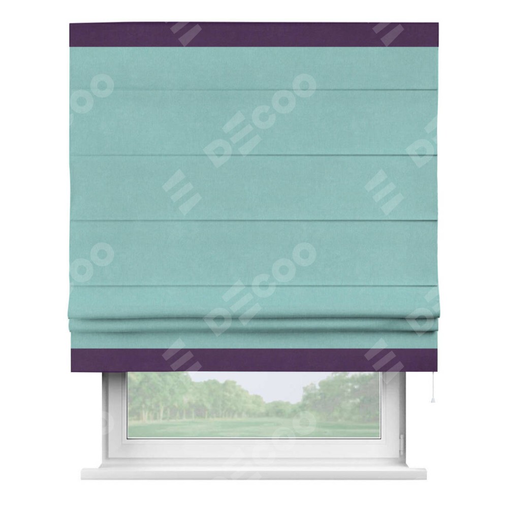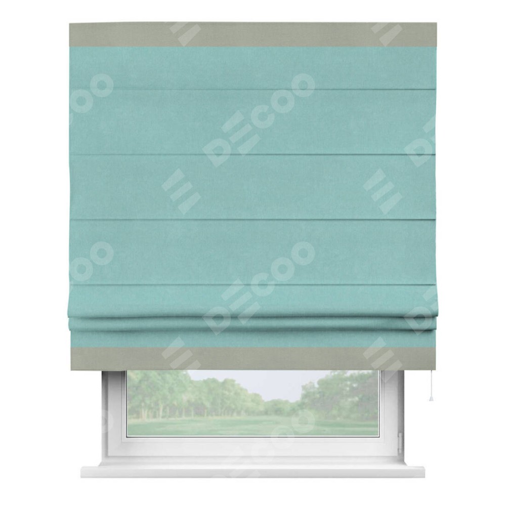 Римская штора производителя «Cortin», используется для проёма, пошита из ткани вельвет тиффани, артикул ткани 17765. Отделка шторы кантом «Горизонт», ткань для канта используется из вельвета разной расцветки на выбор. Имеет универсальный механизм и подходит для монтажа: на потолок, на стену и в нишу.