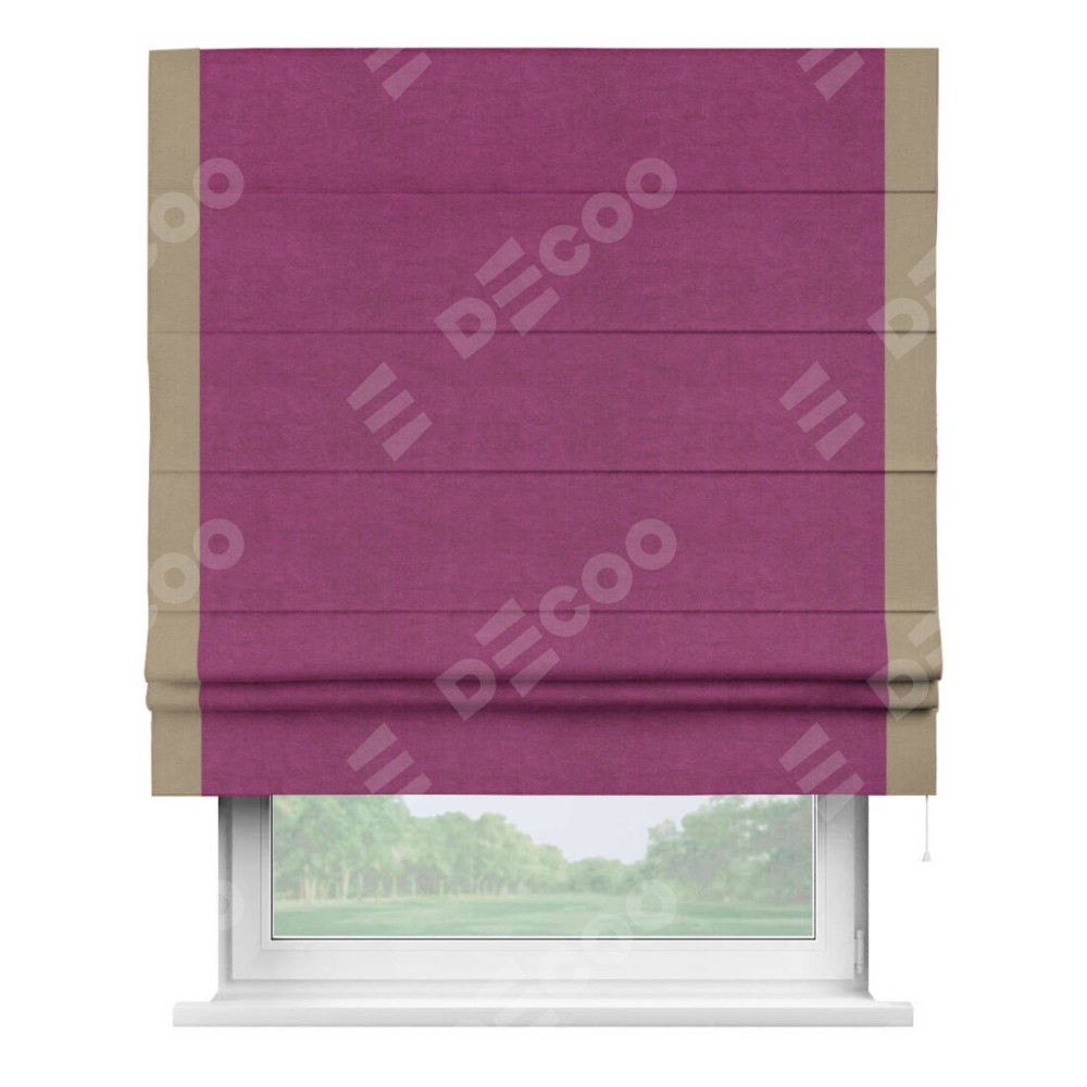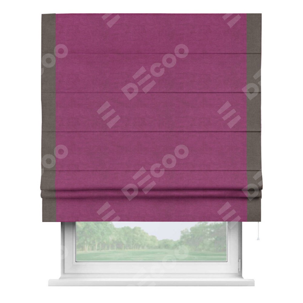 Римская штора производителя «Cortin», используется для проёма, пошита из ткани вельвет фиолетовый, артикул ткани 85552. Отделка шторы кантом «Стрим Дуо», ткань для канта используется из вельвета разной расцветки на выбор. Имеет универсальный механизм и подходит для монтажа: на потолок, на стену и в нишу.
