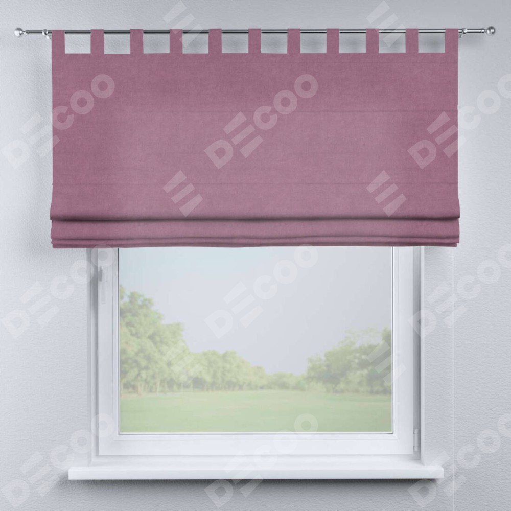 Римская штора производителя «Cortin», используется для проёма, пошита из ткани вельвет лиловый, артикул ткани 17752. Данная модель пошита на петлях, комплектуется на выбор круглым карнизом и подходит для монтажа на стену. Римская штора на петлях имеет простую систему регулировки высоты, отличительным преимуществом данной модели является простой способ монтажа. Достаточно повесить ее на трубу и штора готова!