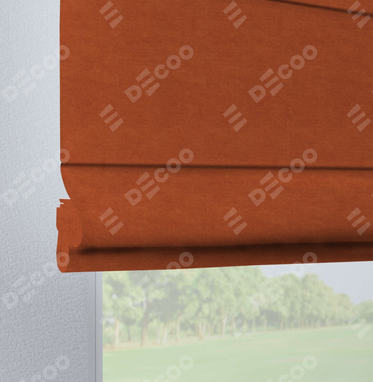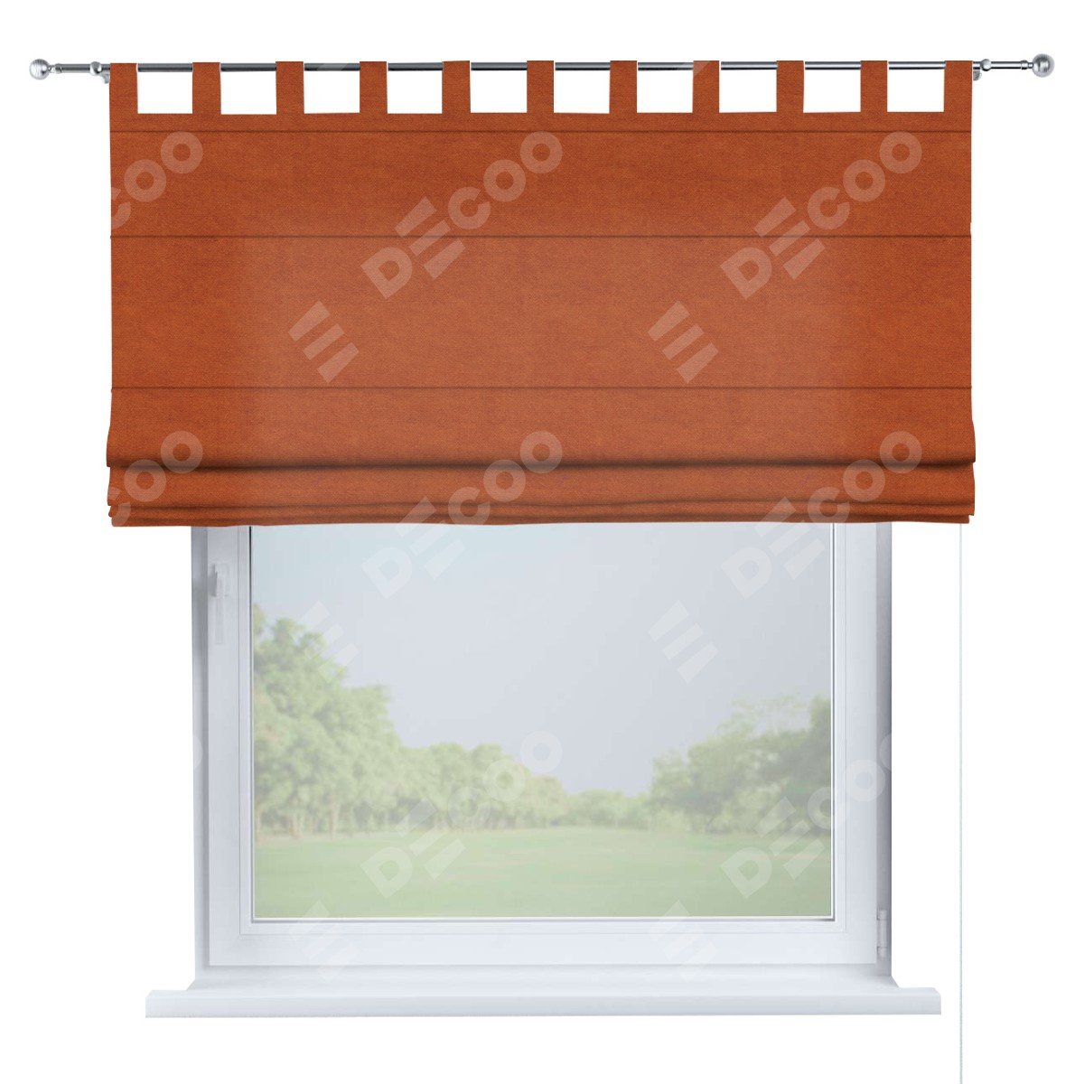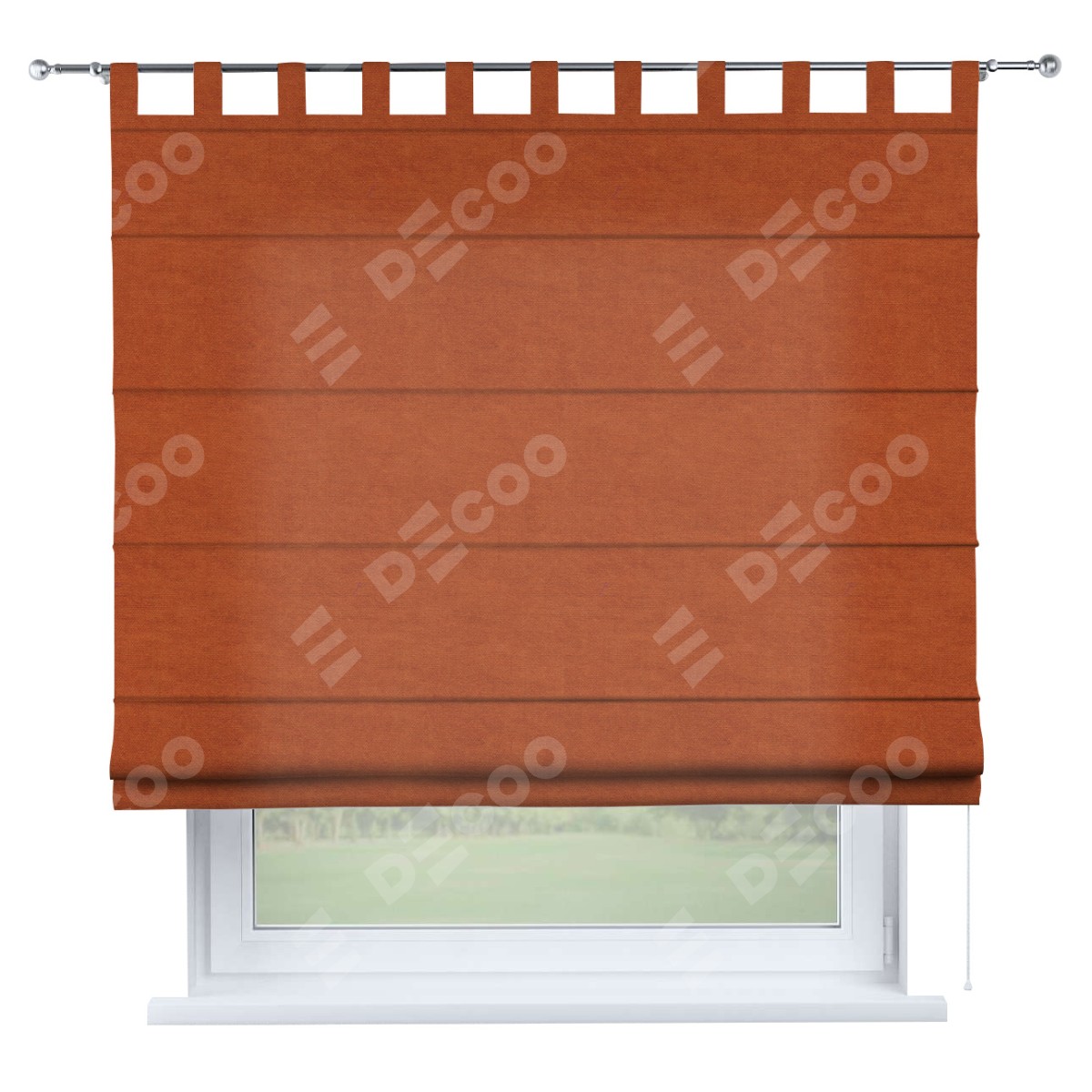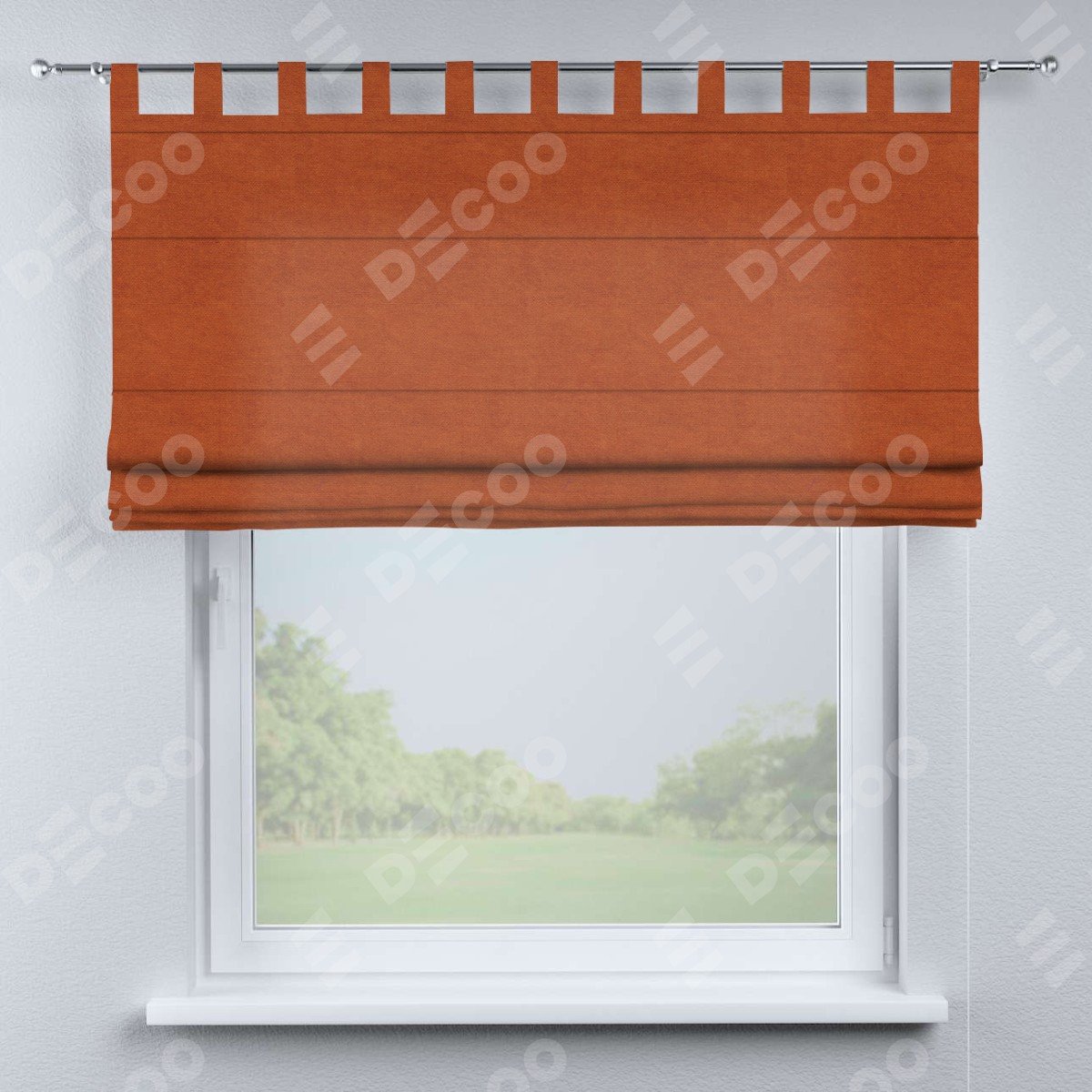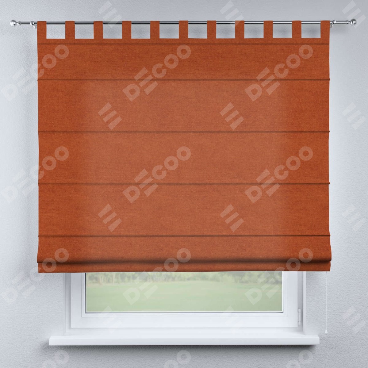 Римская штора производителя «Cortin», используется для проёма, пошита из ткани вельвет терракотовый, артикул ткани 85548. Данная модель пошита на петлях, комплектуется на выбор круглым карнизом и подходит для монтажа на стену. Римская штора на петлях имеет простую систему регулировки высоты, отличительным преимуществом данной модели является простой способ монтажа. Достаточно повесить ее на трубу и штора готова!