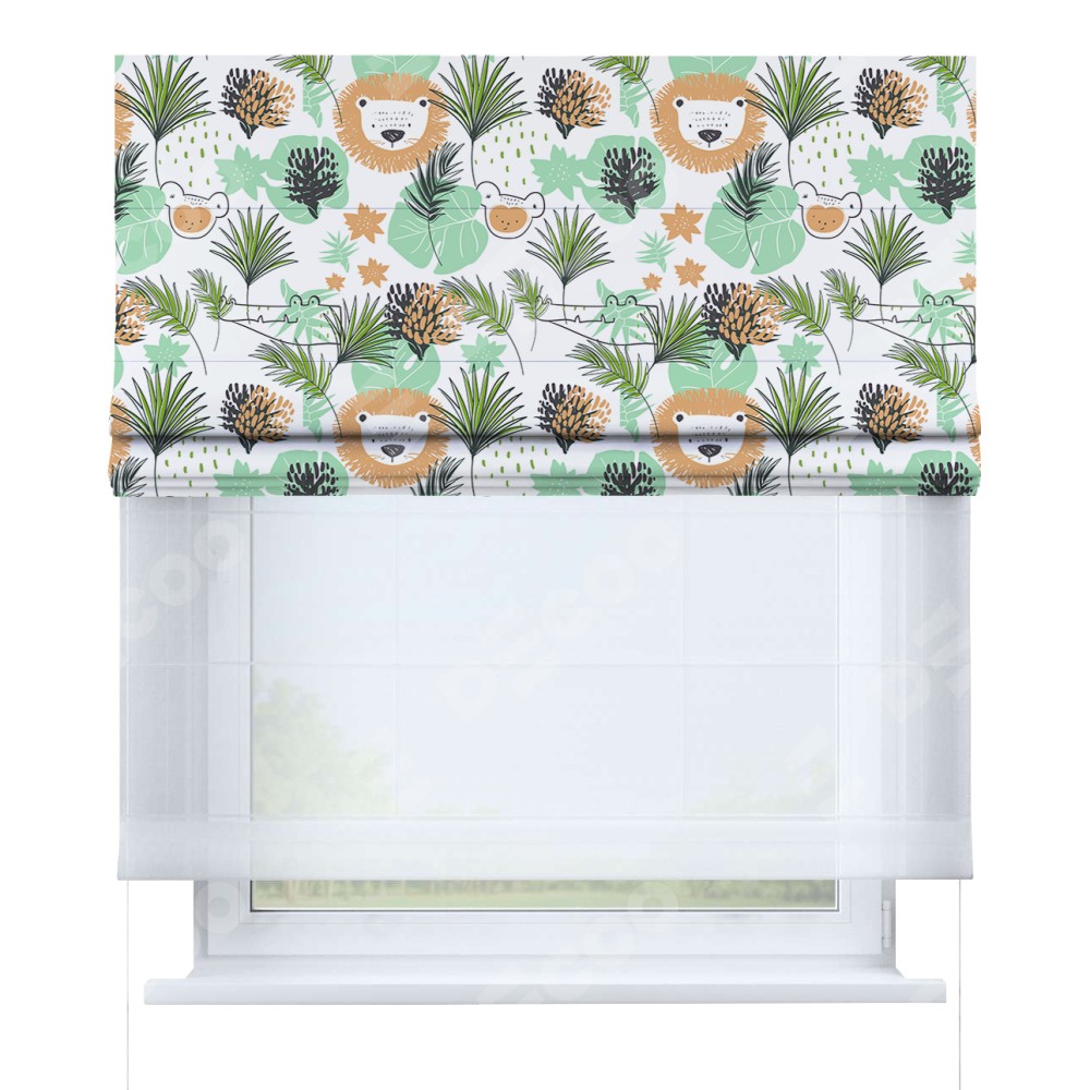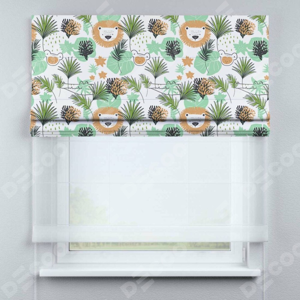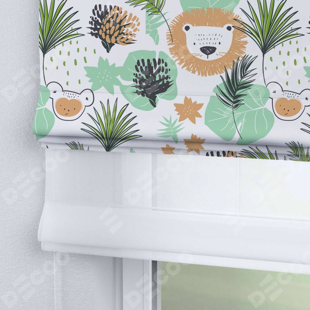 Римская штора день-ночь производителя «Cortin», используется для проёма, пошита из двух полотен, с лицевой блэкаут с нанесением сублимационной печати «Животные из джунглей», вторая ткань тюль (по стандарту комплектуется тюль белого цвета артикул V-01). Имеет универсальный механизм и подходит для монтажа: на потолок, на стену и в нишу.