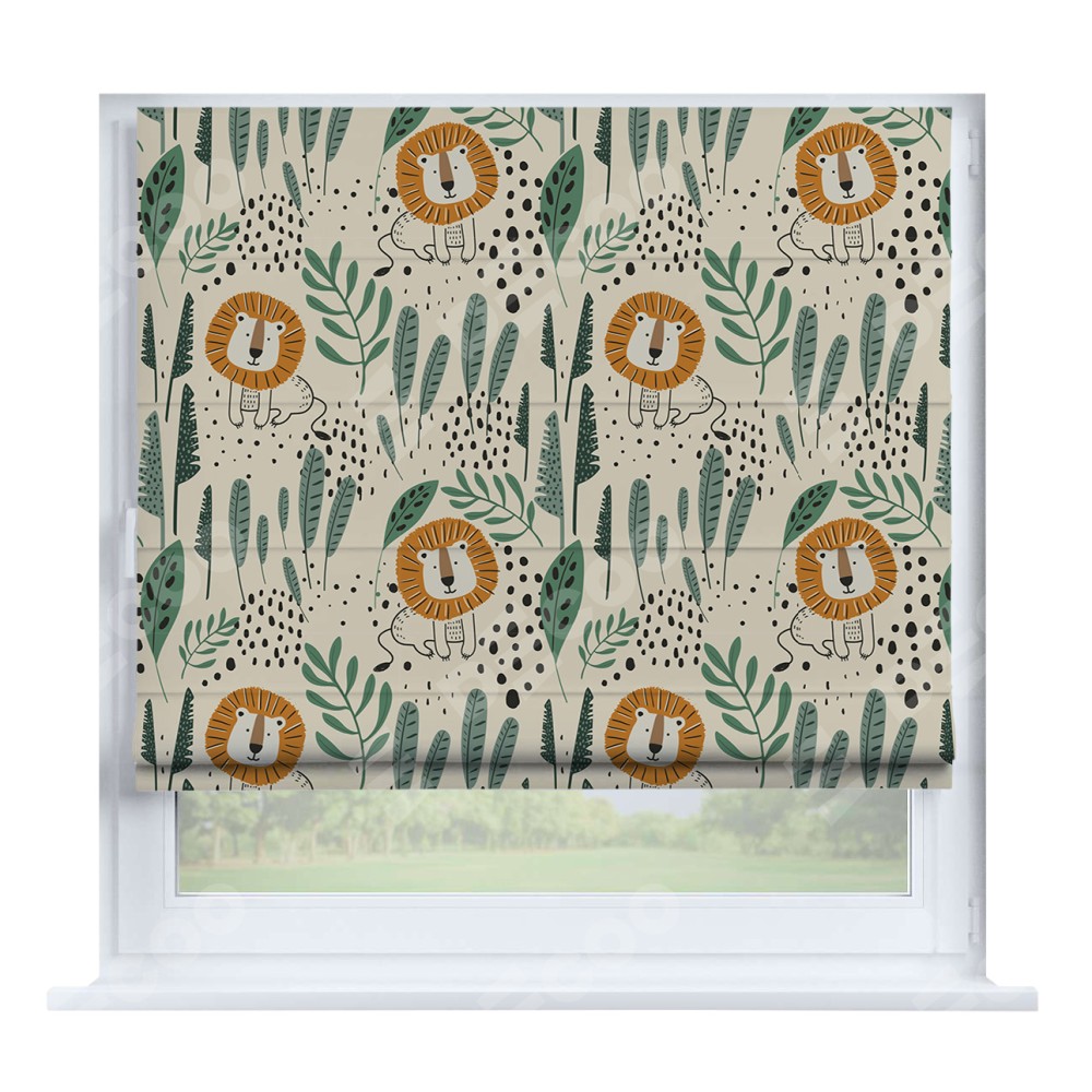 Римская штора производителя «Cortin», устанавливается на створку окна, пошита из ткани блэкаут с нанесением сублимационной печати «Лев из джунглей». Штора шьётся по индивидуальным размерам, для данного типа римской шторы возможная ширина от 35 до 150 см., высота до 250 см.