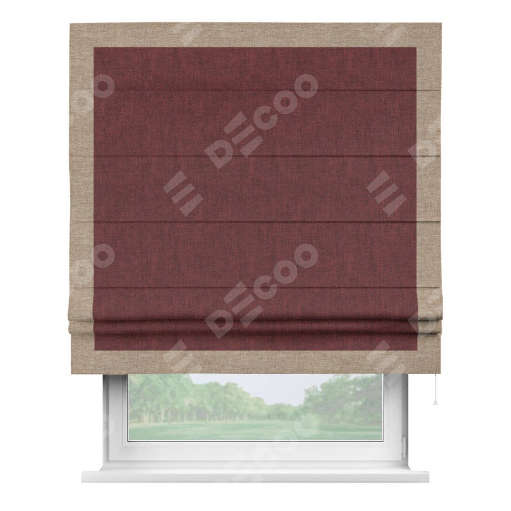 Римская штора производителя «Cortin», используется для проёма, пошита из ткани лён кашемир бордовый, артикул 17213. Отделка шторы кантом «Чесс», ткань для канта используется из льна разной расцветки на выбор. Имеет универсальный механизм и подходит для монтажа: на потолок, на стену и в нишу.