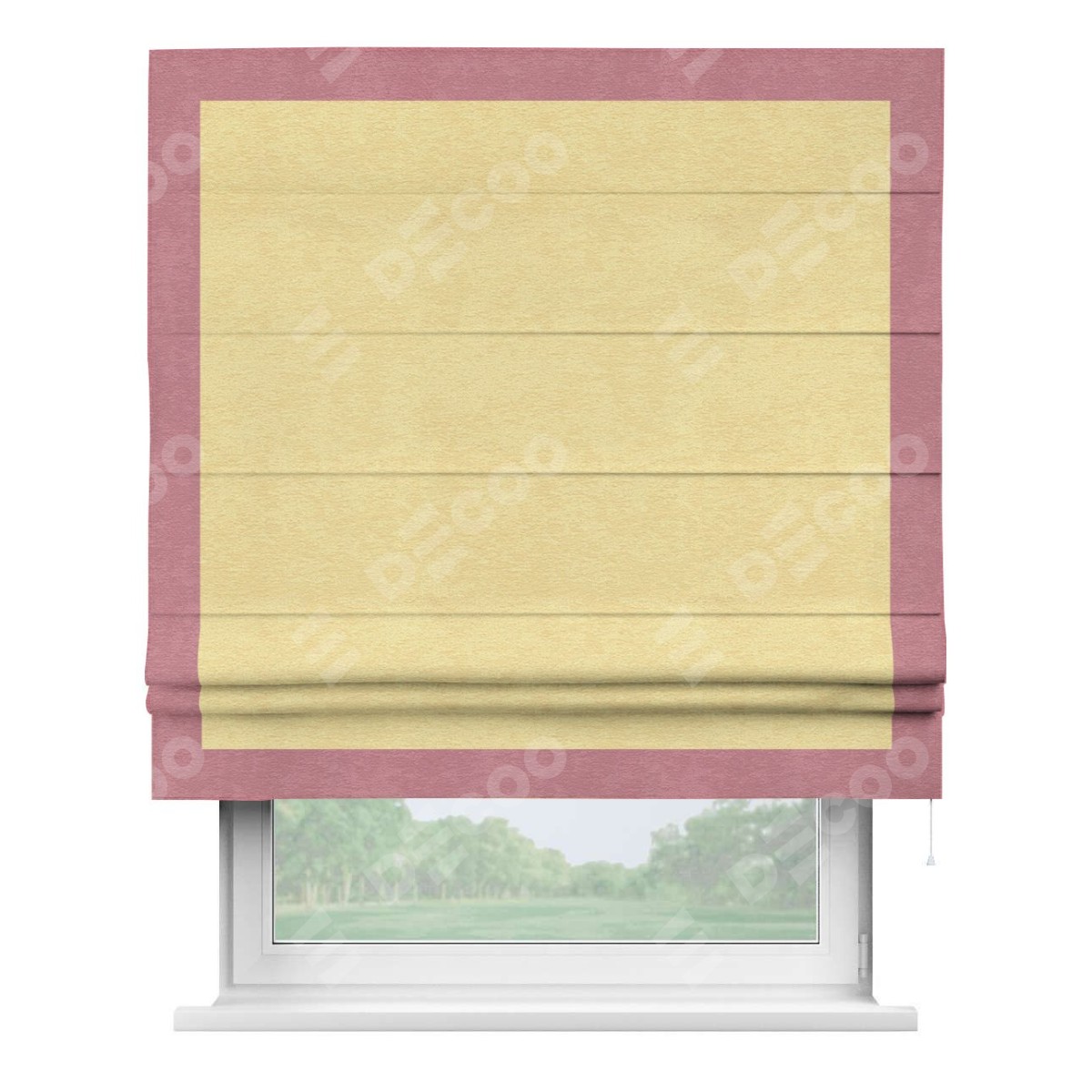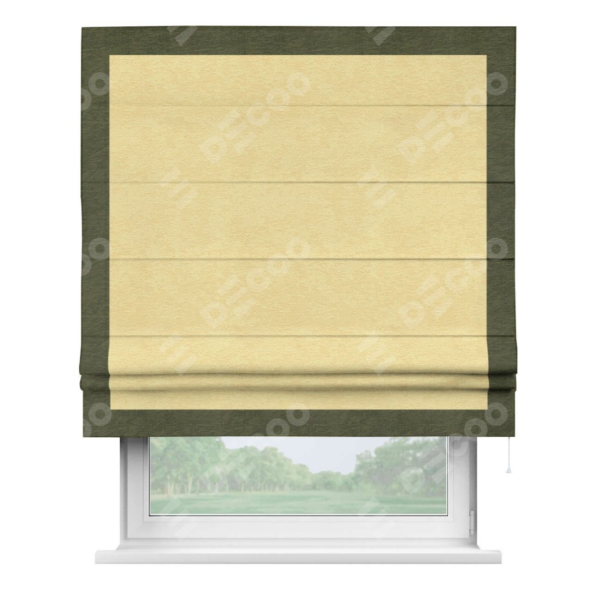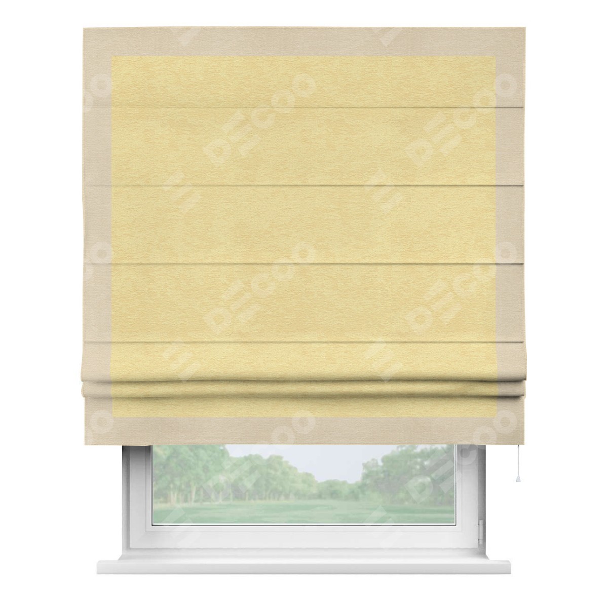Римская штора производителя «Cortin», используется для проёма, пошита из ткани софт однотонный золотой, артикул 42934. Отделка шторы кантом «Чесс», ткань для канта используется из софта разной расцветки на выбор. Имеет универсальный механизм и подходит для монтажа: на потолок, на стену и в нишу.
