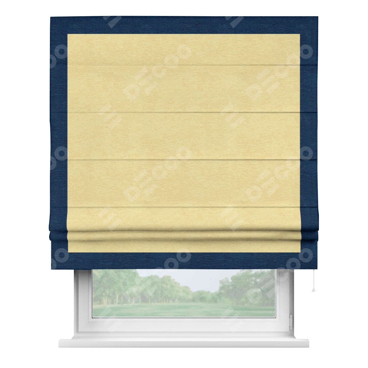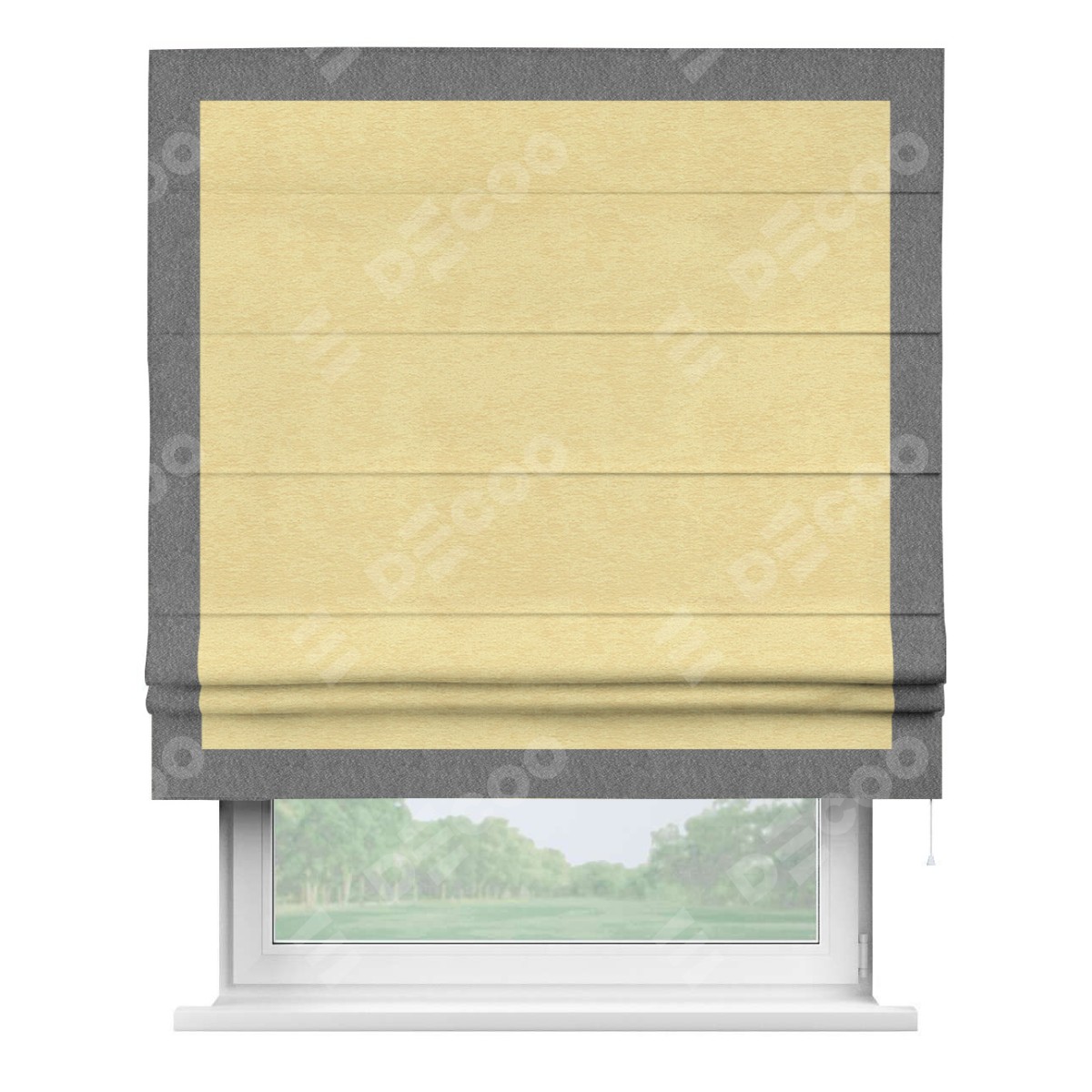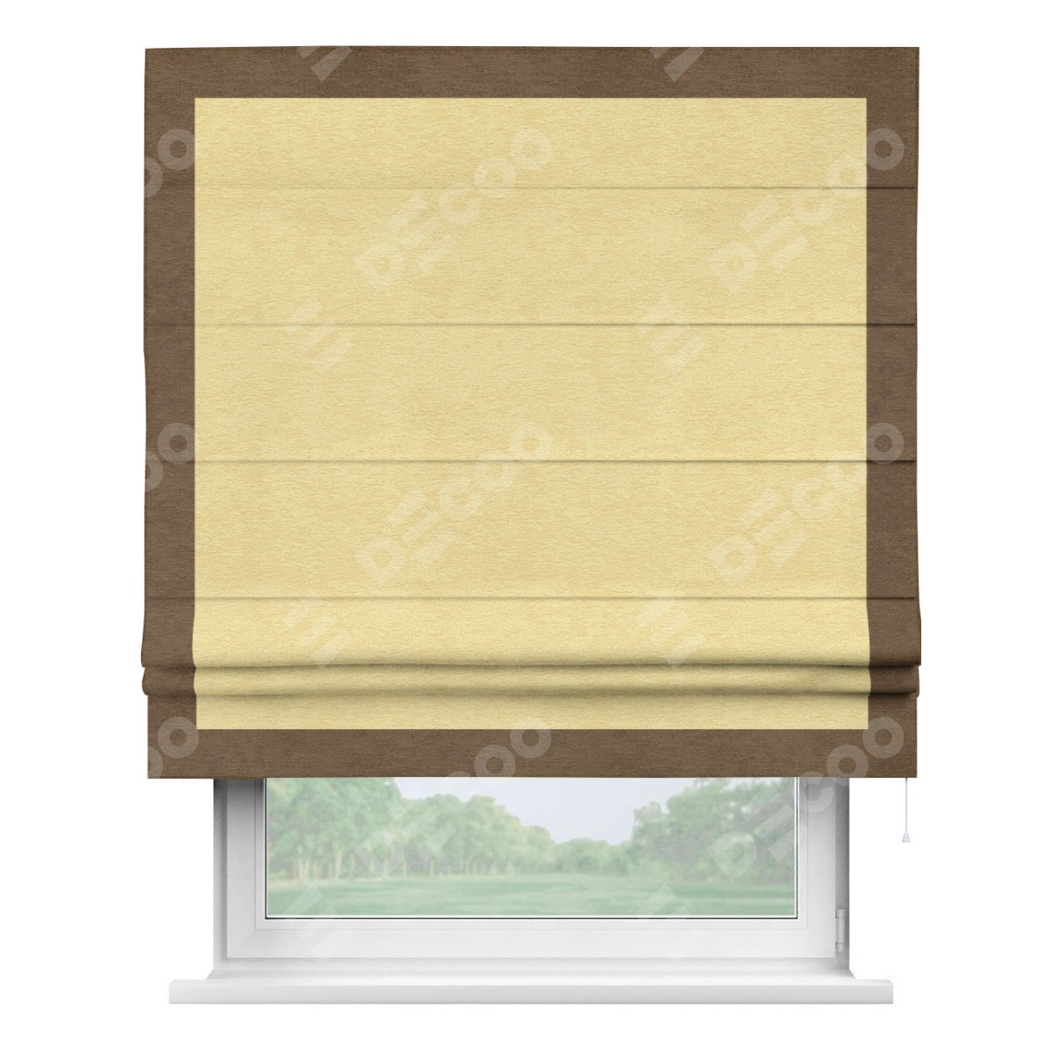 Римская штора производителя «Cortin», используется для проёма, пошита из ткани софт однотонный золотой, артикул 42934. Отделка шторы кантом «Чесс», ткань для канта используется из софта разной расцветки на выбор. Имеет универсальный механизм и подходит для монтажа: на потолок, на стену и в нишу.