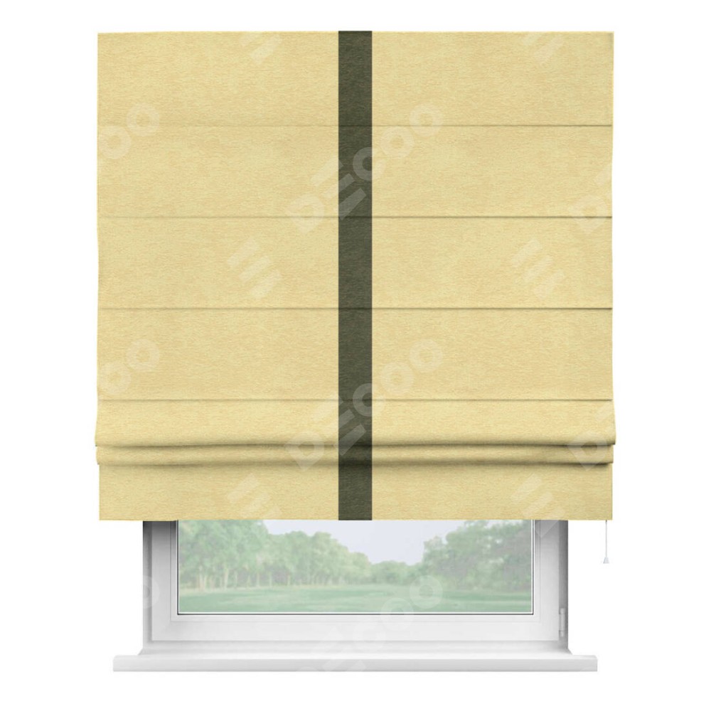 Римская штора производителя «Cortin», используется для проёма, пошита из ткани софт однотонный золотой, артикул 42934. Отделка шторы кантом «Хайвэй», ткань для канта используется из софта разной расцветки на выбор. Имеет универсальный механизм и подходит для монтажа: на потолок, на стену и в нишу.