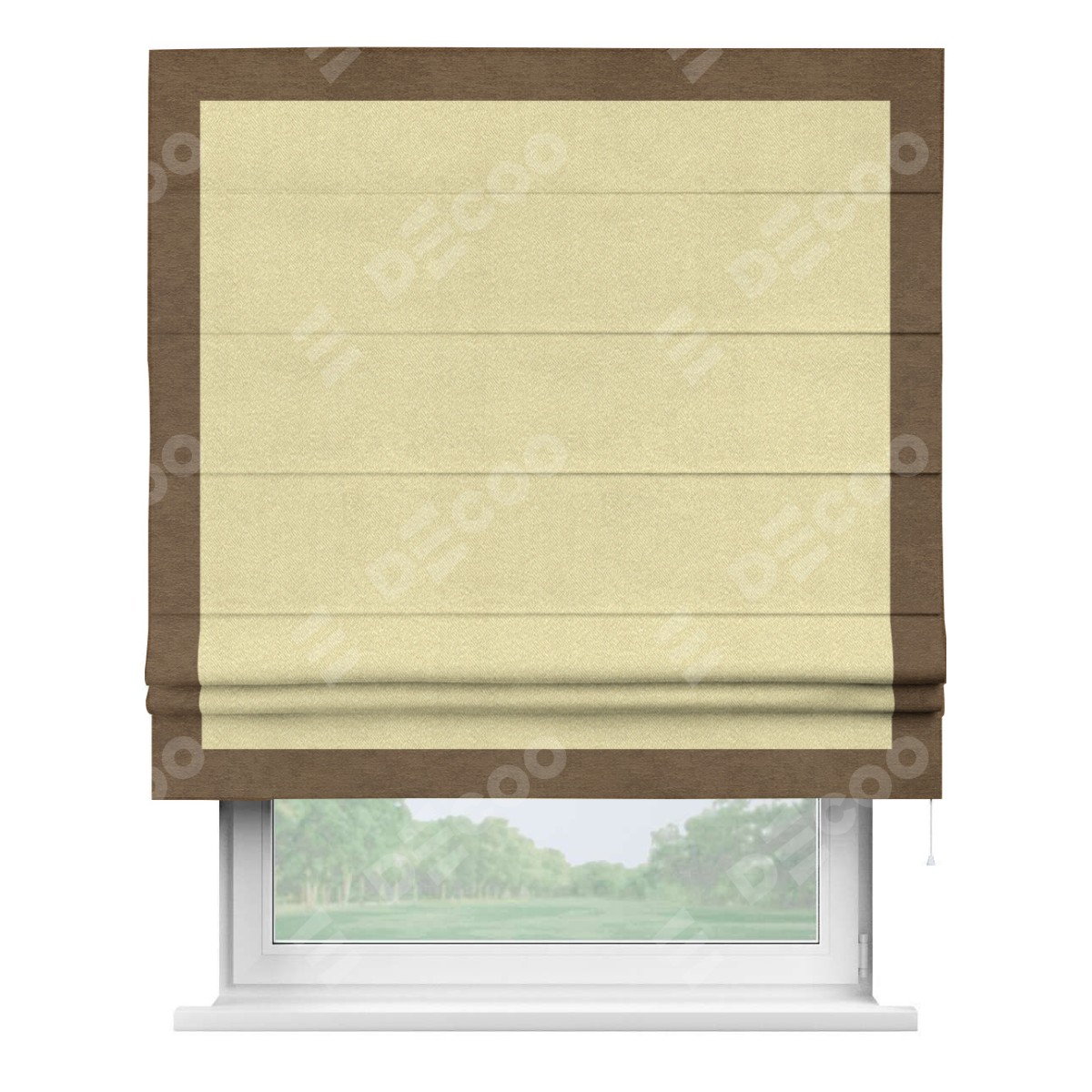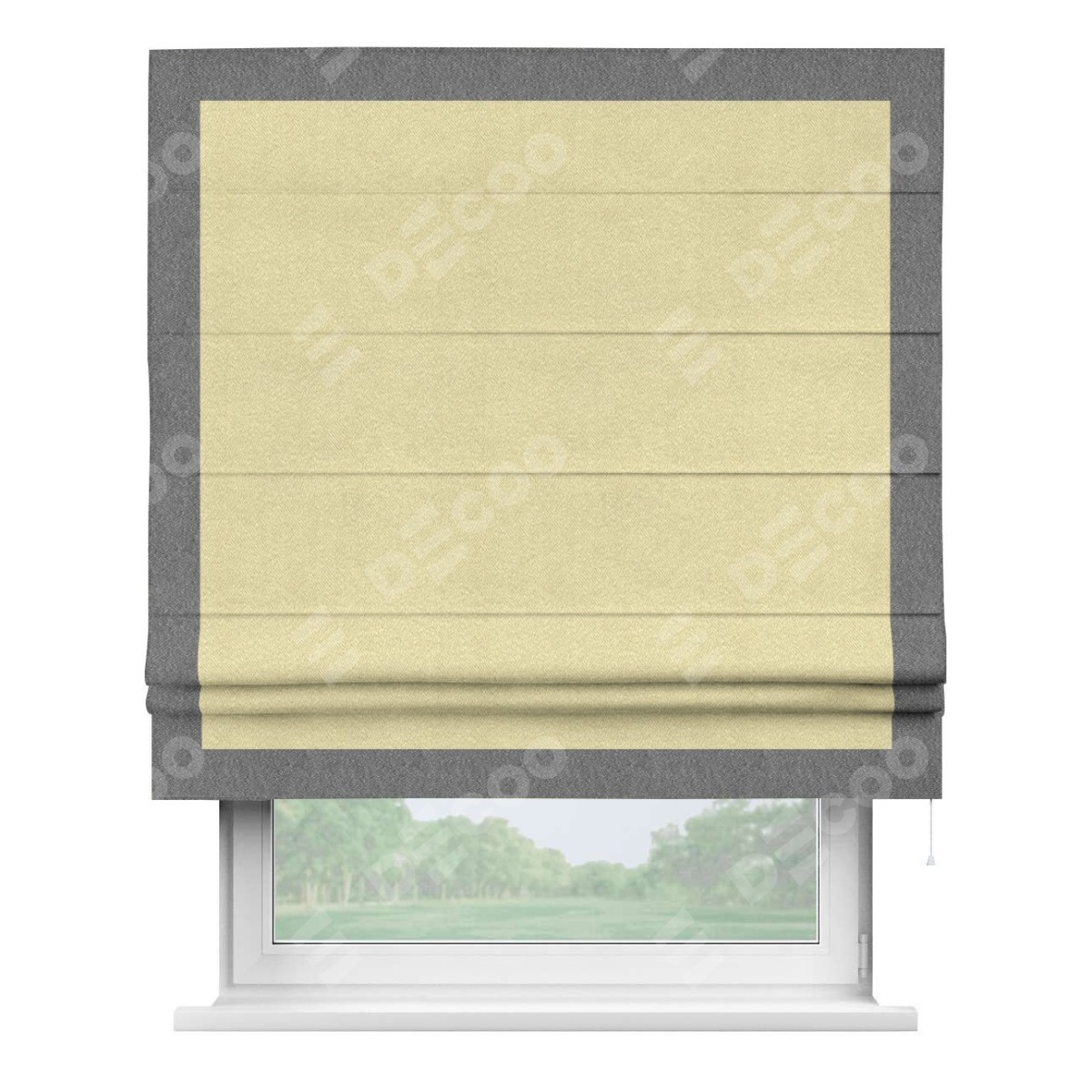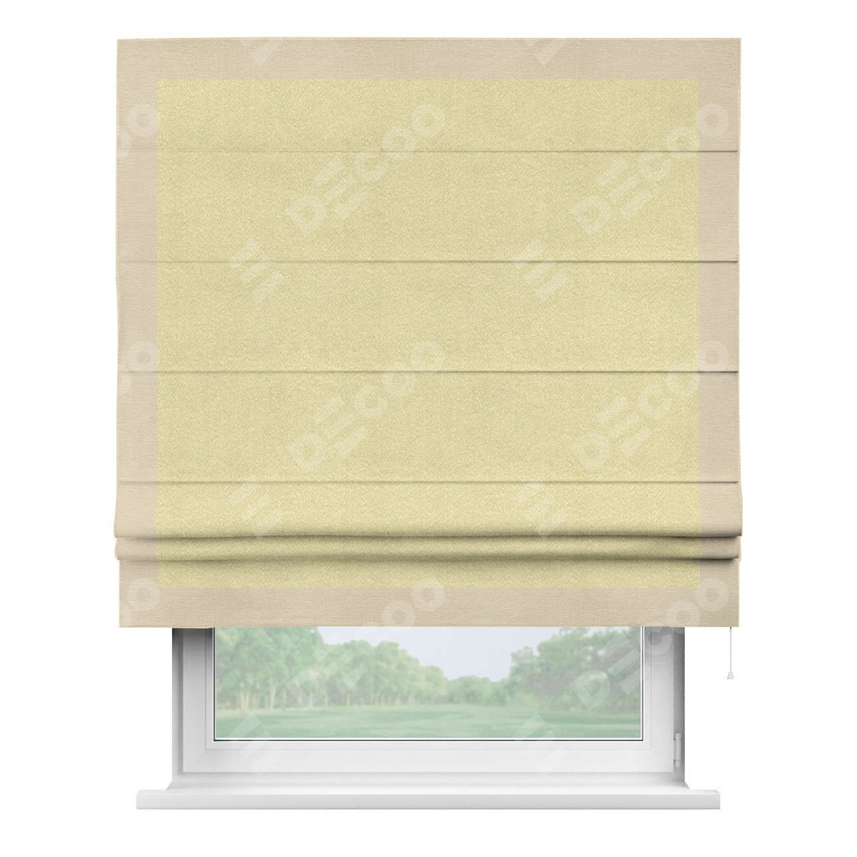 Римская штора производителя «Cortin», используется для проёма, пошита из ткани софт однотонный молочный, артикул 11938. Отделка шторы кантом «Чесс», ткань для канта используется из софта разной расцветки на выбор. Имеет универсальный механизм и подходит для монтажа: на потолок, на стену и в нишу.