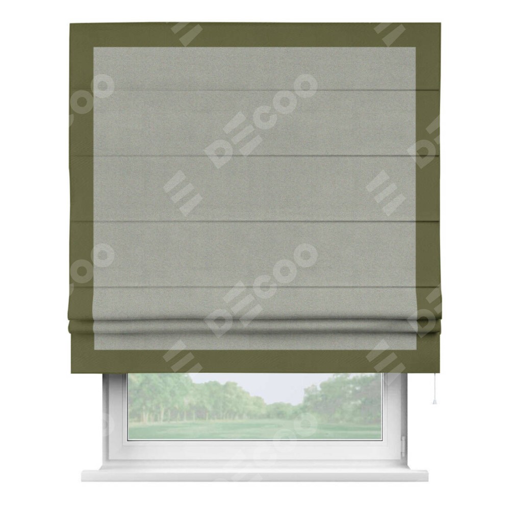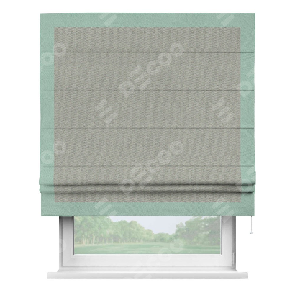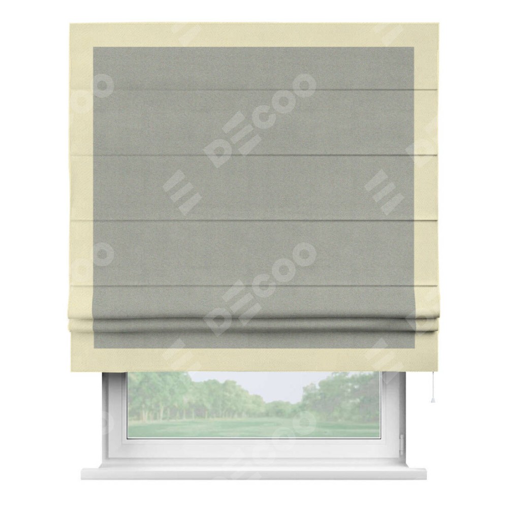 Римская штора производителя «Cortin», используется для проёма, пошита из ткани блэкаут однотонный серый, артикул ткани 88292. Отделка шторы кантом «Чесс», ткань для канта используется из блэкаута однотонного разной расцветки на выбор. Имеет универсальный механизм и подходит для монтажа: на потолок, на стену и в нишу.