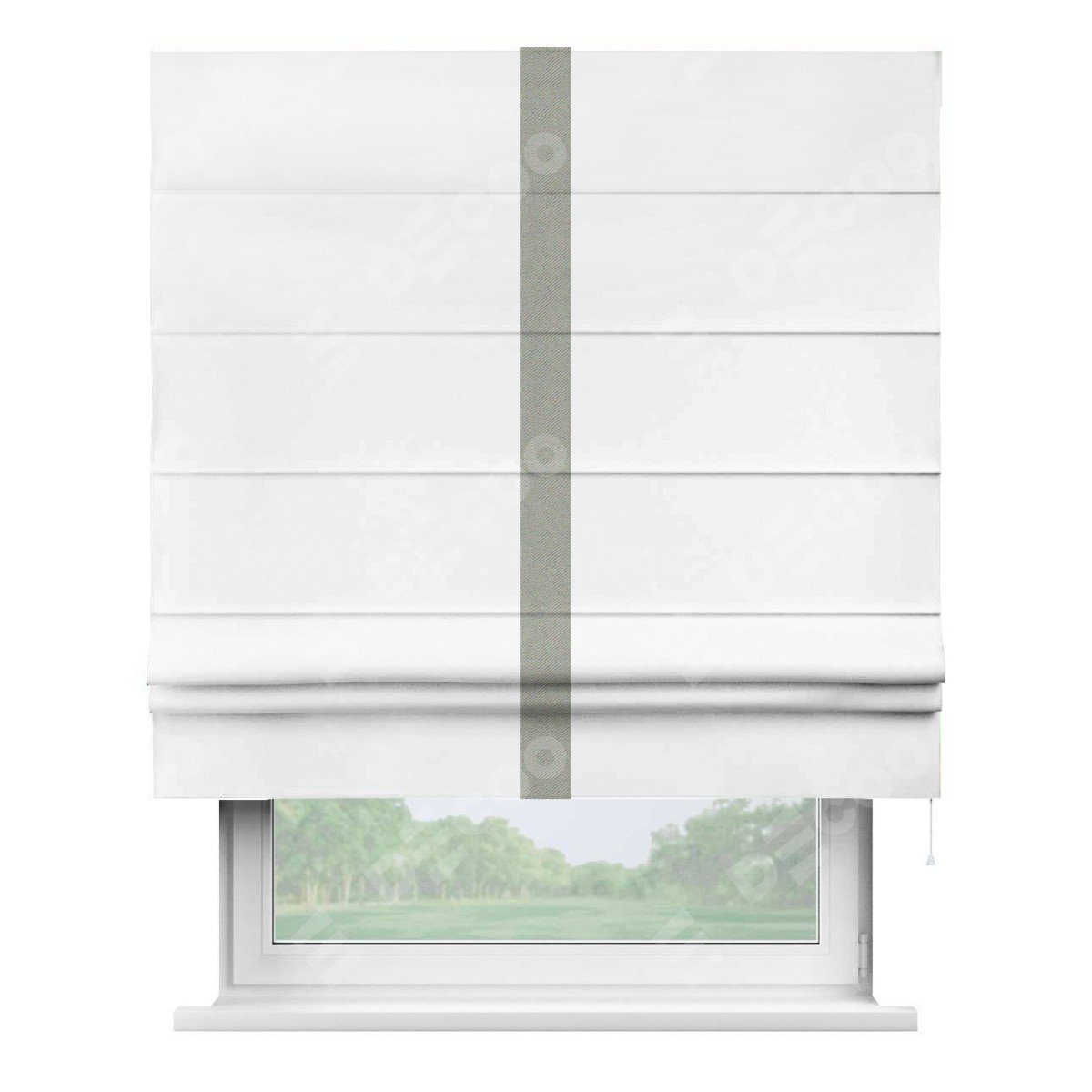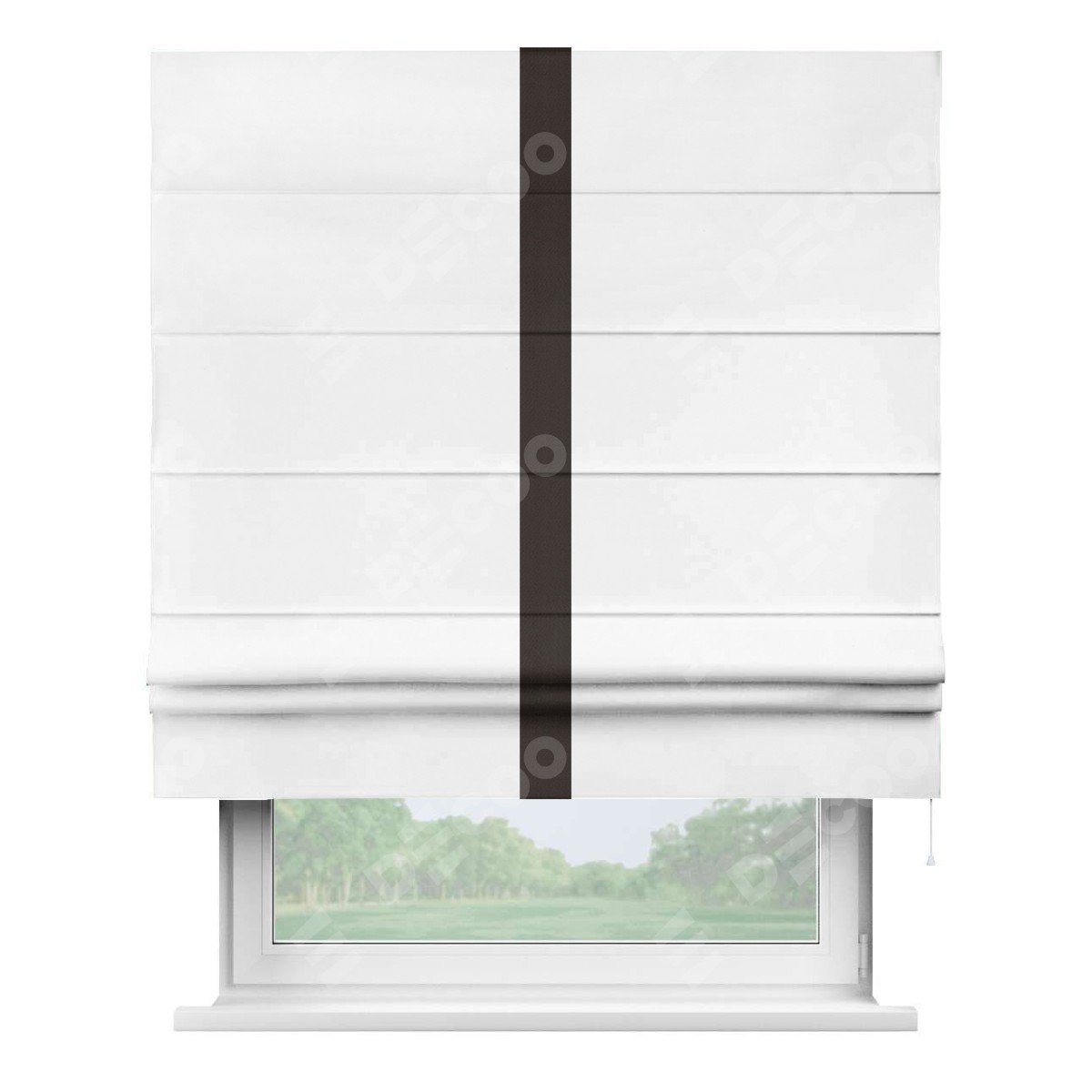 Римская штора производителя «Cortin», используется для проёма, пошита из ткани однотонная белоснежная, артикул ткани 41217. Отделка шторы кантом «Хайвей», ткань для канта используется из блэкаута однотонного разной расцветки на выбор. Имеет универсальный механизм и подходит для монтажа: на потолок, на стену и в нишу.