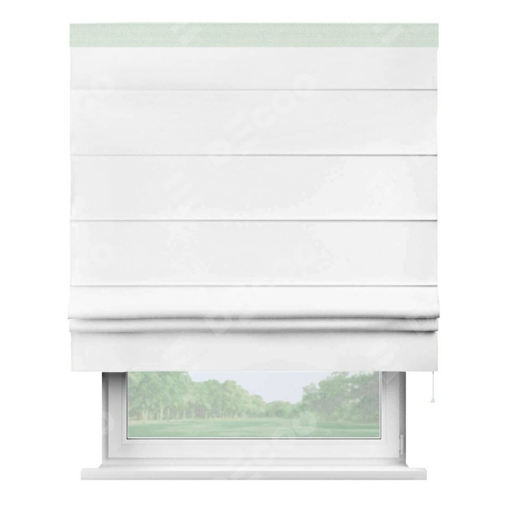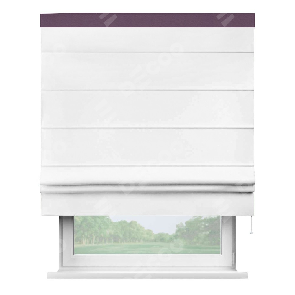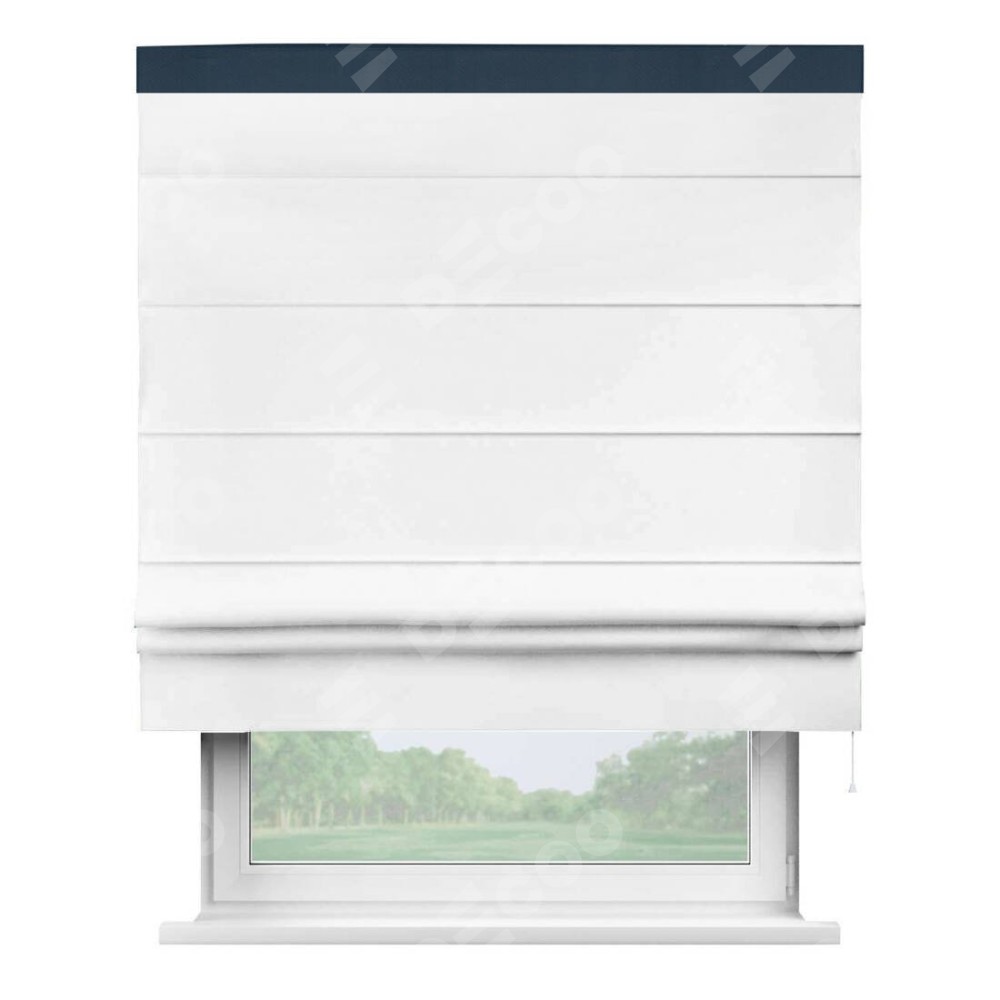 Римская штора производителя «Cortin», используется для проёма, пошита из ткани однотонная белоснежная, артикул ткани 41217. Отделка шторы кантом «Кинг», ткань для канта используется из блэкаута однотонного разной расцветки на выбор. Имеет универсальный механизм и подходит для монтажа: на потолок, на стену и в нишу.