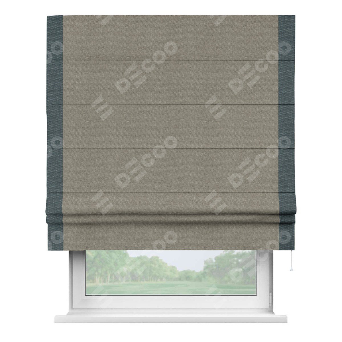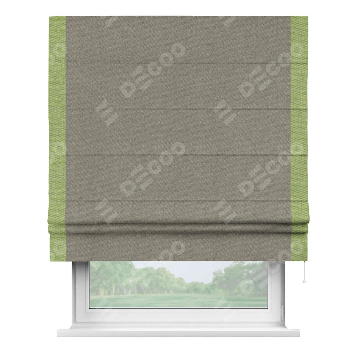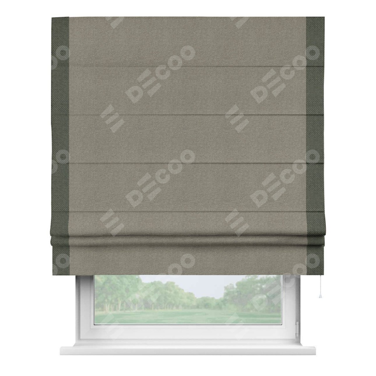 Римская штора производителя «Cortin», используется для проёма, пошита из ткани лён димаут cеро-зелёный, артикул 00003. Отделка шторы кантом «Стрим Дуо», ткань для канта используется из льна димаут разной расцветки на выбор. Имеет универсальный механизм и подходит для монтажа: на потолок, на стену и в нишу.