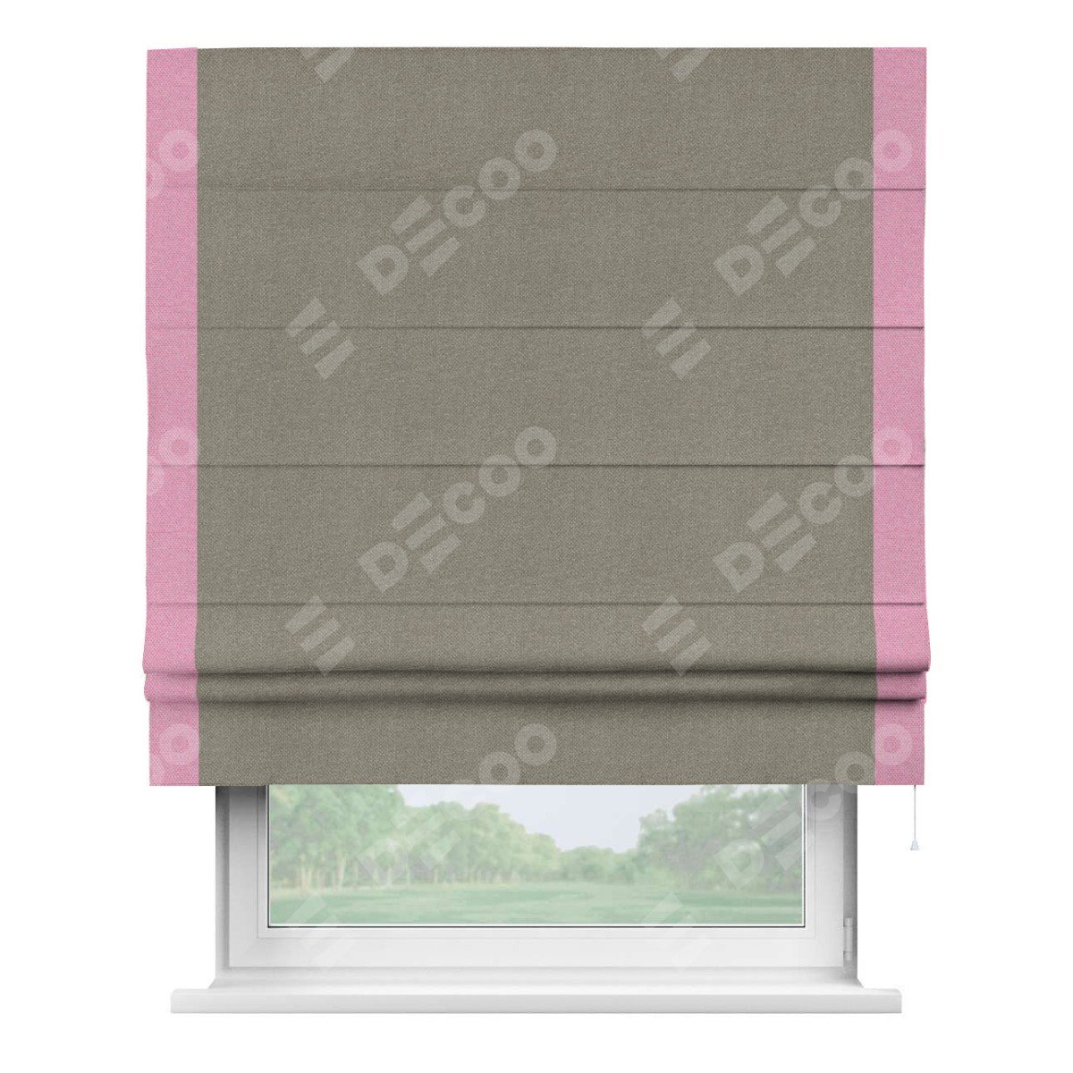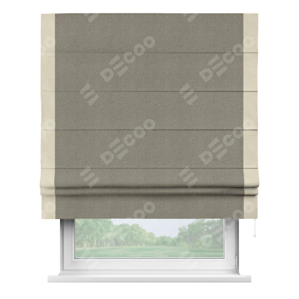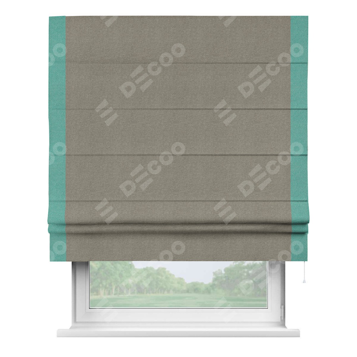 Римская штора производителя «Cortin», используется для проёма, пошита из ткани лён димаут cеро-зелёный, артикул 00003. Отделка шторы кантом «Стрим Дуо», ткань для канта используется из льна димаут разной расцветки на выбор. Имеет универсальный механизм и подходит для монтажа: на потолок, на стену и в нишу.