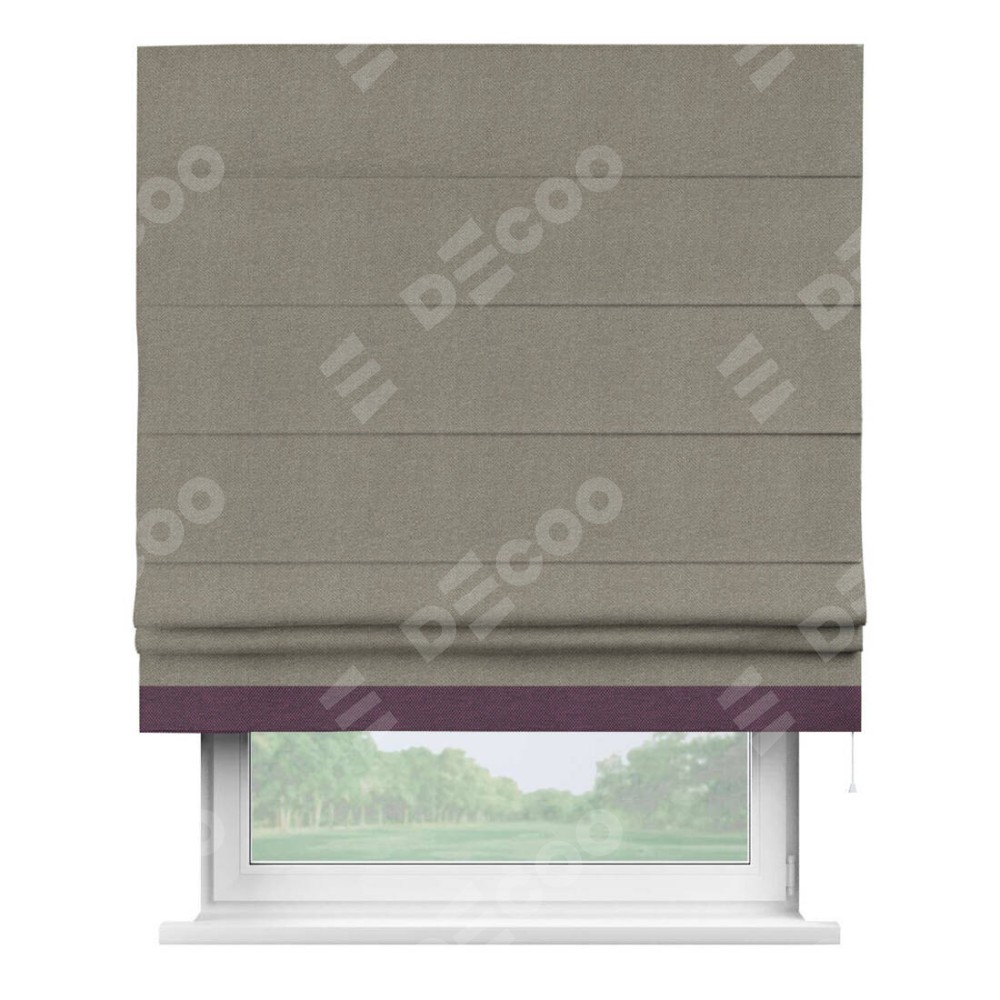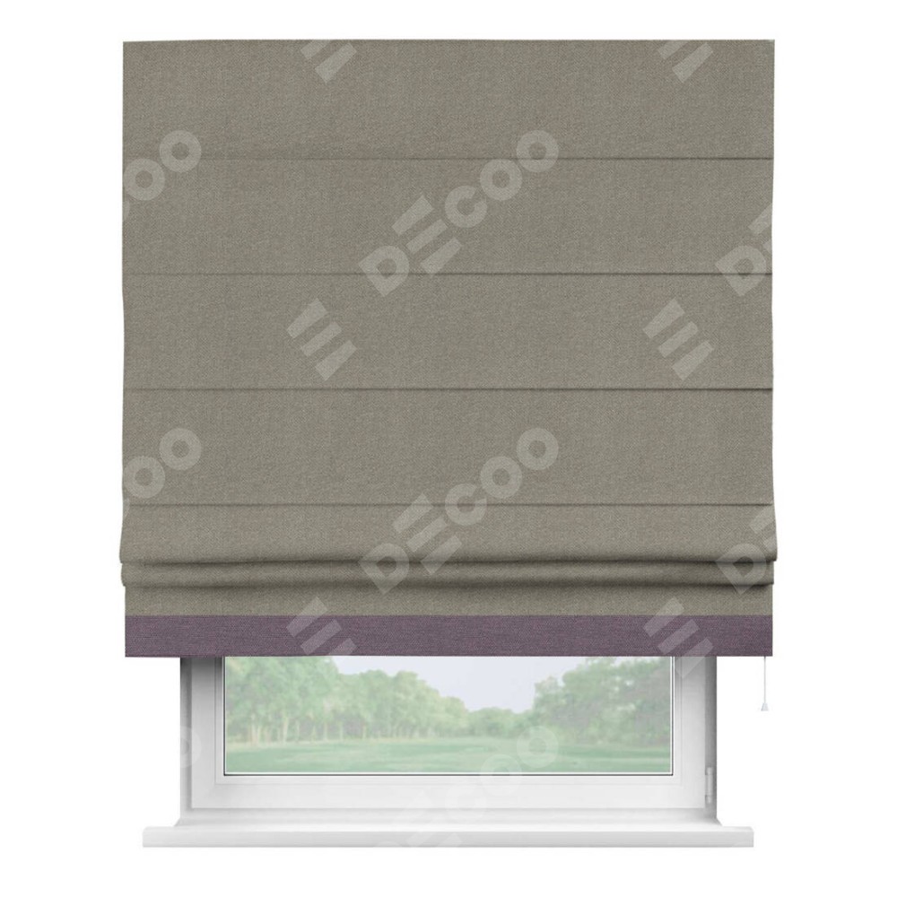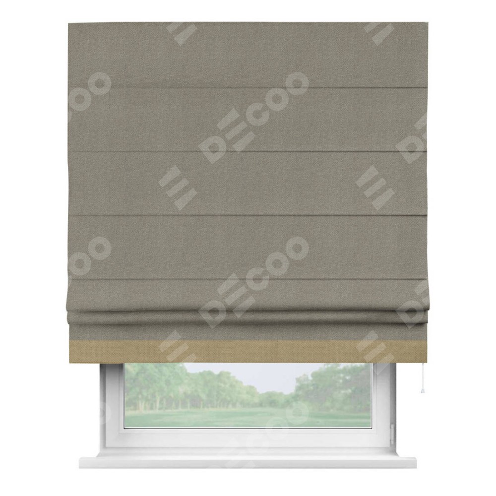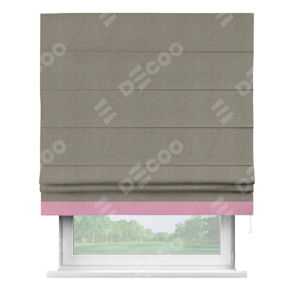Римская штора производителя «Cortin», используется для проёма, пошита из ткани лён димаут cеро-зелёный, артикул 00003. Отделка шторы кантом «Джестер», ткань для канта используется из льна димаут разной расцветки на выбор. Имеет универсальный механизм и подходит для монтажа: на потолок, на стену и в нишу.