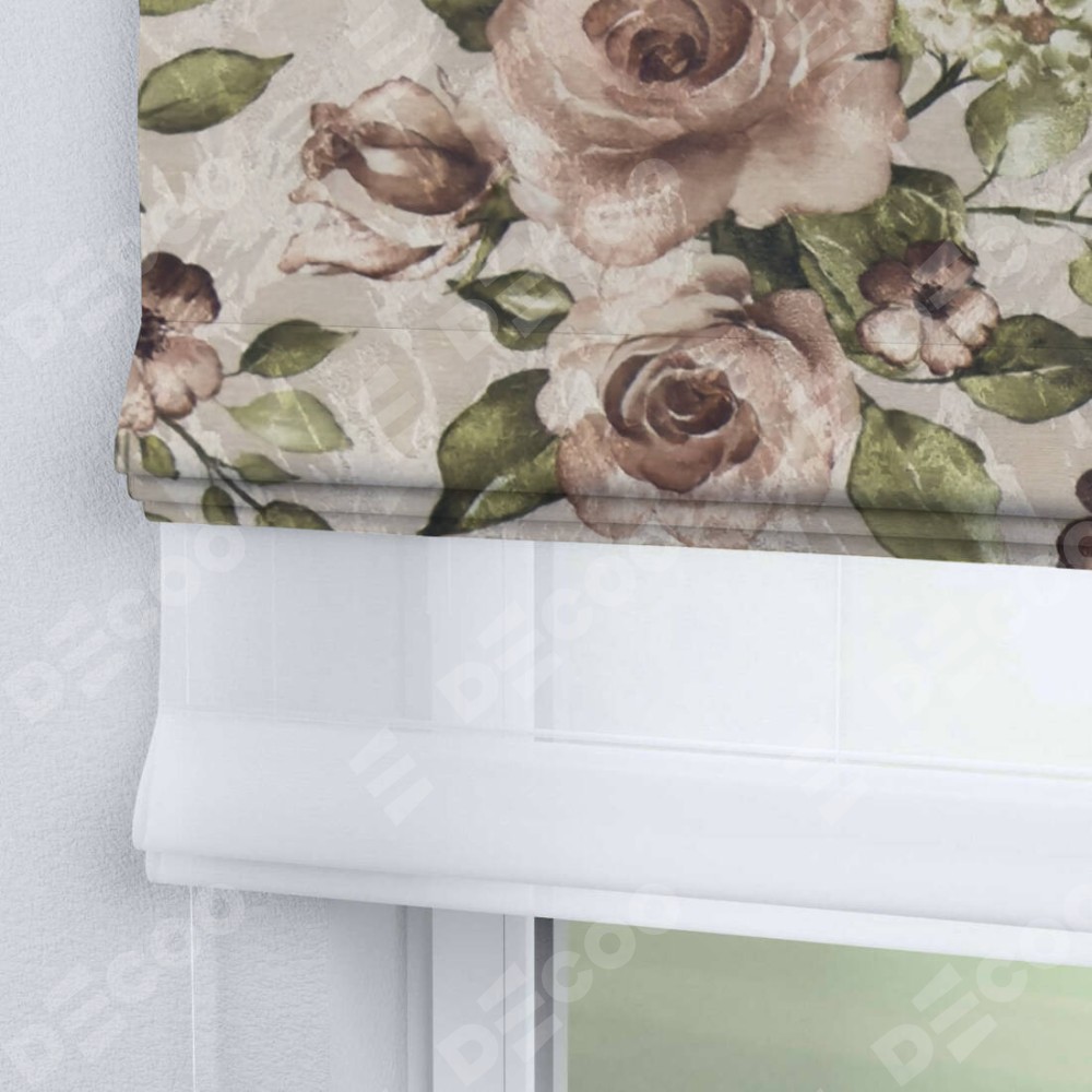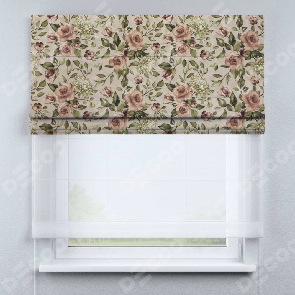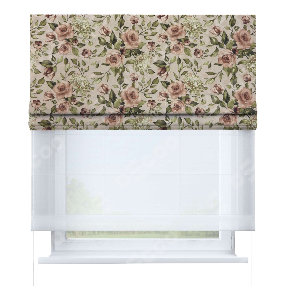 Римская штора день-ночь производителя «Cortin», используется для проёма, пошита из двух полотен, с лицевой стороны «Розы бежевые» артикул 34564, вторая ткань тюль (по стандарту комплектуется тюль белого цвета артикул V-01). Имеет универсальный механизм и подходит для монтажа: на потолок, на стену и в нишу.