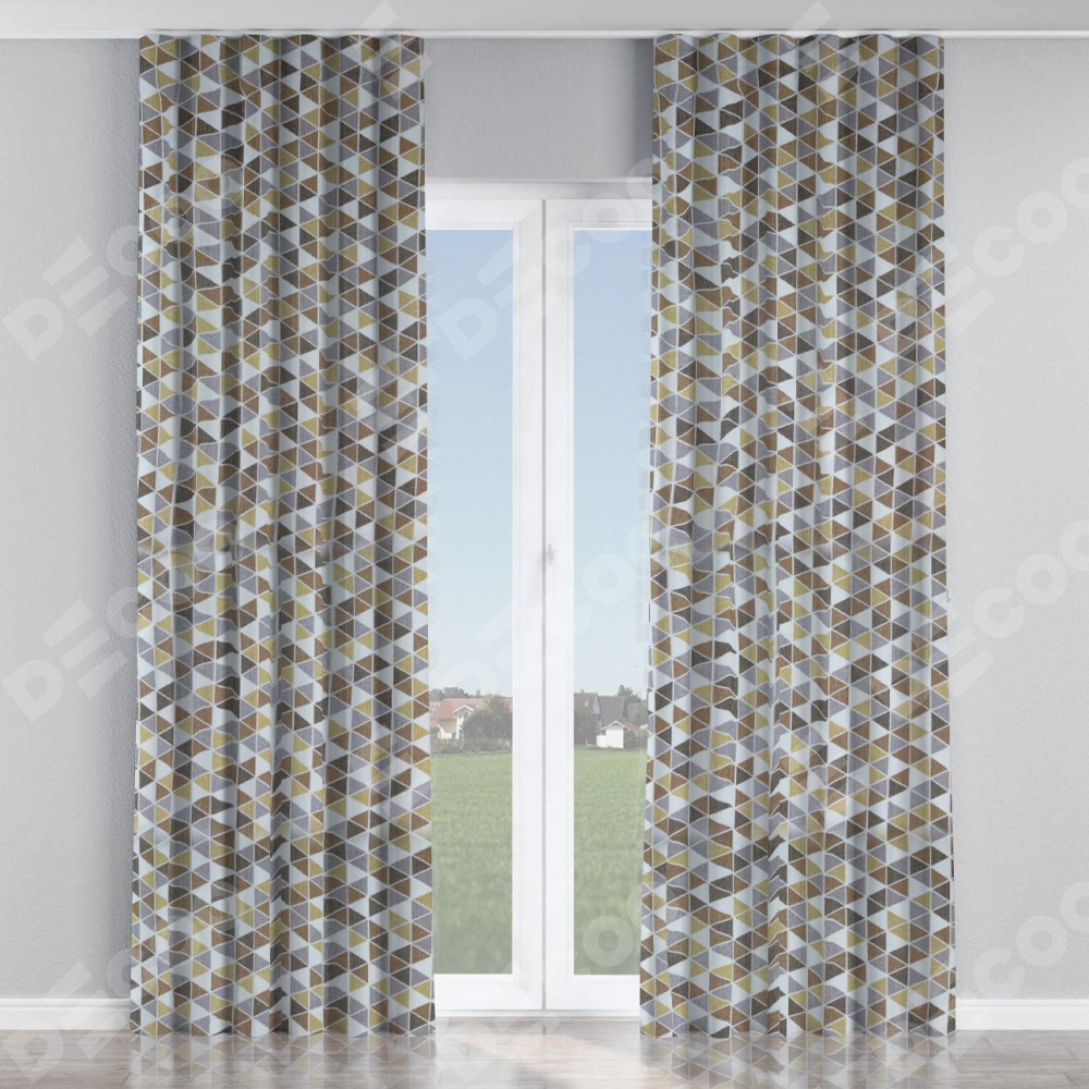 Комплект прямых штор, от производителя «Cortin», пошиты из ткани димаут «Треугольники коричневые», артикул ткани 23021. С изнаночной стороны в верхней части штор пристрачивается шторная лента с декоративными складками «Волна». Для создания элегантных складок прямые шторы шьются по стандарту с коэффициентом 1:2 (на 100 см. ширины проёма 200 см. ширины ткани).