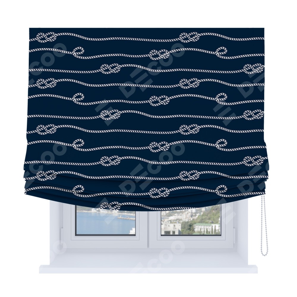 Римская штора Soft производителя «Cortin», используется для проёма, пошита из ткани блэкаут с нанесением сублимационной печати «Морской узел». Имеет универсальный механизм и подходит для монтажа: на потолок, на стену и в нишу. В отличие от стандартных римских штор, римская штора Soft не имеет горизонтальных вставок и нижнего отвеса. Это позволяет ткани произвольно драпироваться в свободные мягкие складки.