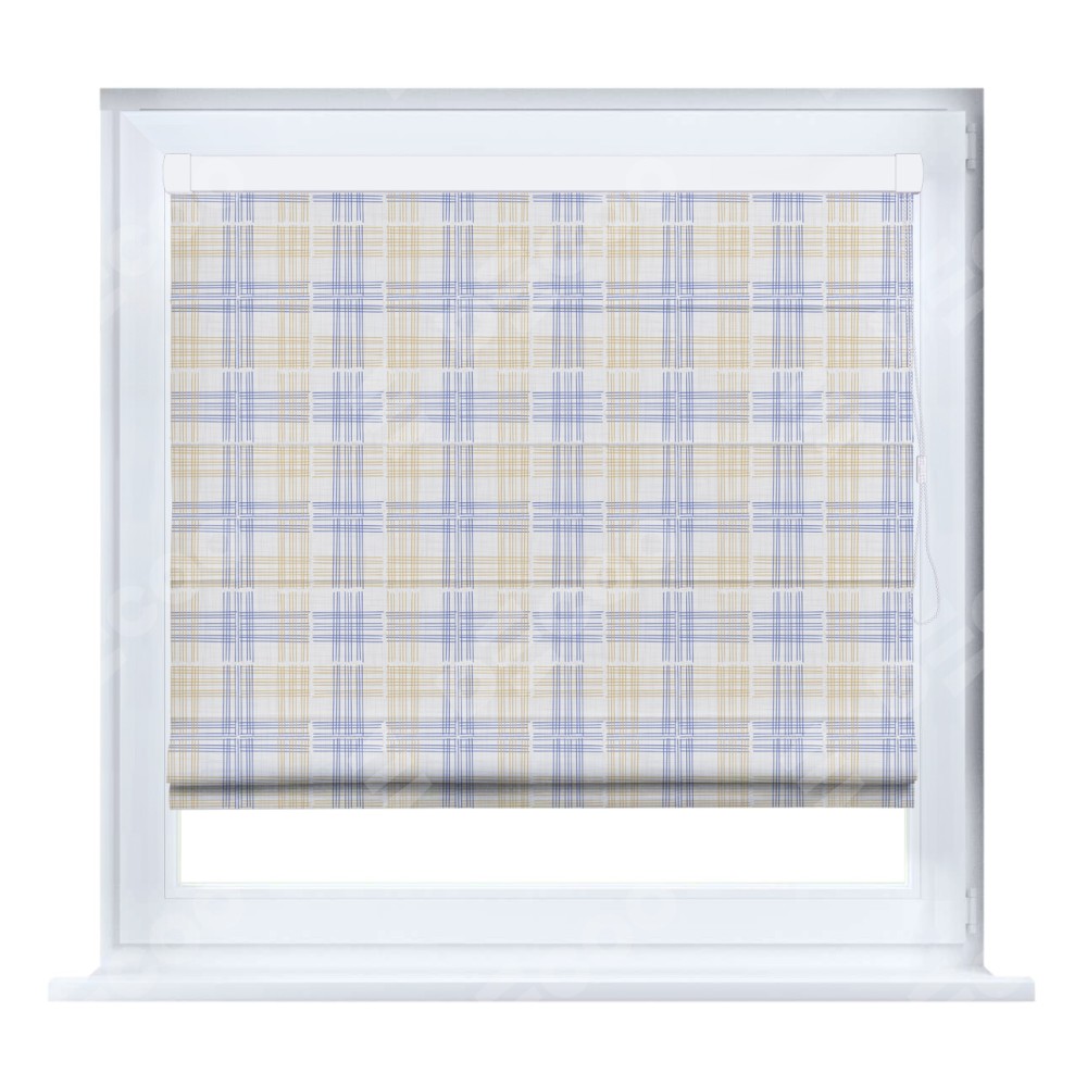 Римская штора кассетного типа, производителя «Cortin», устанавливается только на пластиковые окна и прилегает к стеклопакету, пошита из ткани блэкаут с нанесением сублимационной печати «Клетки кантри».