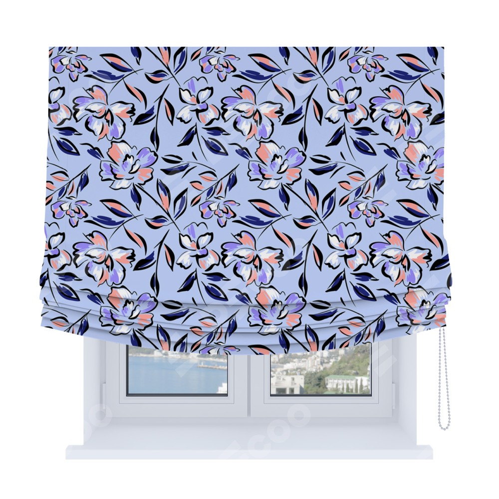 Римская штора Soft производителя «Cortin», используется для проёма, пошита из ткани блэкаут с нанесением сублимационной печати «Цветочки и листочки». Имеет универсальный механизм и подходит для монтажа: на потолок, на стену и в нишу. В отличие от стандартных римских штор, римская штора Soft не имеет горизонтальных вставок и нижнего отвеса. Это позволяет ткани произвольно драпироваться в свободные мягкие складки.