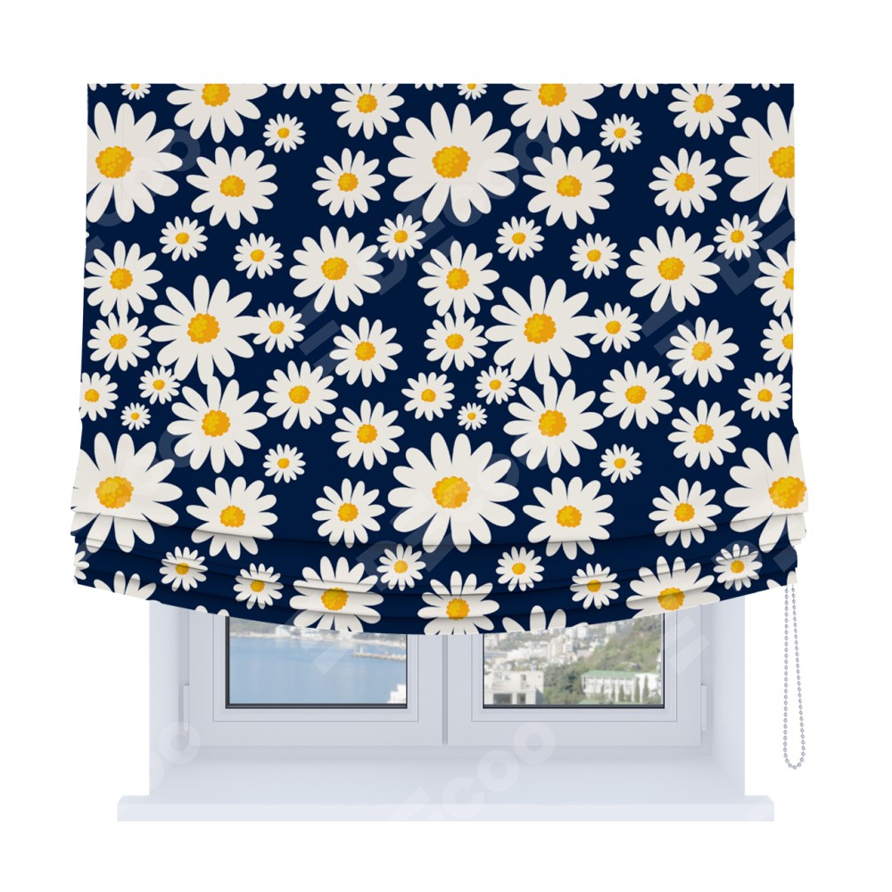 Римская штора Soft производителя «Cortin», используется для проёма, пошита из ткани блэкаут с нанесением сублимационной печати «Яркие ромашки». Имеет универсальный механизм и подходит для монтажа: на потолок, на стену и в нишу. В отличие от стандартных римских штор, римская штора Soft не имеет горизонтальных вставок и нижнего отвеса. Это позволяет ткани произвольно драпироваться в свободные мягкие складки.