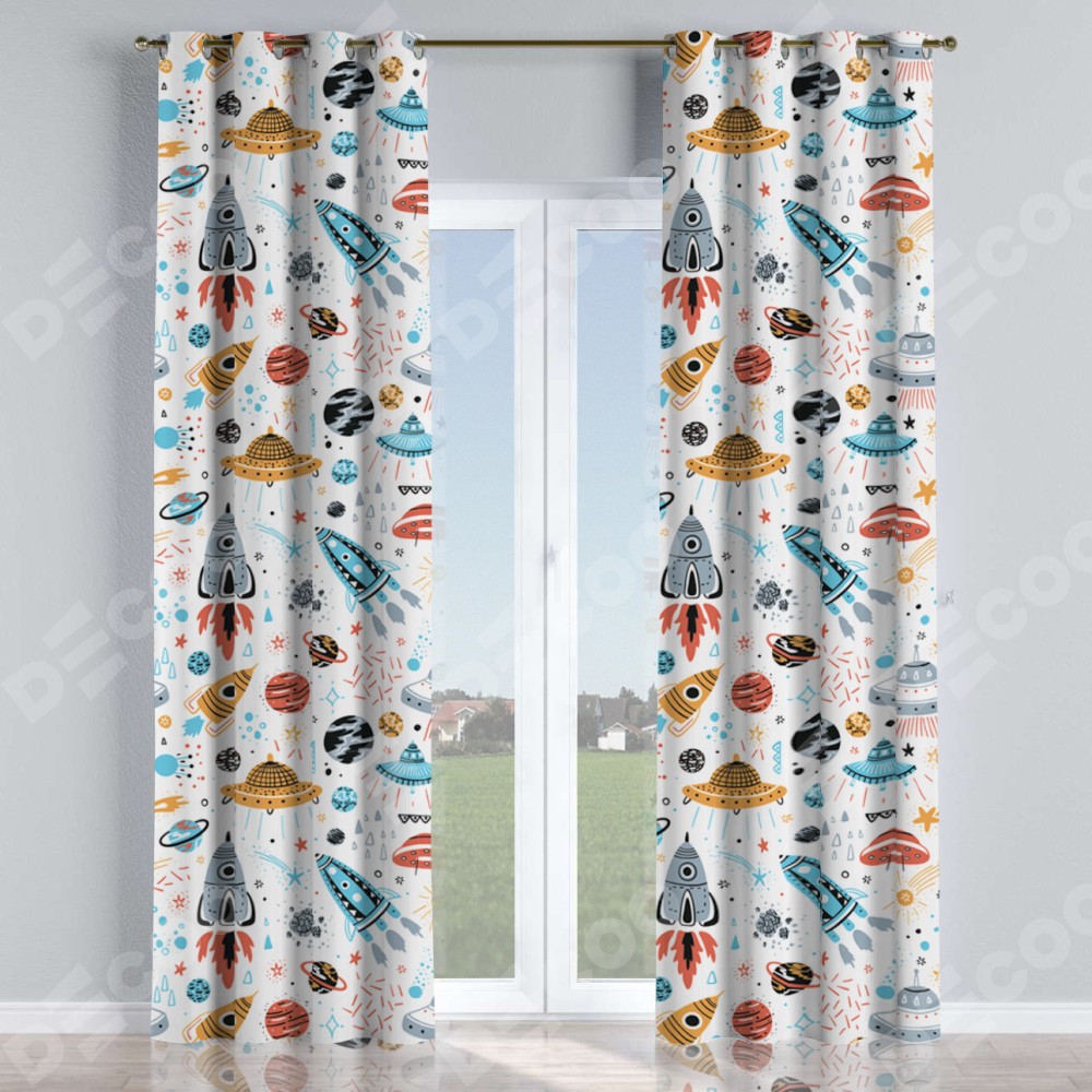 Комплект прямых штор, от производителя «Cortin», пошиты из ткани блэкаут с нанесением сублимационной печати «Космическое приключение». Данная модель пошита на люверсах, комплектуется на выбор круглым карнизом и подходит для монтажа на стену или потолок. Прямые шторы на люверсах шьются по стандарту с коэффициентом 1/2 (на 100 см. ширины проёма 200 см. ширины ткани), отличительным преимуществом данной модели является простой способ монтажа. Достаточно повесить ее на трубу и штора готова!