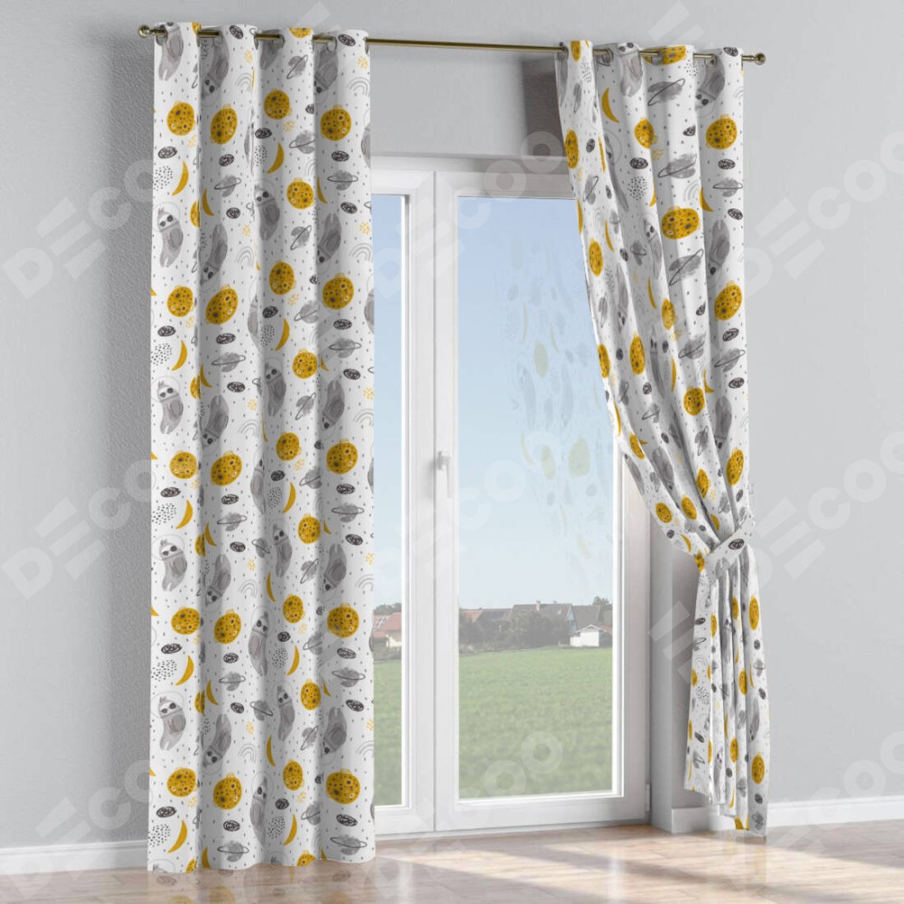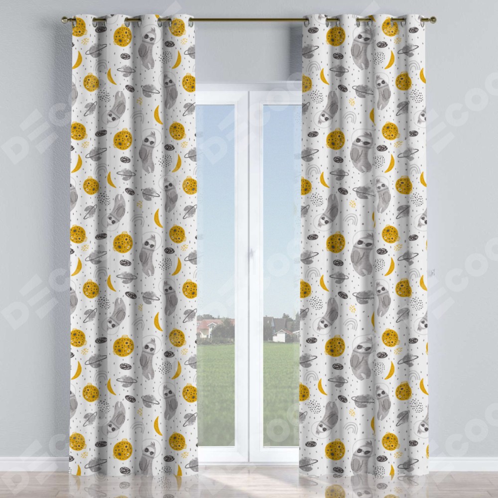 Комплект прямых штор, от производителя «Cortin», пошиты из ткани блэкаут с нанесением сублимационной печати «Ленивец в шлеме». Данная модель пошита на люверсах, комплектуется на выбор круглым карнизом и подходит для монтажа на стену или потолок. Прямые шторы на люверсах шьются по стандарту с коэффициентом 1/2 (на 100 см. ширины проёма 200 см. ширины ткани), отличительным преимуществом данной модели является простой способ монтажа. Достаточно повесить ее на трубу и штора готова!