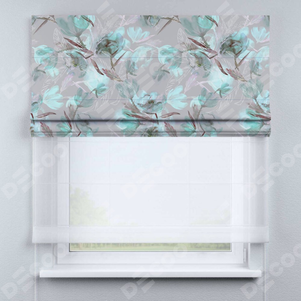 Римская штора день-ночь производителя «Cortin», используется для проёма, пошита из двух полотен, с лицевой блэкаут с нанесением сублимационной печати «Цветочная акварель», вторая ткань тюль (по стандарту комплектуется тюль белого цвета артикул V-01). Имеет универсальный механизм и подходит для монтажа: на потолок, на стену и в нишу.