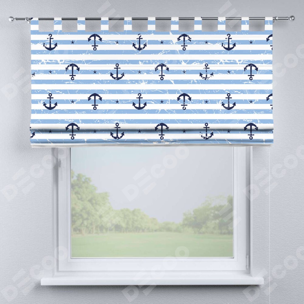Римская штора производителя «Cortin», используется для проёма, пошита из ткани блэкаут с нанесением сублимационной печати «Полоски и якори». Данная модель пошита на петлях, комплектуется на выбор круглым карнизом и подходит для монтажа на стену. Римская штора на петлях имеет простую систему регулировки высоты, отличительным преимуществом данной модели является простой способ монтажа. Достаточно повесить ее на трубу и штора готова!