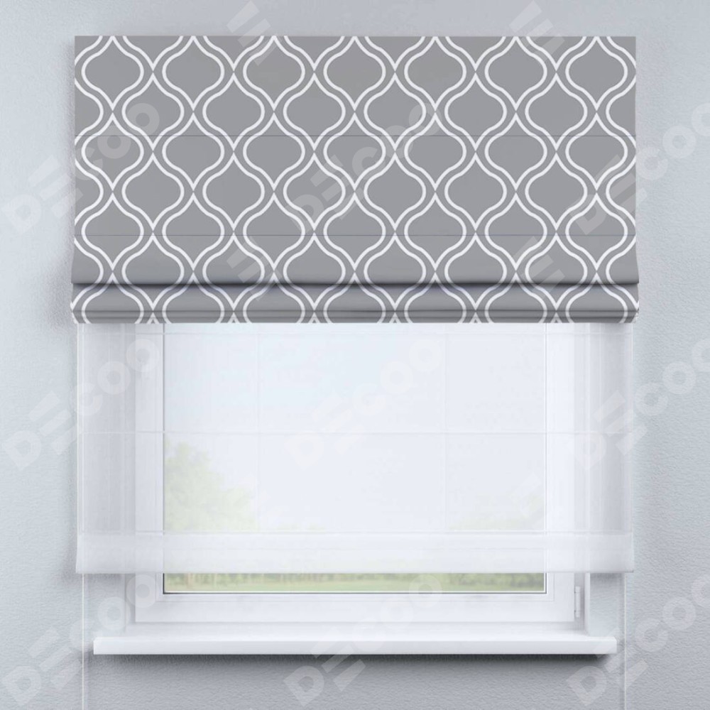Римская штора день-ночь производителя «Cortin», используется для проёма, пошита из двух полотен, с лицевой блэкаут с нанесением сублимационной печати «Тайны востока серый», вторая ткань тюль (по стандарту комплектуется тюль белого цвета артикул V-01). Имеет универсальный механизм и подходит для монтажа: на потолок, на стену и в нишу.