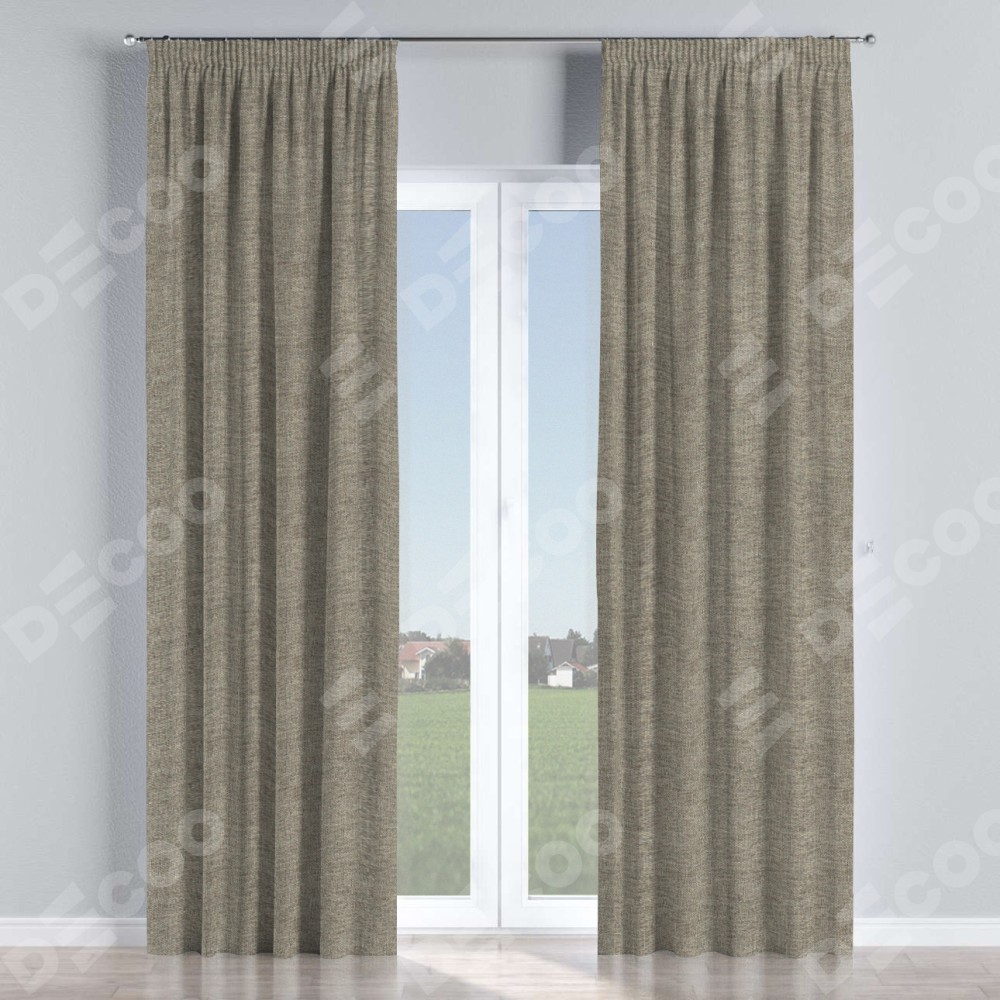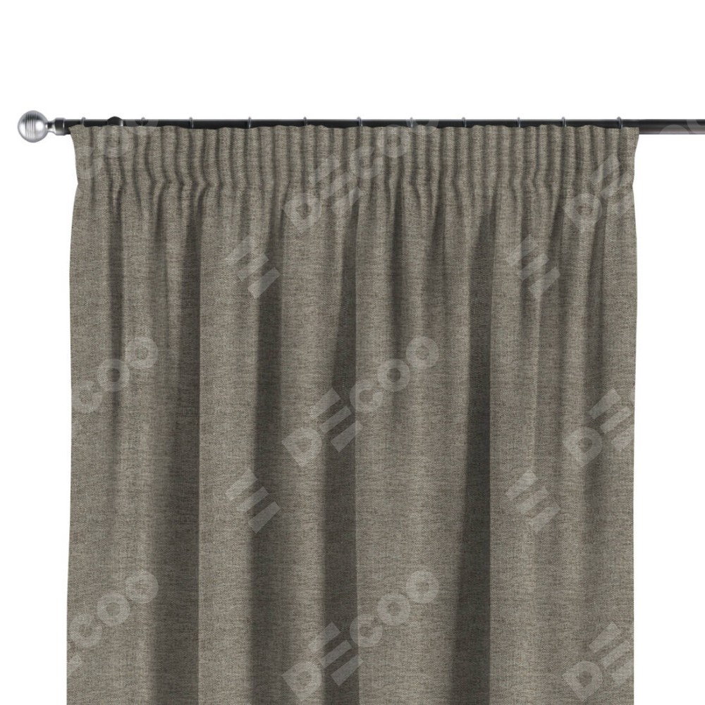 Комплект прямых штор, от производителя «Cortin», пошиты из ткани стиф димаут серо-коричневый, артикул ткани 44028. С изнаночной стороны в верхней части штор пристрачивается шторная лента с декоративными складками «Карандаш». Для создания элегантных складок прямые шторы шьются по стандарту с коэффициентом 1:2 (на 100 см. ширины проёма 200 см. ширины ткани).
