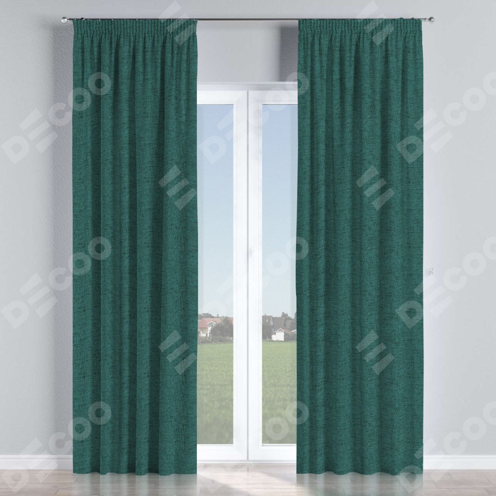 Комплект прямых штор, от производителя «Cortin», пошиты из ткани стиф димаут сине-зелёный, артикул ткани 18194. С изнаночной стороны в верхней части штор пристрачивается шторная лента с декоративными складками «Карандаш». Для создания элегантных складок прямые шторы шьются по стандарту с коэффициентом 1:2 (на 100 см. ширины проёма 200 см. ширины ткани).
