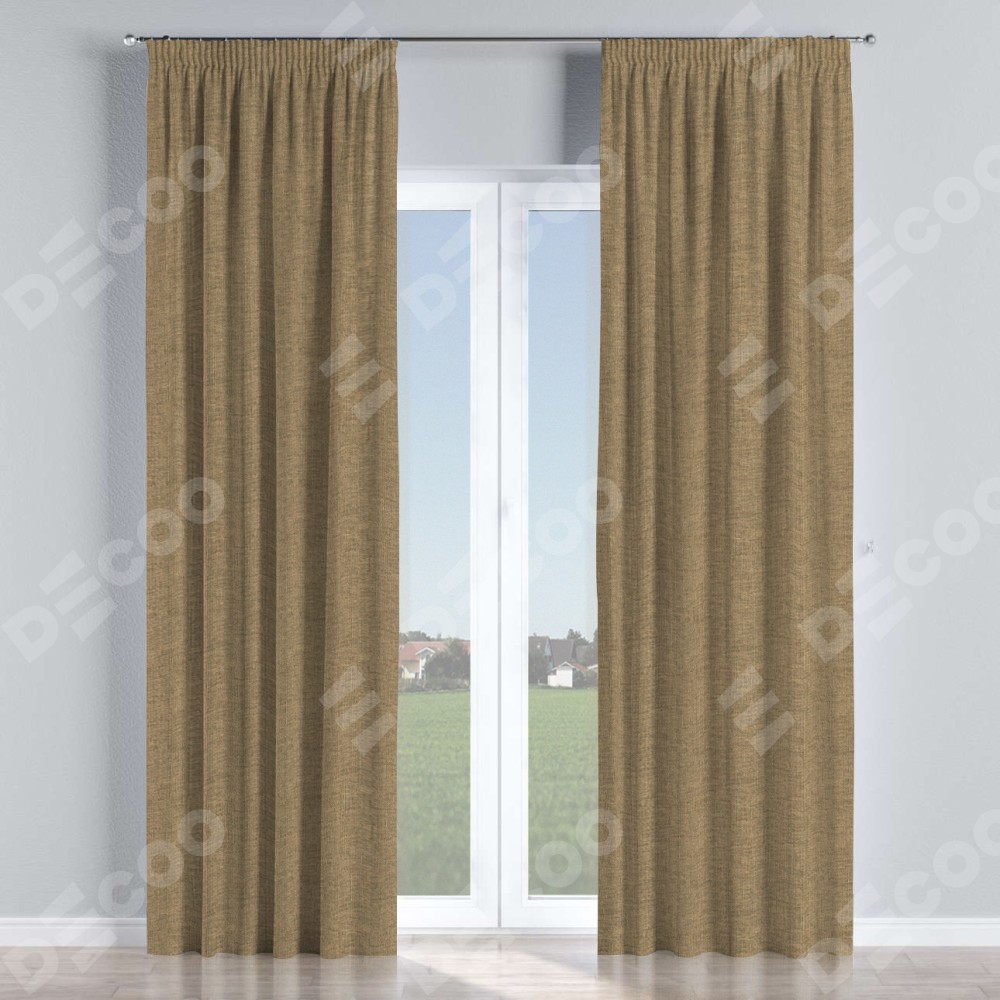 Комплект прямых штор, от производителя «Cortin», пошиты из ткани стиф димаут тёмно-бежевый, артикул ткани 18085. С изнаночной стороны в верхней части штор пристрачивается шторная лента с декоративными складками «Карандаш». Для создания элегантных складок прямые шторы шьются по стандарту с коэффициентом 1:2 (на 100 см. ширины проёма 200 см. ширины ткани).