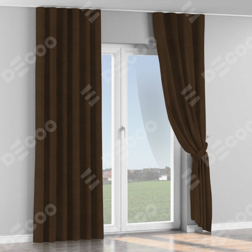 Комплект прямых штор, от производителя «Cortin», пошиты из ткани вельвет тёмно-коричневый, артикул ткани 30991. С изнаночной стороны в верхней части штор пристрачивается шторная лента с декоративными складками «Волна». Для создания элегантных складок прямые шторы шьются по стандарту с коэффициентом 1:2 (на 100 см. ширины проёма 200 см. ширины ткани).