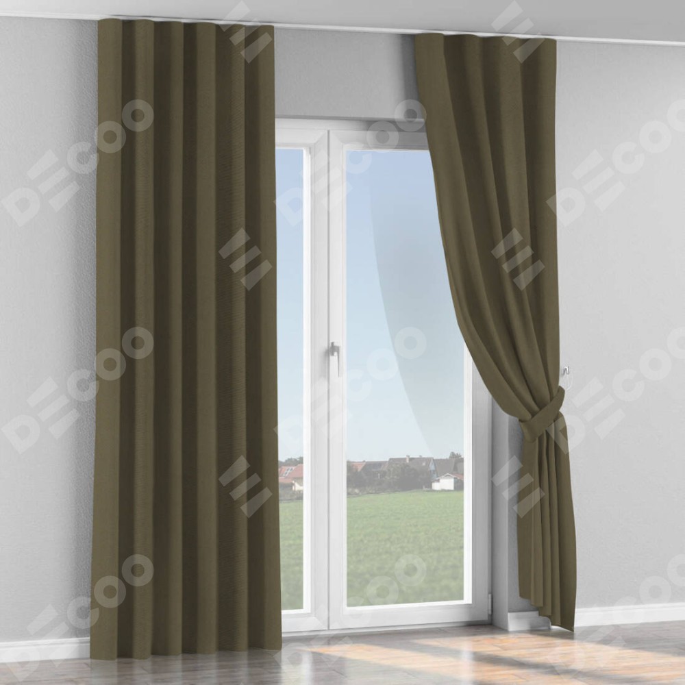 Комплект прямых штор, от производителя «Cortin», пошиты из ткани блэкаут однотонный кофейный, артикул ткани 6668−22. С изнаночной стороны в верхней части штор пристрачивается шторная лента с декоративными складками «Волна». Для создания элегантных складок прямые шторы шьются по стандарту с коэффициентом 1:2 (на 100 см. ширины проёма 200 см. ширины ткани).