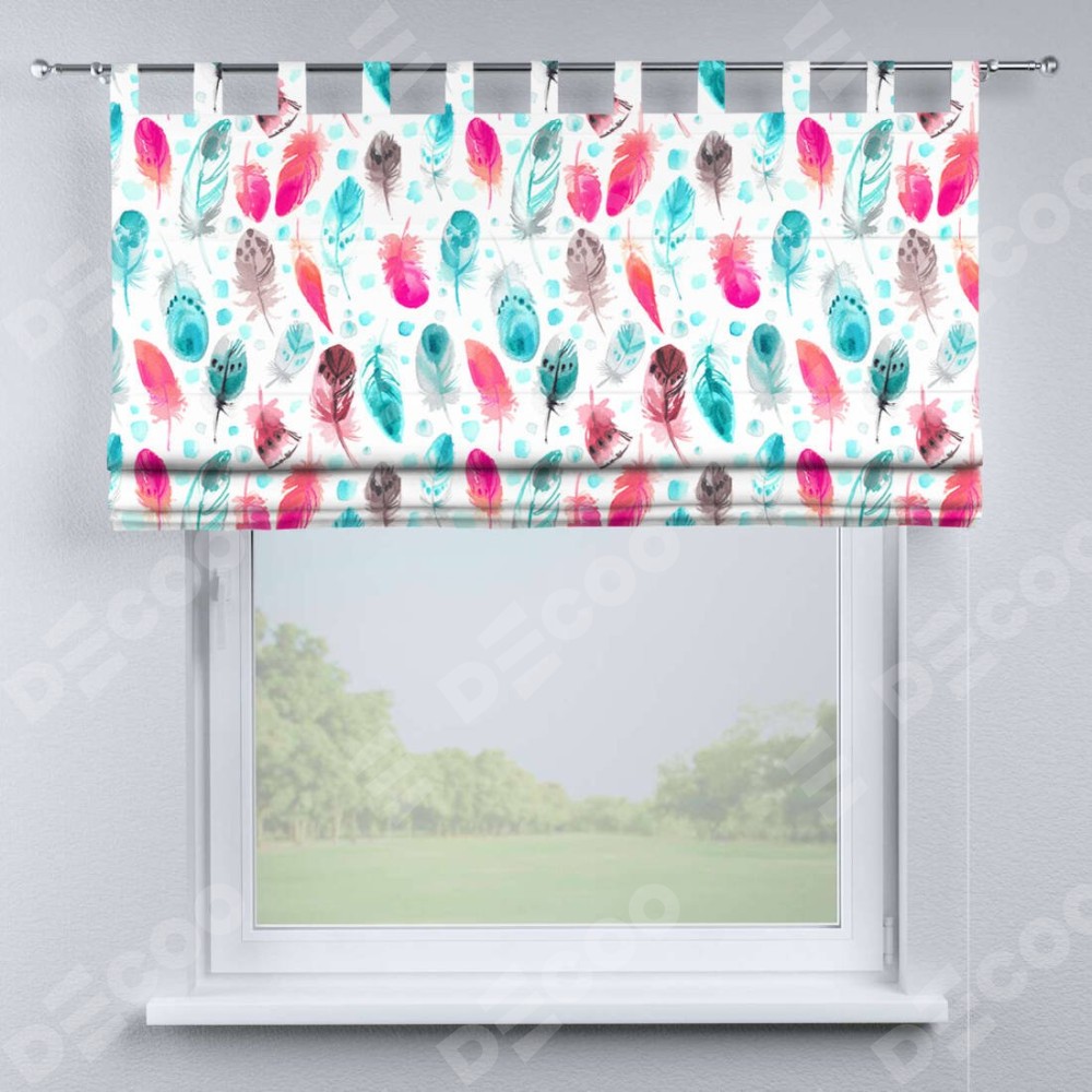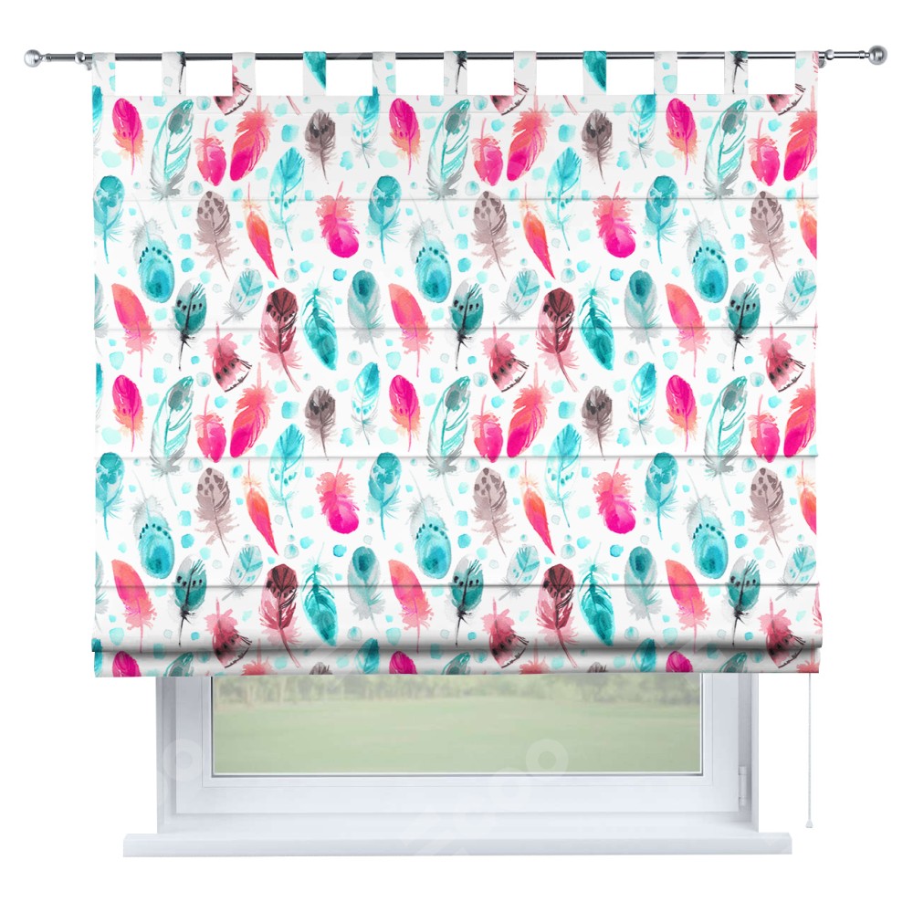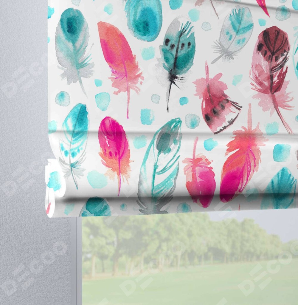 Римская штора производителя «Cortin», используется для проёма, пошита из ткани блэкаут с нанесением сублимационной печати «Перья». Данная модель пошита на петлях, комплектуется на выбор круглым карнизом и подходит для монтажа на стену. Римская штора на петлях имеет простую систему регулировки высоты, отличительным преимуществом данной модели является простой способ монтажа. Достаточно повесить ее на трубу и штора готова!