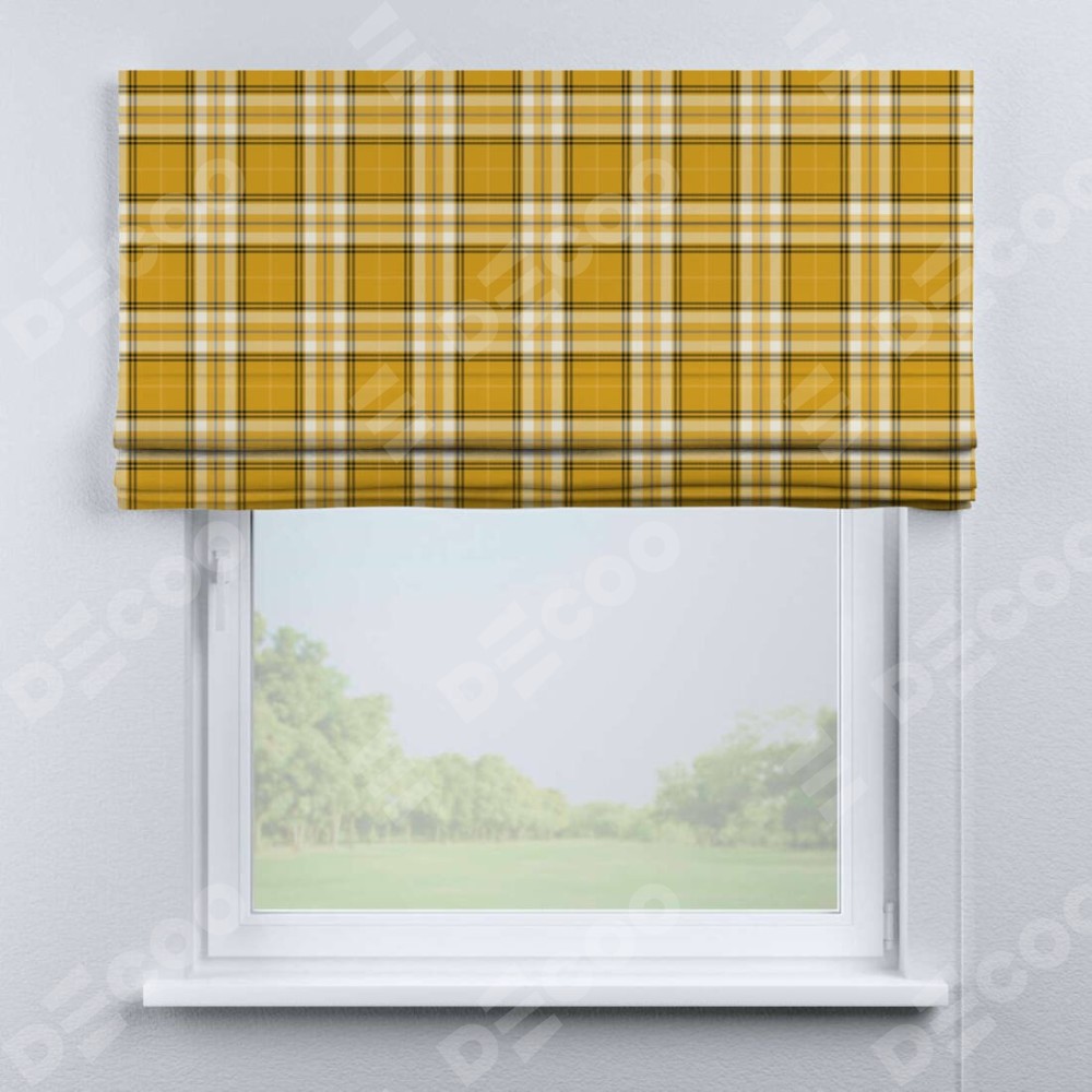 Римская штора производителя «Cortin», используется для проёма, пошита из ткани блэкаут с нанесением сублимационной печати «Желто-горчичная клетка». Имеет универсальный механизм и подходит для монтажа: на потолок, на стену и в нишу.